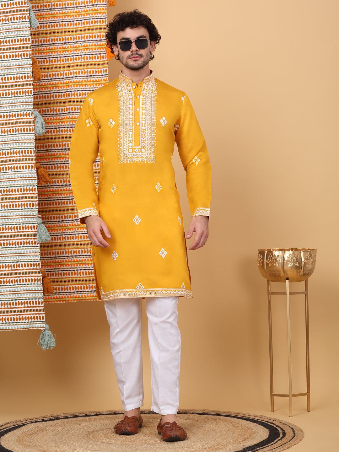 KRAFT INDIA Men's Cotton Embroidered Chevron Cream Gold Pathani Kurta With White Salwar Set