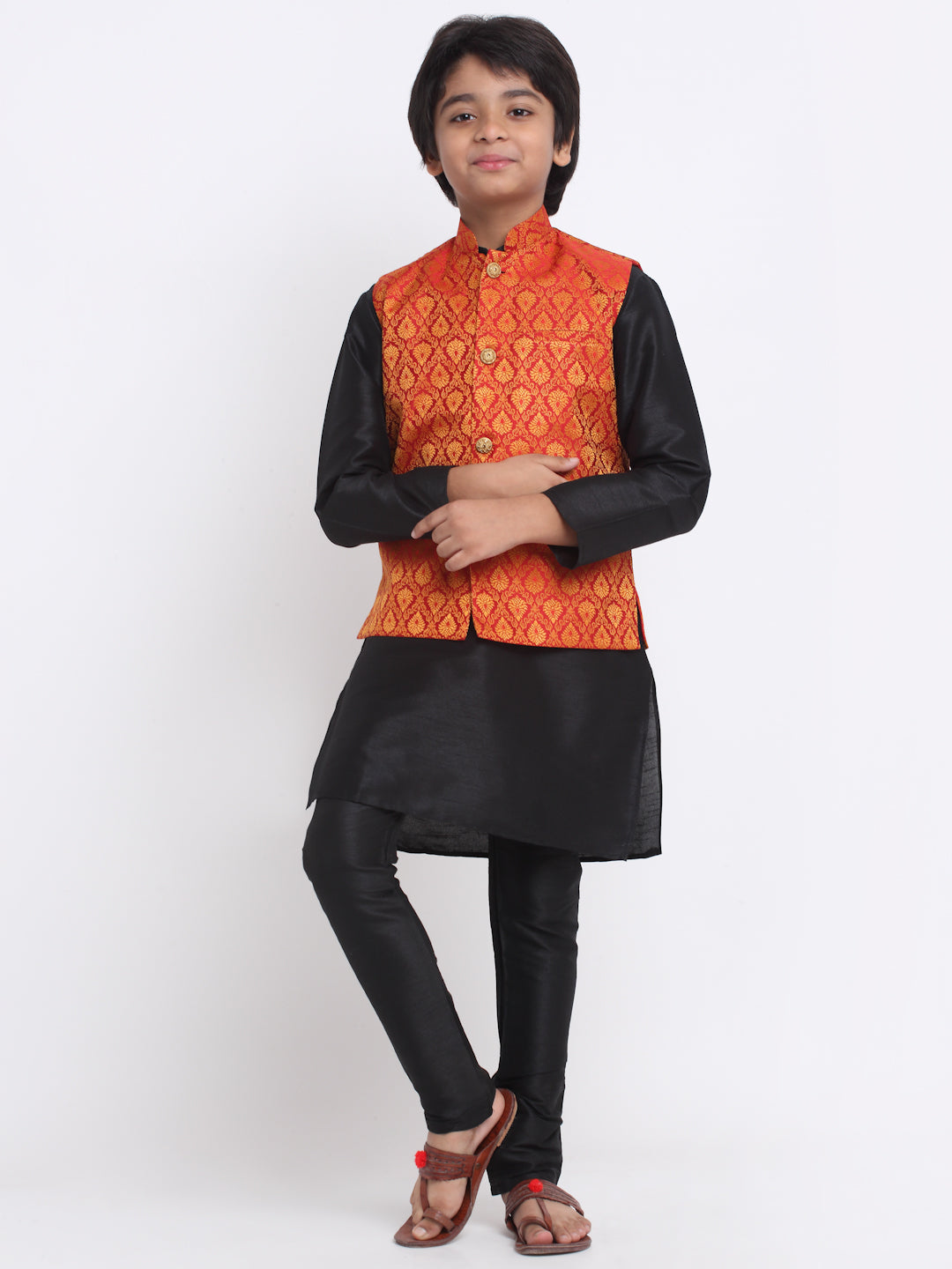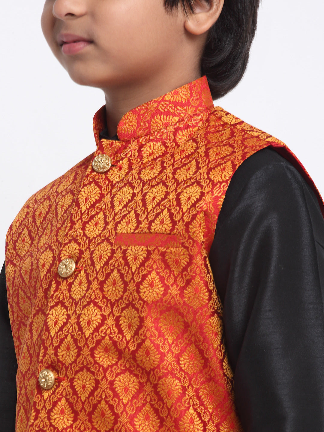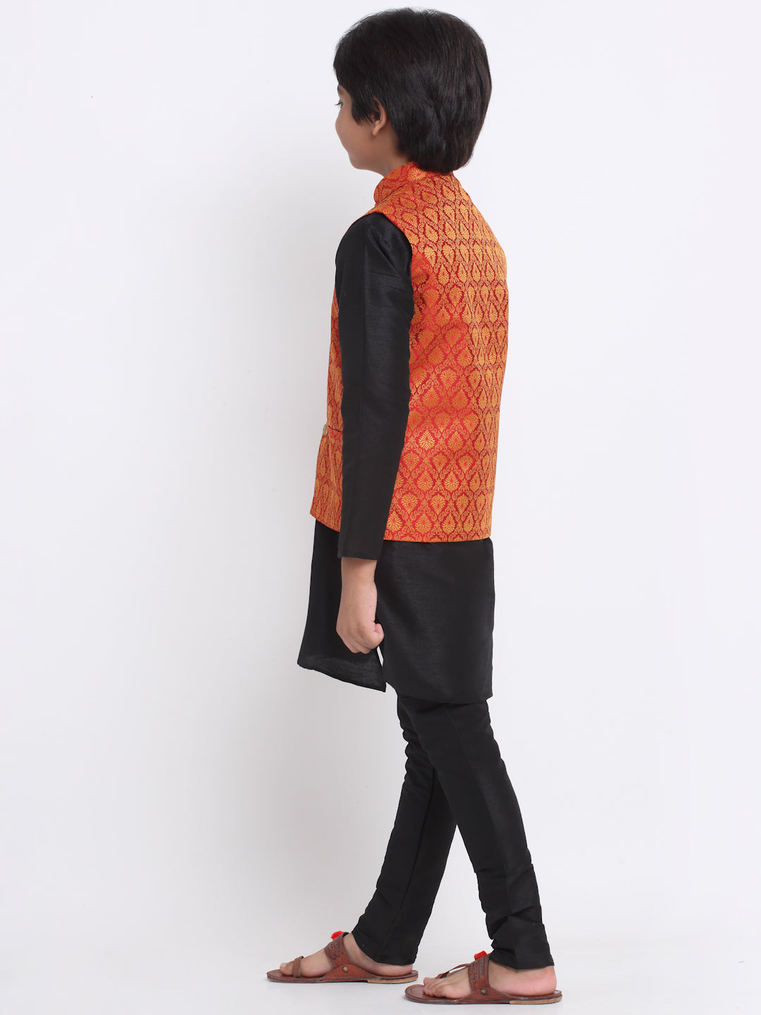 KRAFT INDIA Boy's Black Silk Blend Kurta and Churidar with Jacquard Red Nehru Jacket