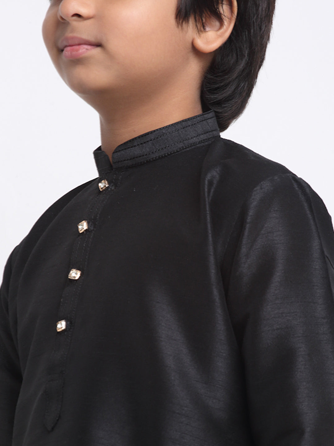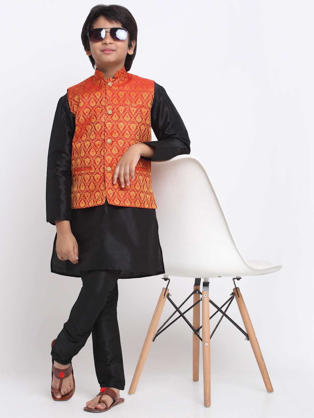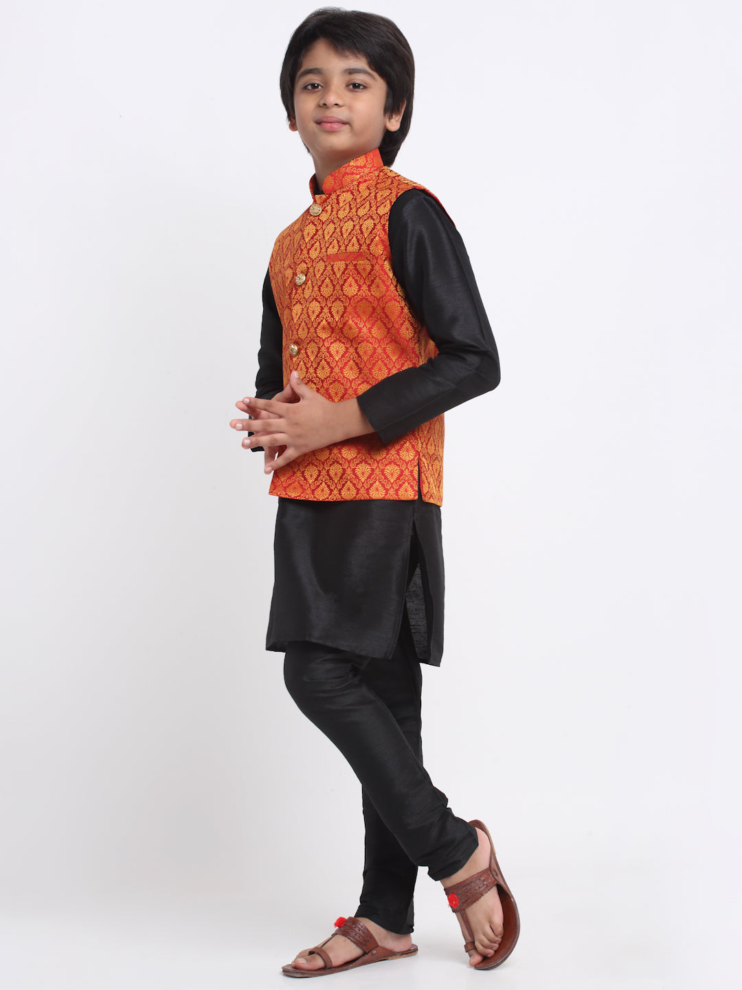 KRAFT INDIA Boy's Black Silk Blend Kurta and Churidar with Jacquard Red Nehru Jacket