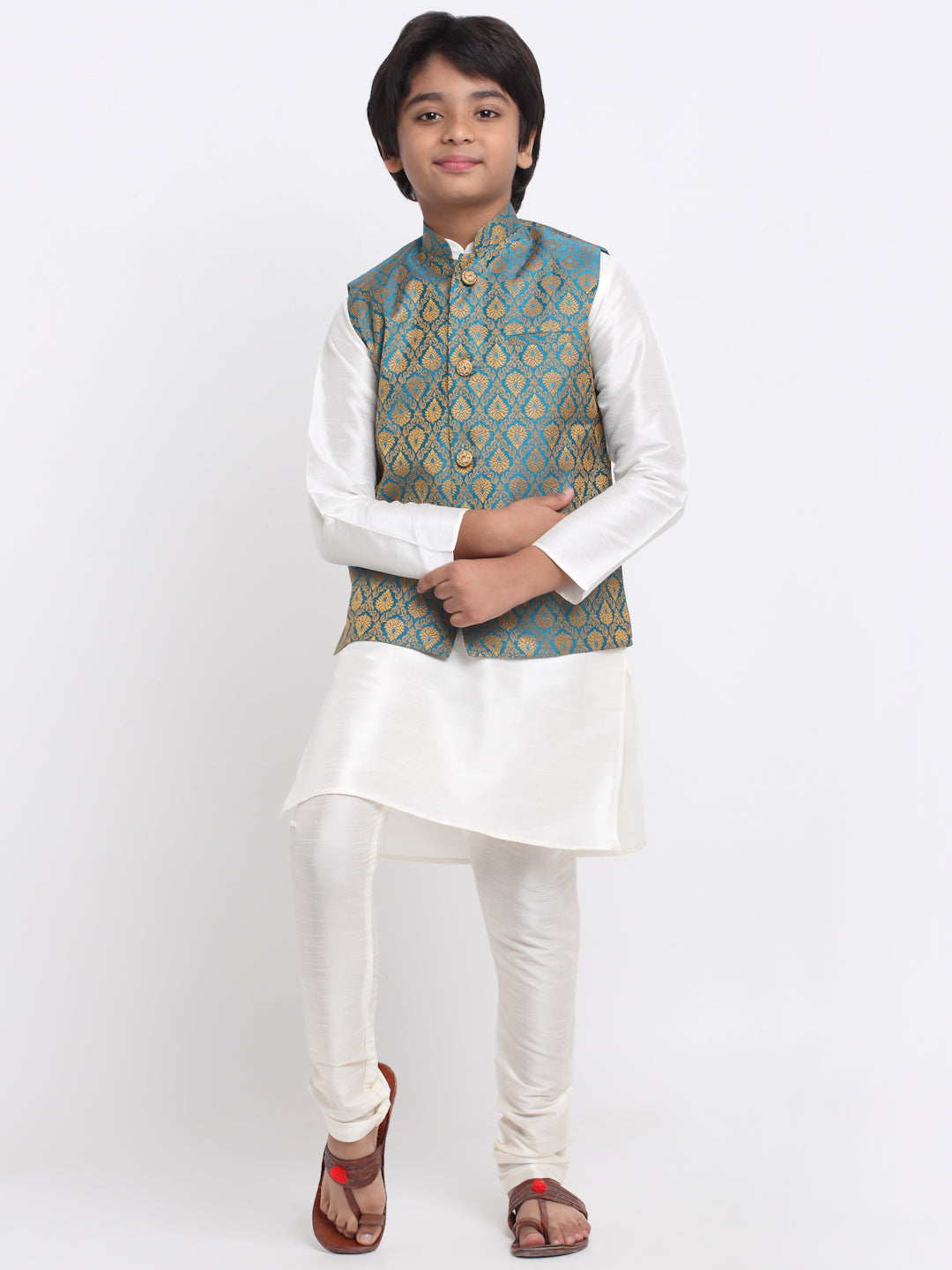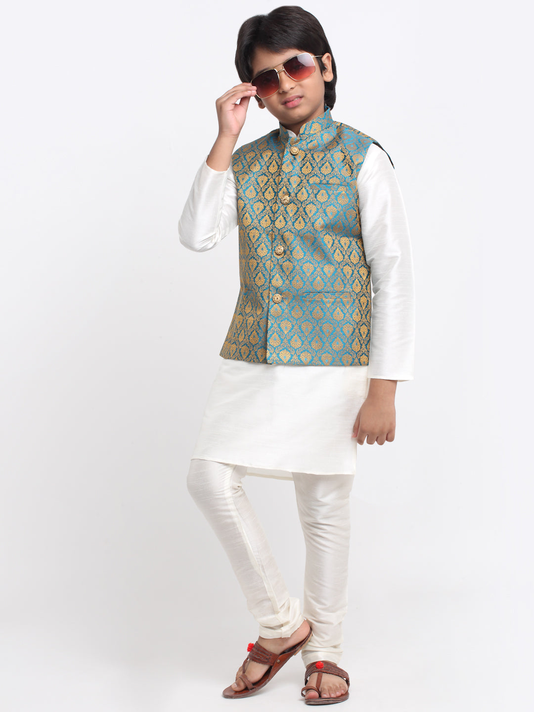 KRAFT INDIA Boy's Cream Silk Blend Kurta and Churidar with Jacquard Blue Nehru Jacket