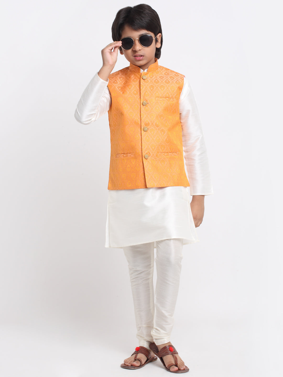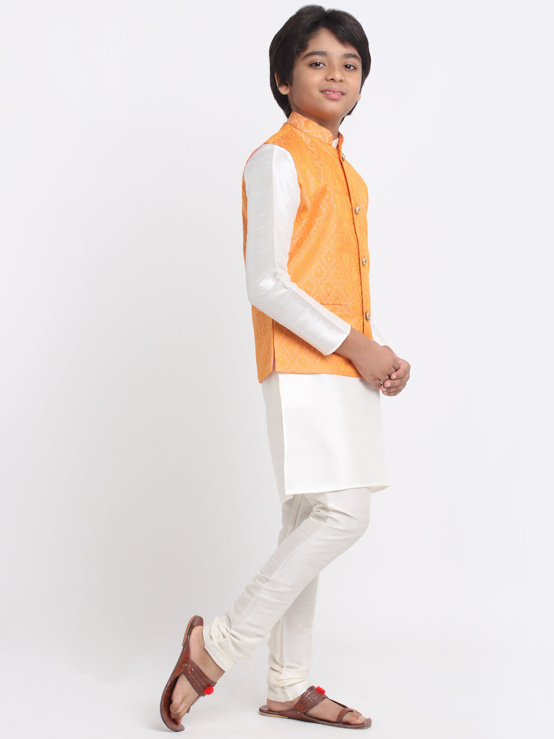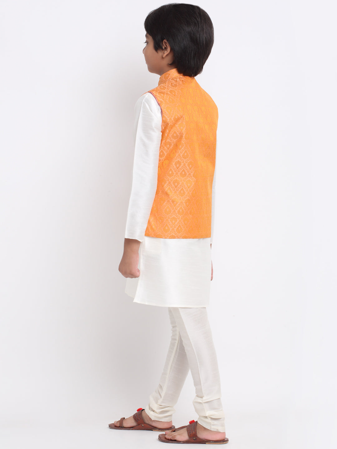 KRAFT INDIA Boy's Cream Silk Blend Kurta and Churidar with Jacquard Peach Nehru Jacket