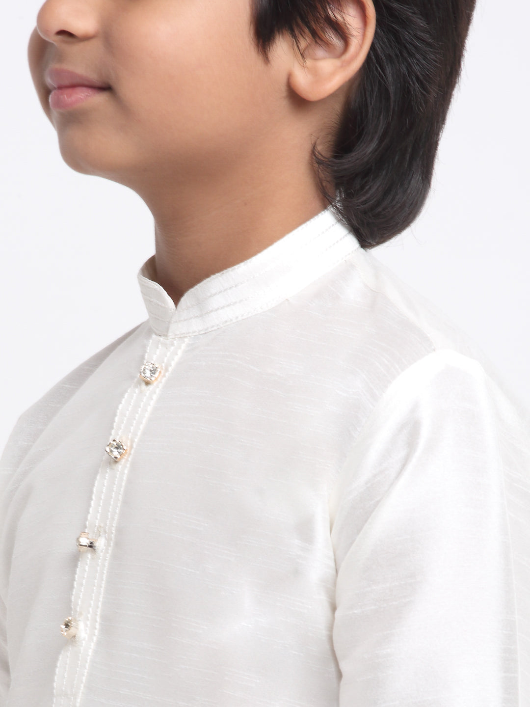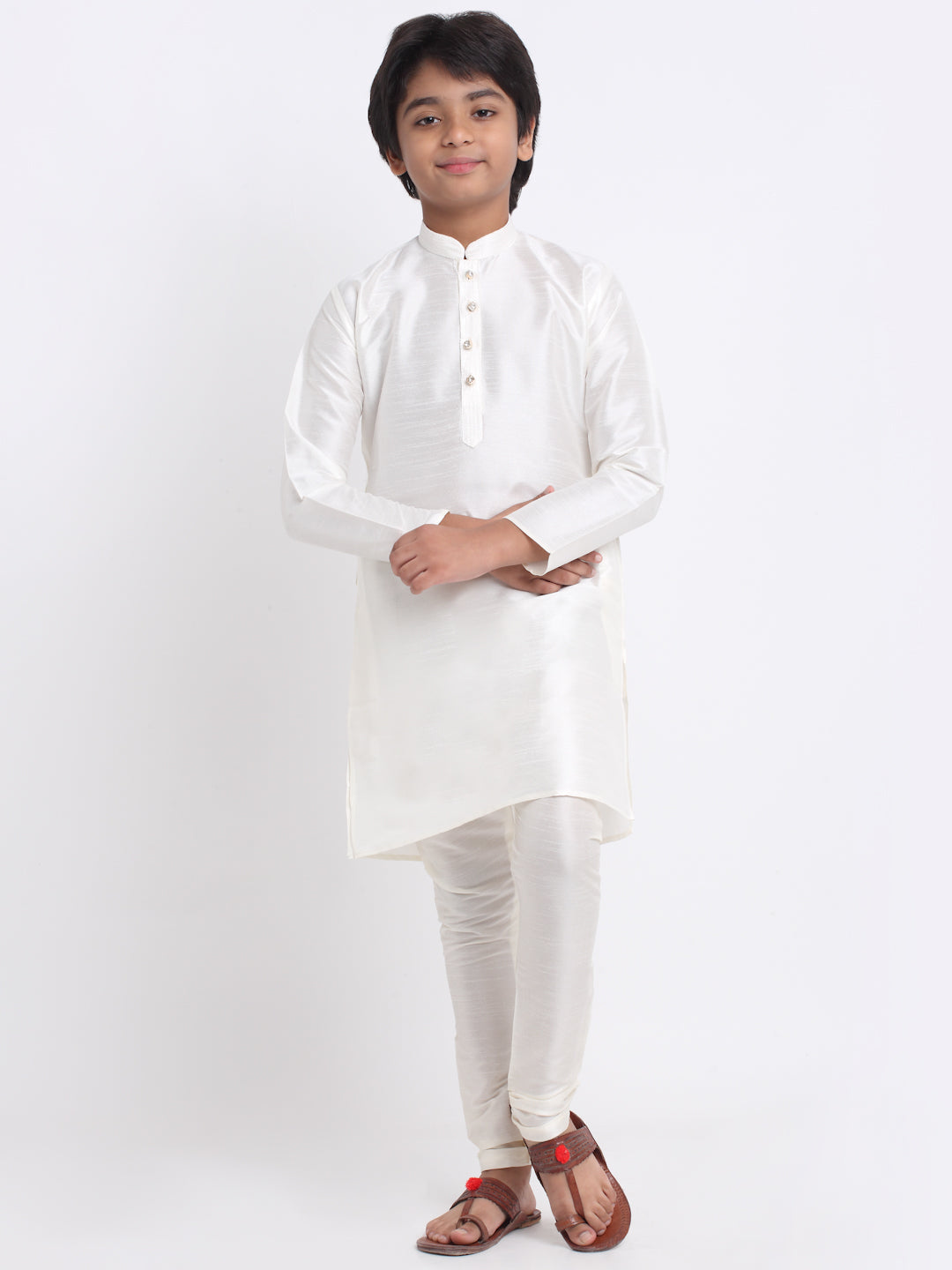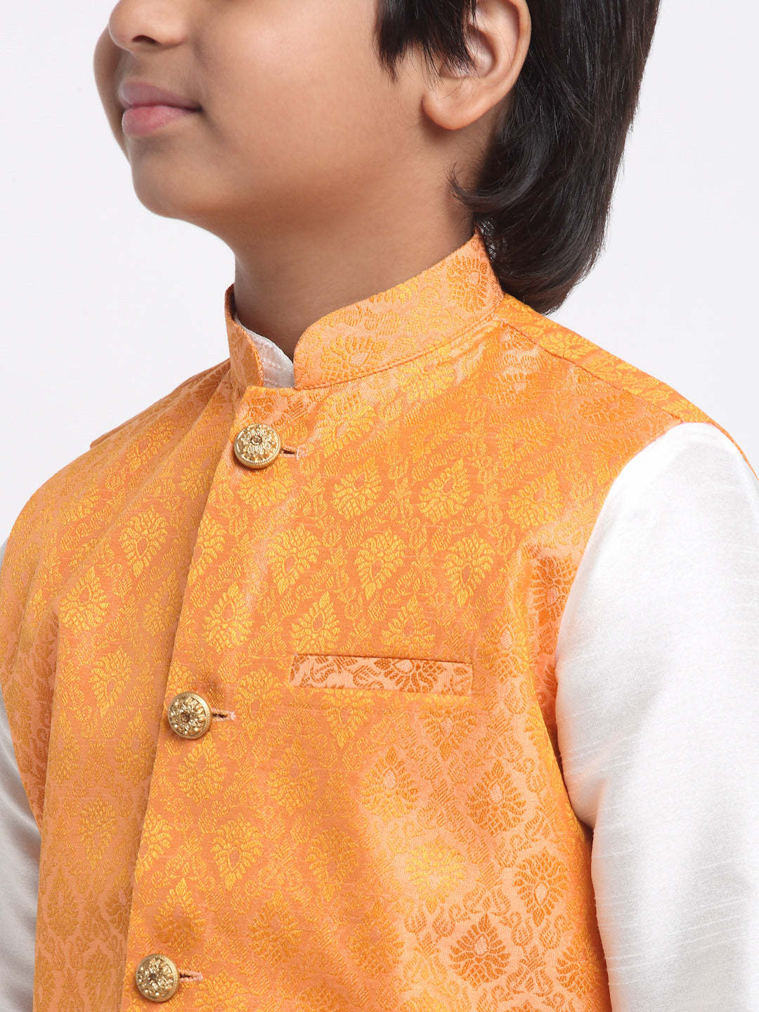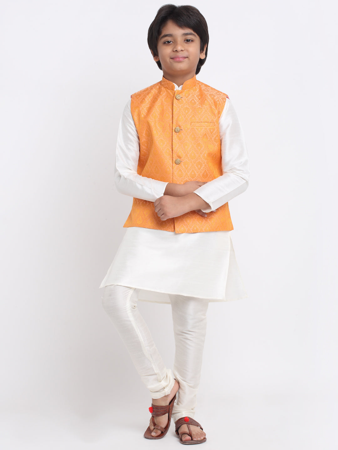 KRAFT INDIA Boy's Cream Silk Blend Kurta and Churidar with Jacquard Peach Nehru Jacket