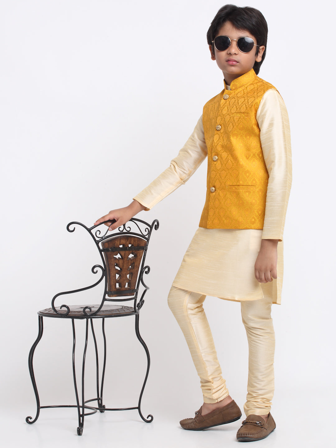 KRAFT INDIA Boy's Fawn Silk Blend Kurta and Churidar with Jacquard Yellow Nehru Jacket