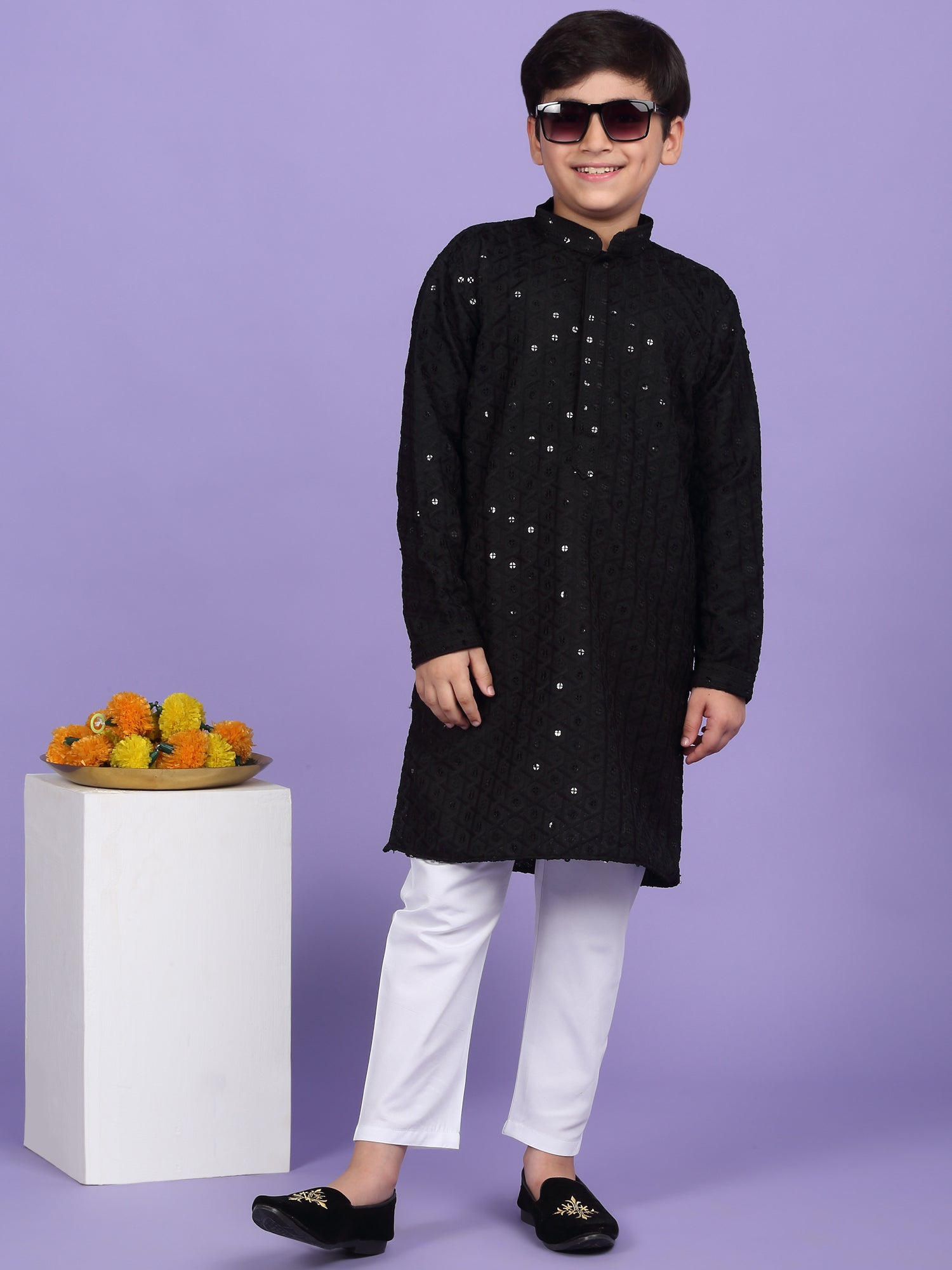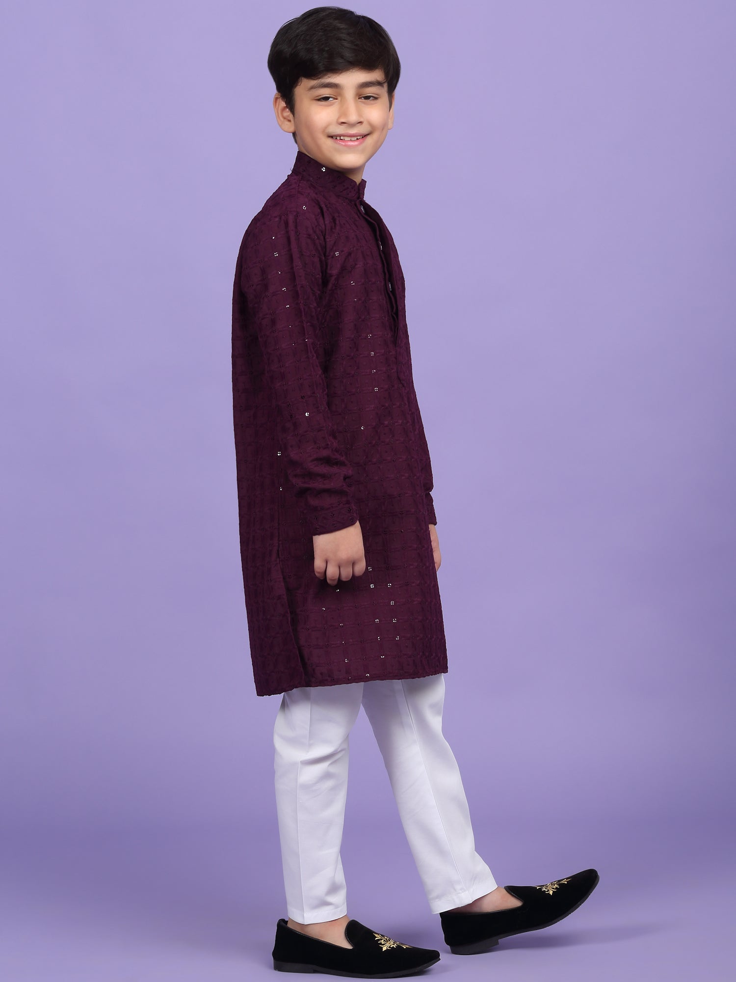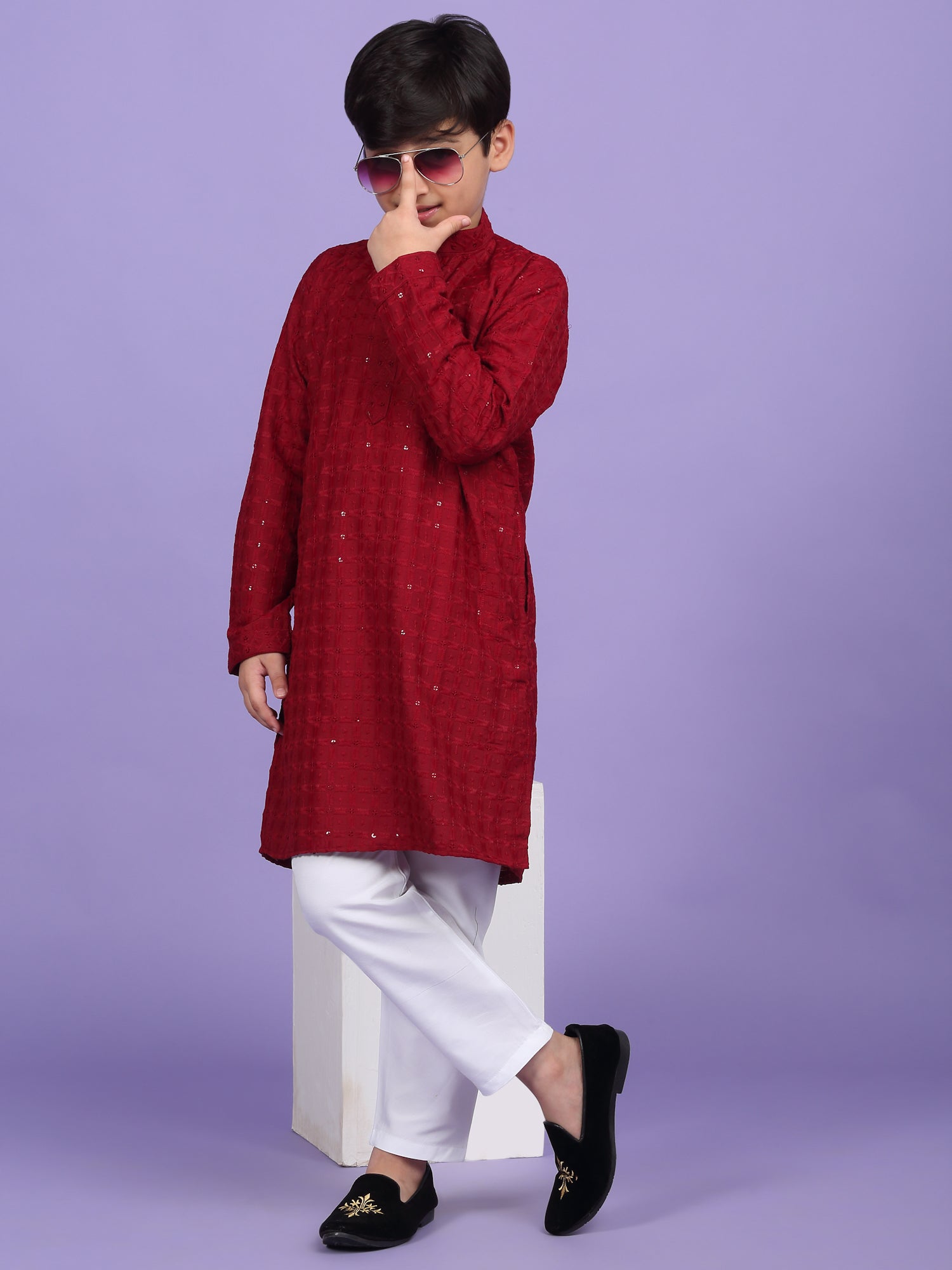 Add a graceful touch to your child’s ethnic wardrobe with this Kids Cotton Blend Chikan Embroidered Sequined Kurta. Crafted from a breathable cotton blend fabric, this kurta showcases elegant Chikan embroidery beautifully highlighted with subtle sequin detailing, giving it a festive sparkle. Featuring a Mandarin collar, long sleeves, and a straight hemline, it blends traditional style with all-day comfort. Perfect for weddings, festivals, and cultural events, this kurta is ideal for pairing with white pyjamas or churidars.