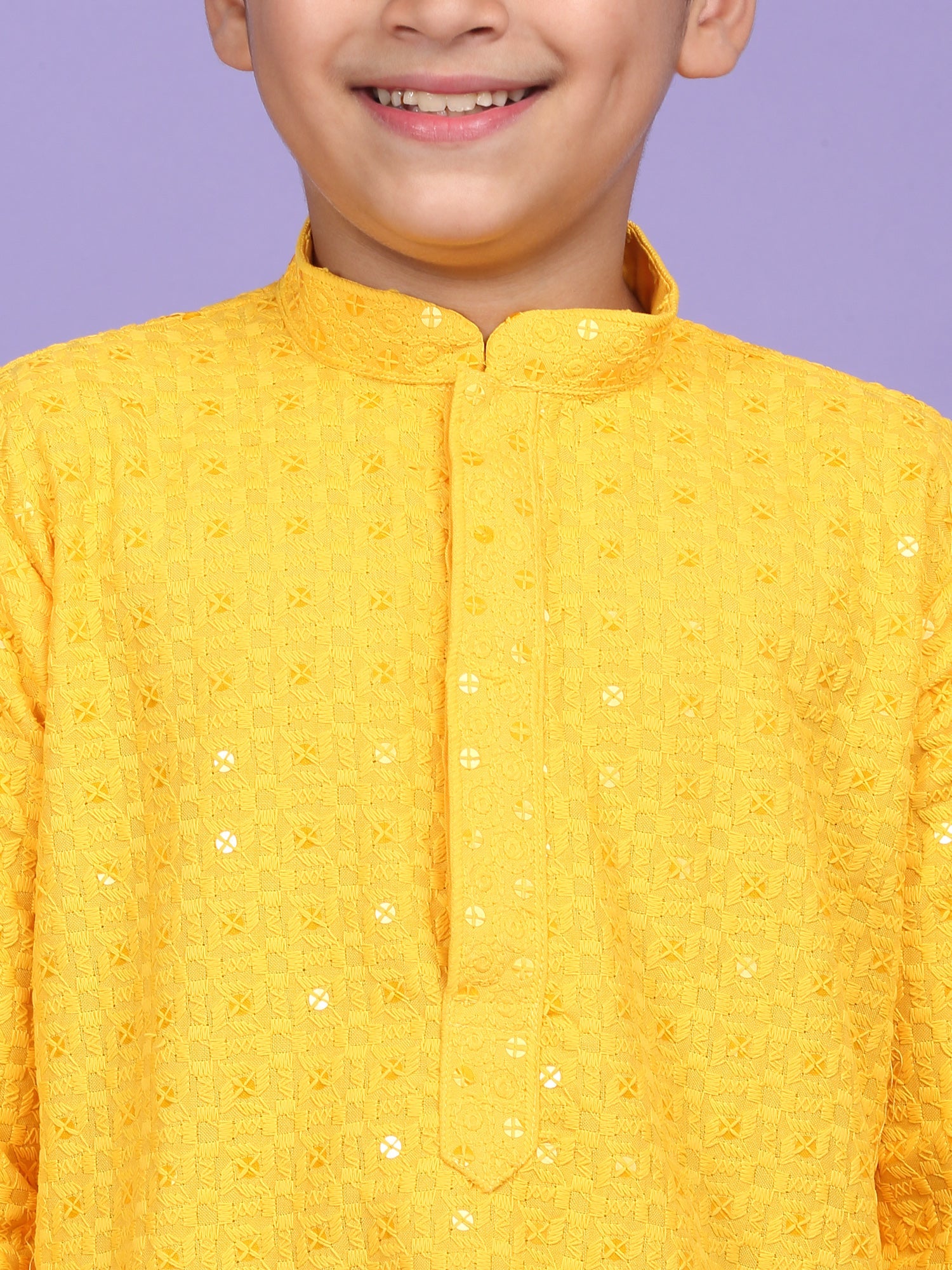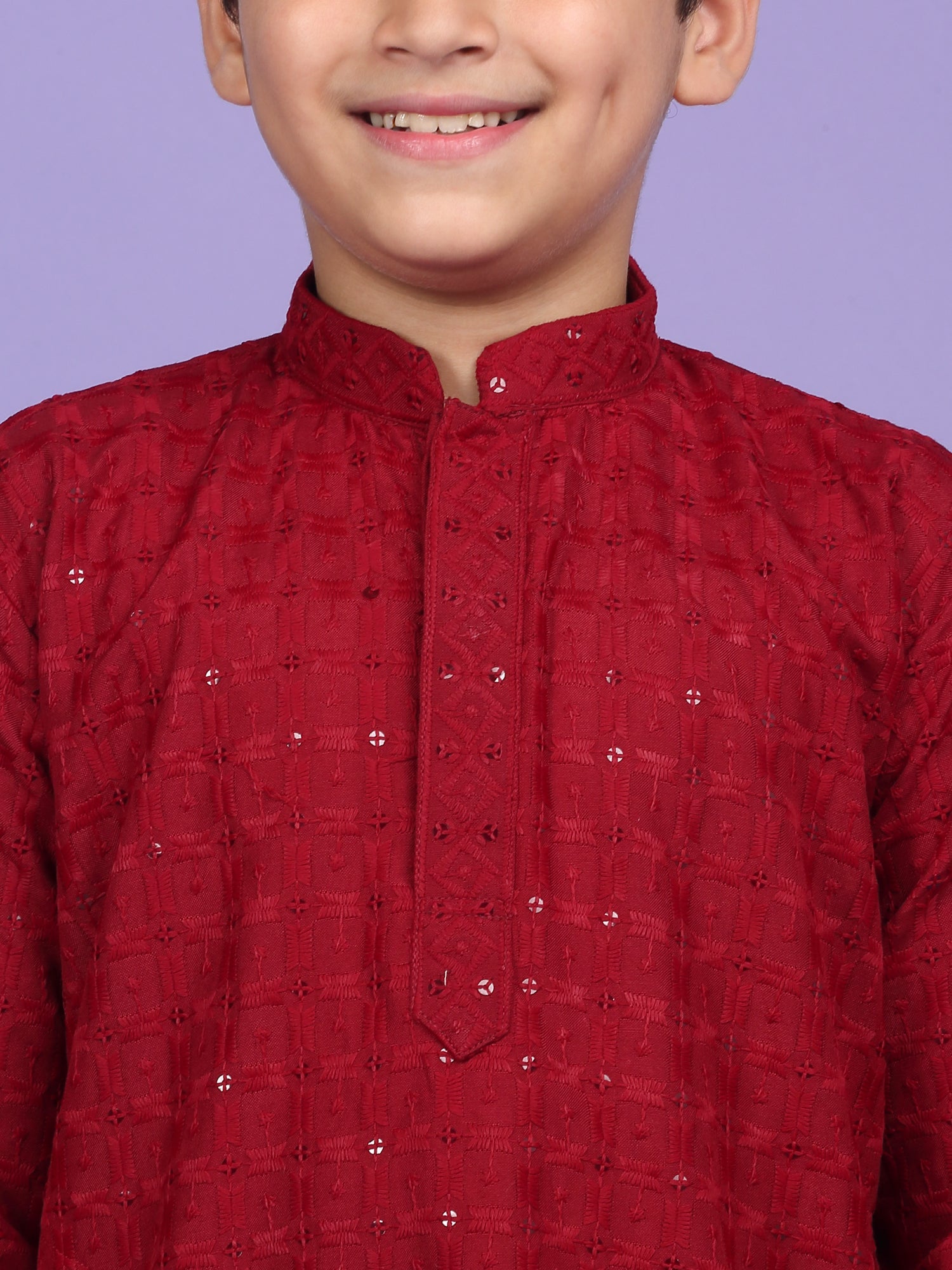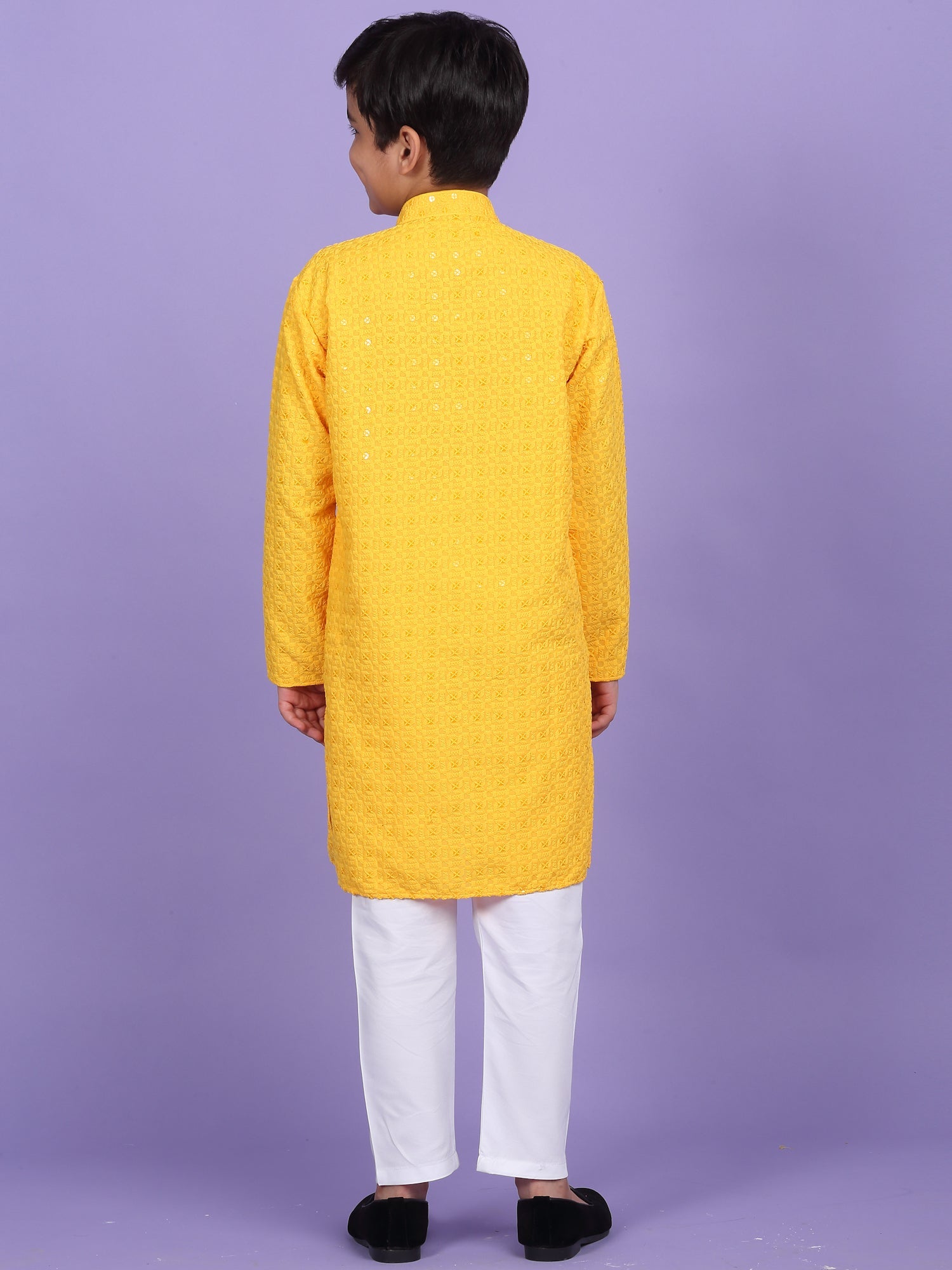Add a graceful touch to your child’s ethnic wardrobe with this Kids Cotton Blend Chikan Embroidered Sequined Kurta. Crafted from a breathable cotton blend fabric, this kurta showcases elegant Chikan embroidery beautifully highlighted with subtle sequin detailing, giving it a festive sparkle. Featuring a Mandarin collar, long sleeves, and a straight hemline, it blends traditional style with all-day comfort. Perfect for weddings, festivals, and cultural events, this kurta is ideal for pairing with white pyjamas or churidars.