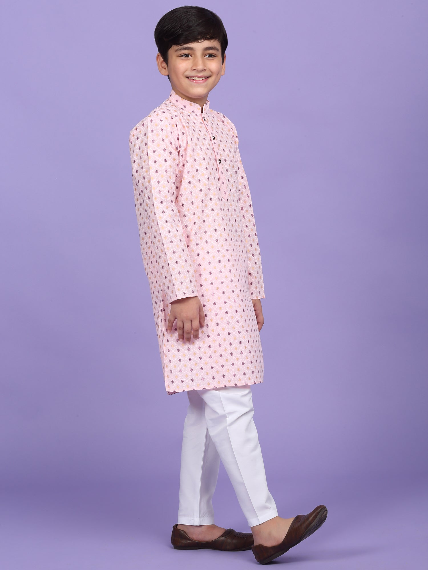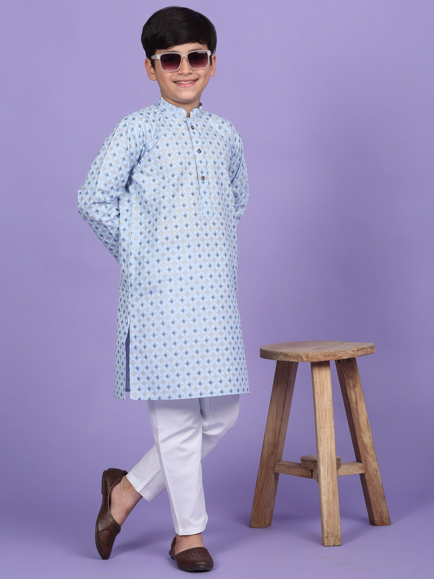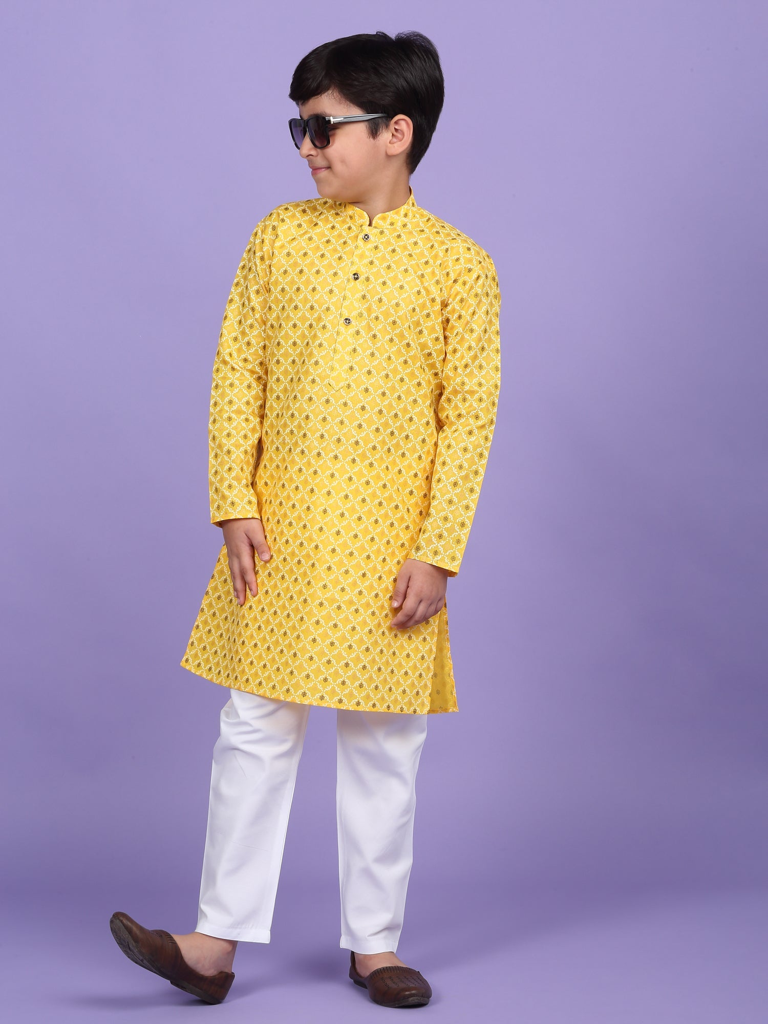 Bring vibrant charm to your child’s festive attire with this stylish Kids Cotton Blend Floral Printed Kurta. Made from soft and breathable cotton blend fabric, this kurta features a beautiful all-over floral print that adds a cheerful, ethnic vibe. Designed with a Mandarin collar, long sleeves, and a straight hem, it offers both comfort and cultural flair. Ideal for festivals, school functions, and family gatherings, this kurta can be paired with pyjamas, jeans, or trousers for a complete look.
