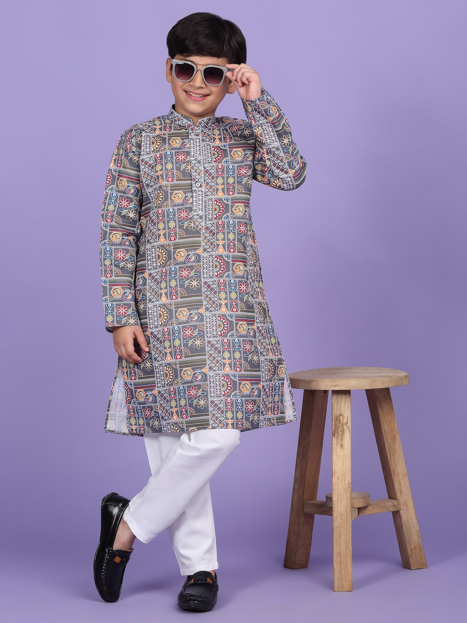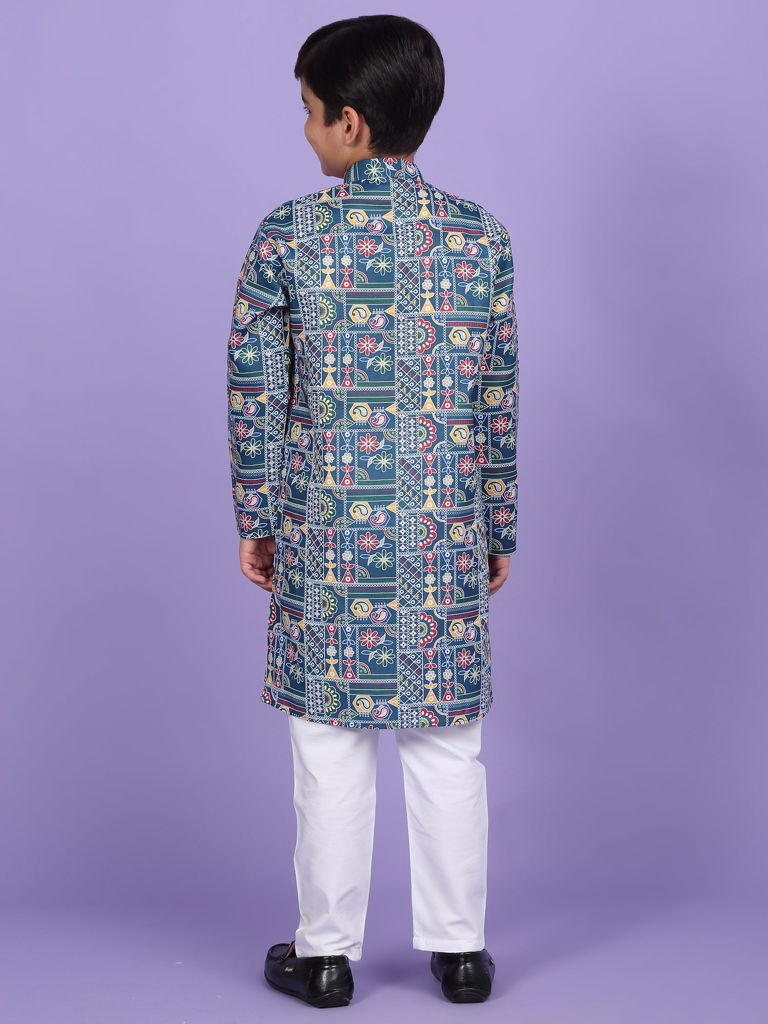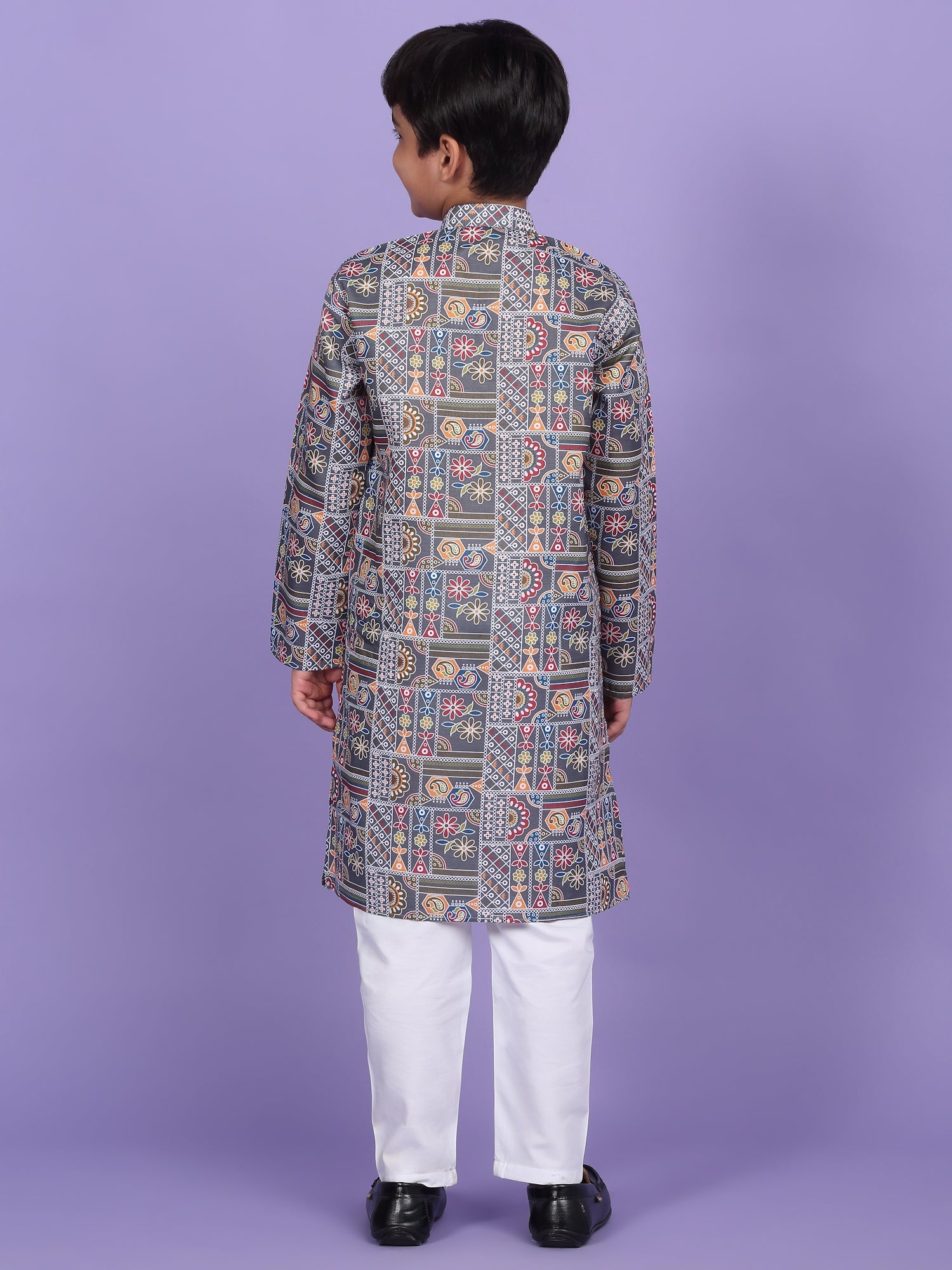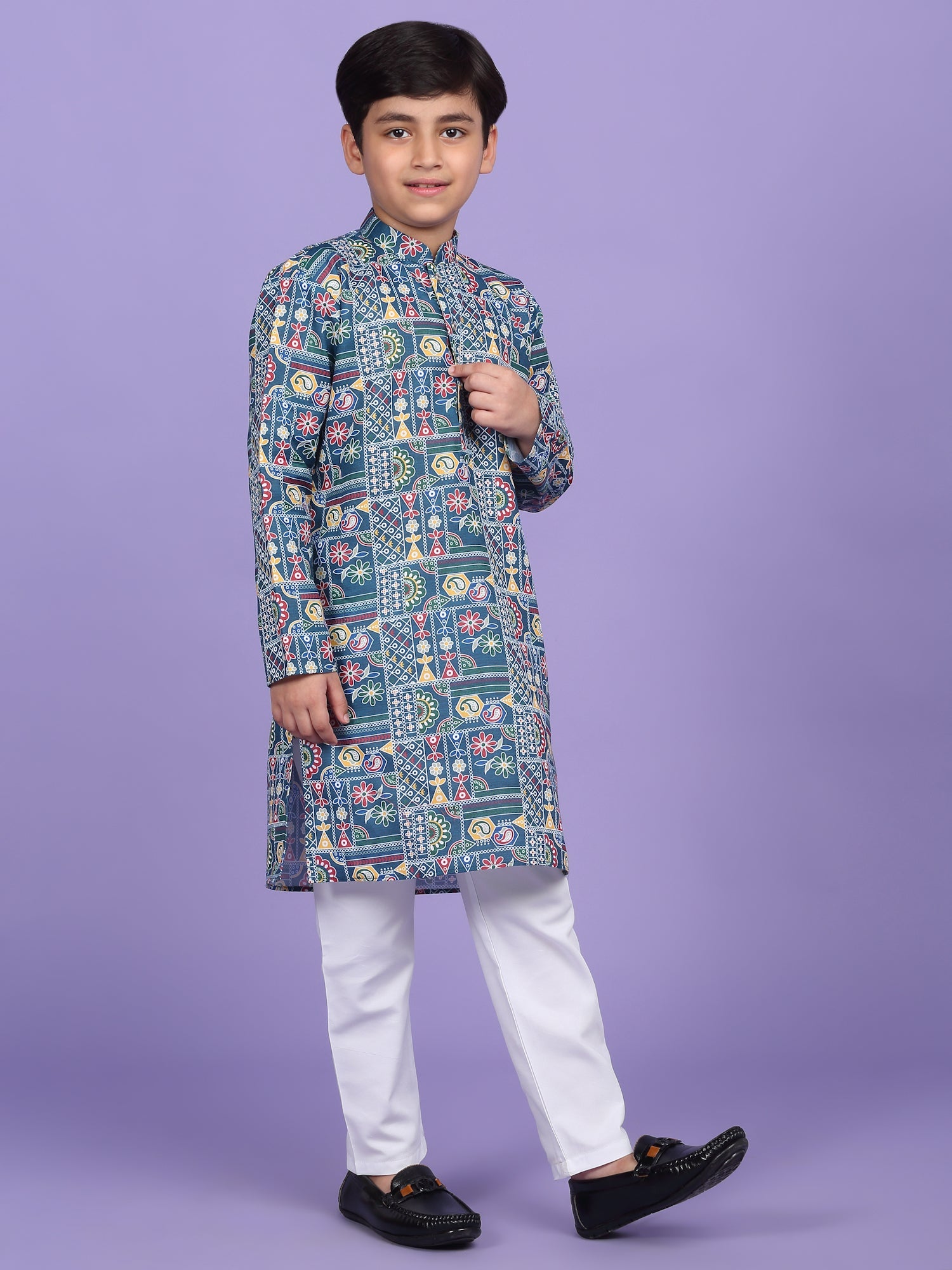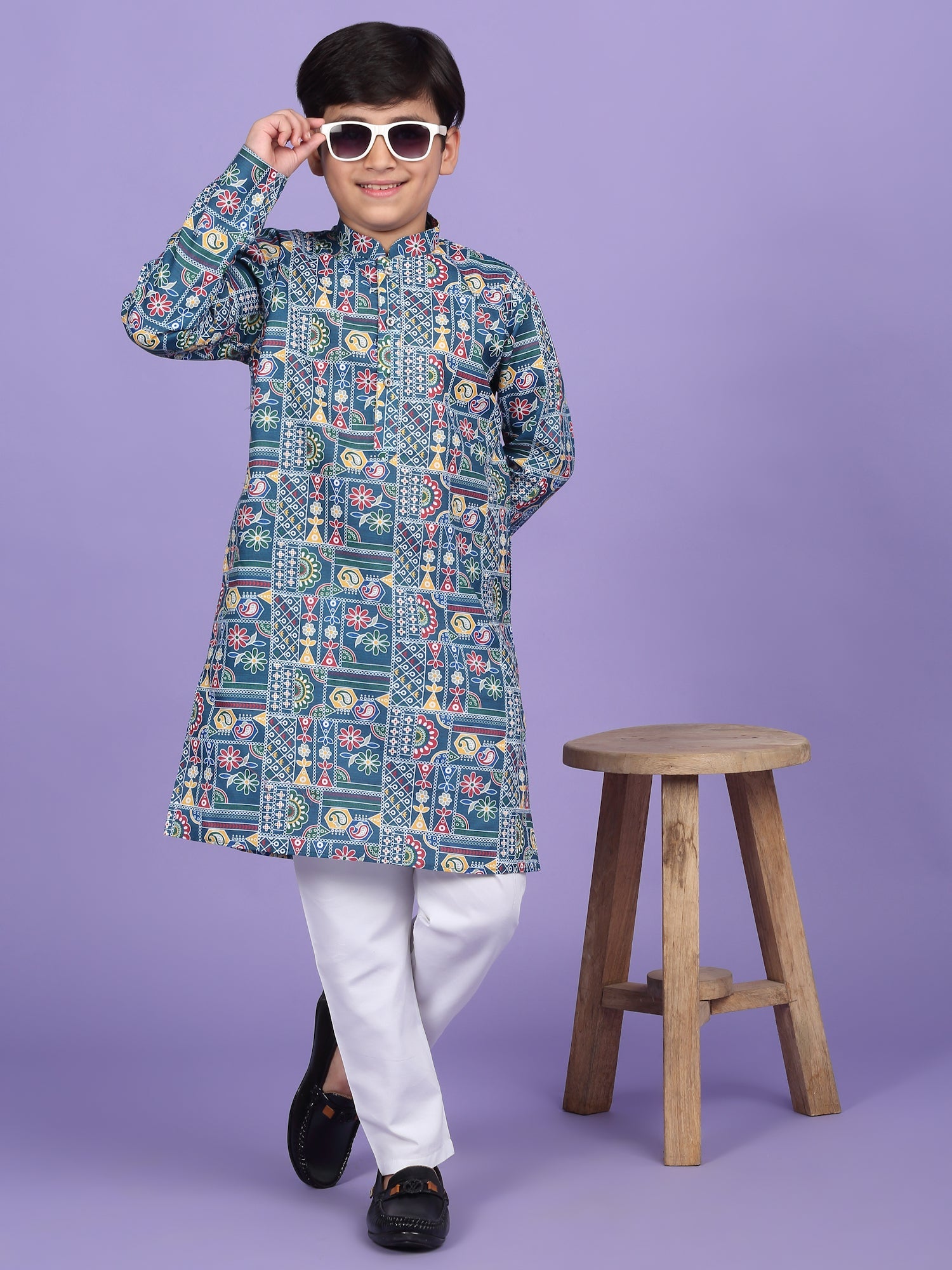 Give your child a smart ethnic upgrade with this Kids Cotton Blend Geometric Printed Kurta. Crafted from a soft and breathable cotton blend, this kurta features a trendy geometric print that adds a modern touch to traditional style. Designed with a Mandarin collar, long sleeves, and a straight hem, it offers both comfort and contemporary charm. Ideal for festive events, school celebrations, or casual family gatherings, this kurta pairs perfectly with white pyjamas, jeans, or trousers.