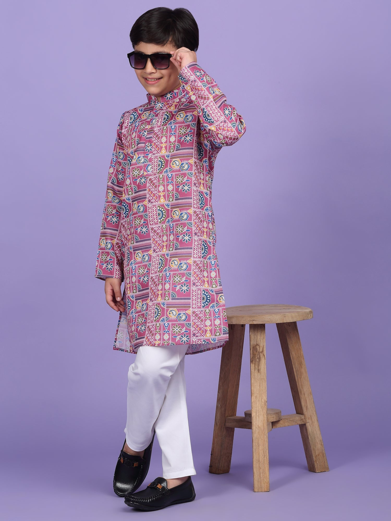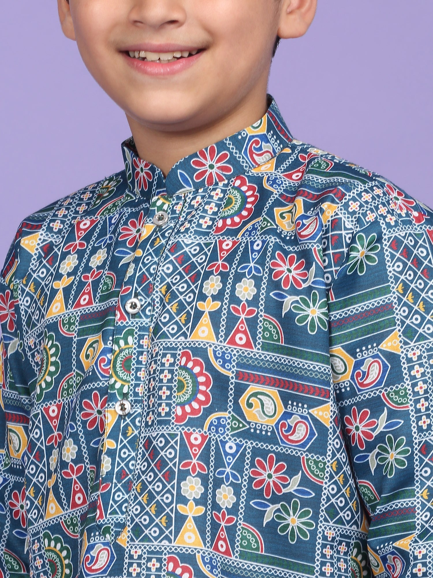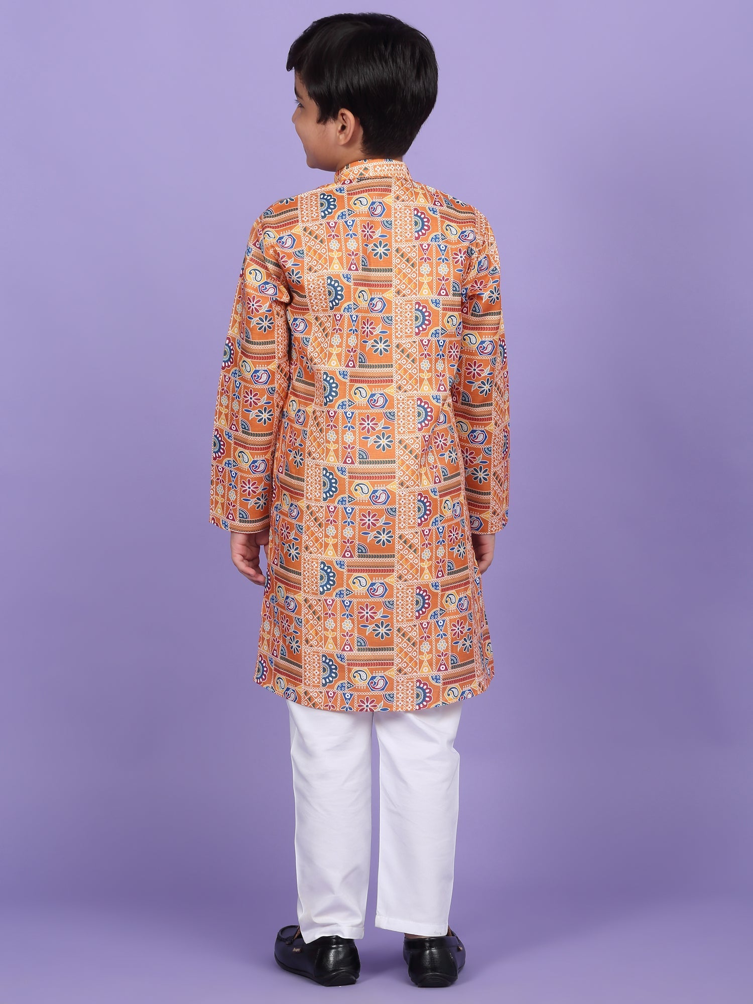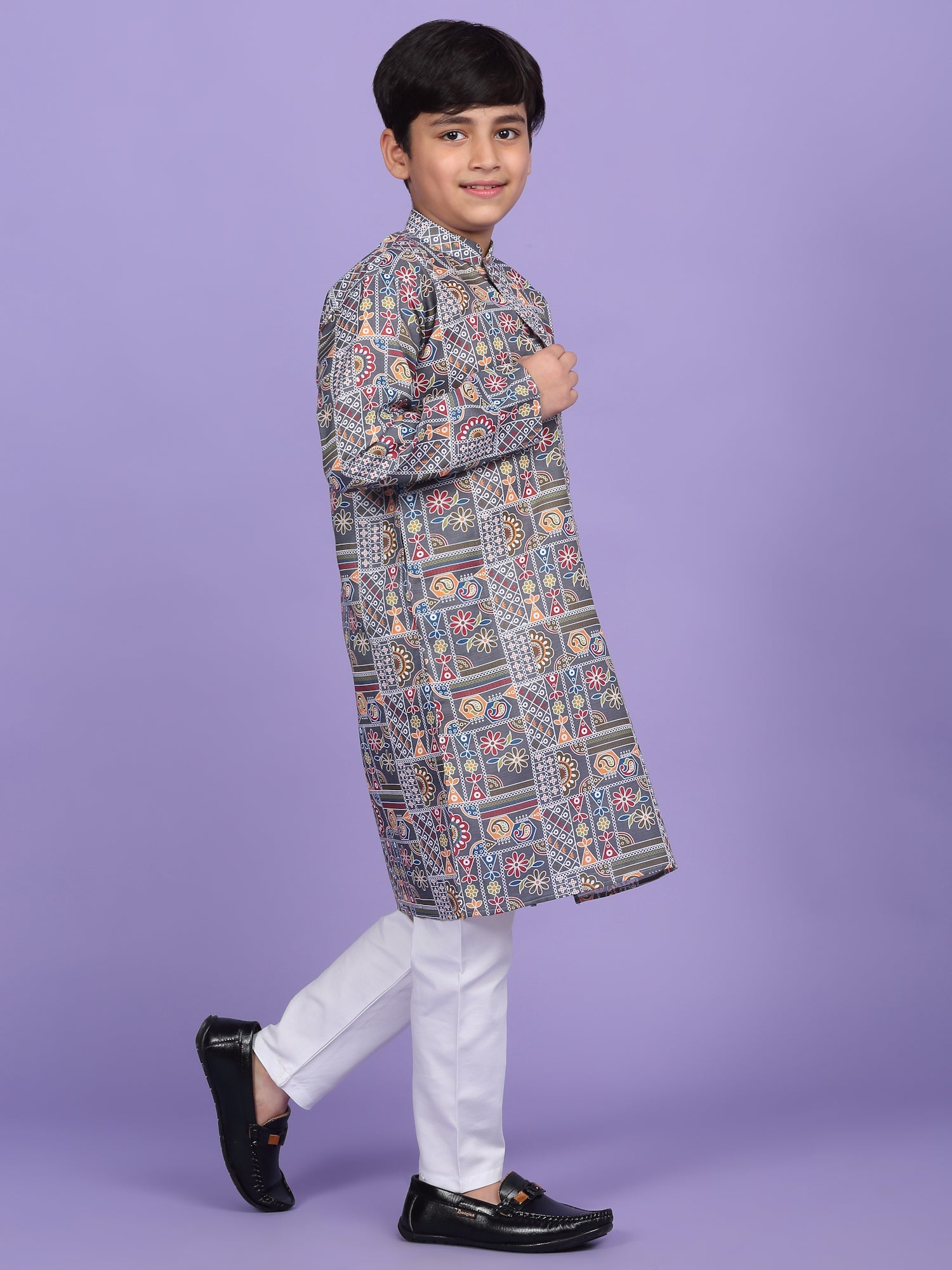 Give your child a smart ethnic upgrade with this Kids Cotton Blend Geometric Printed Kurta. Crafted from a soft and breathable cotton blend, this kurta features a trendy geometric print that adds a modern touch to traditional style. Designed with a Mandarin collar, long sleeves, and a straight hem, it offers both comfort and contemporary charm. Ideal for festive events, school celebrations, or casual family gatherings, this kurta pairs perfectly with white pyjamas, jeans, or trousers.