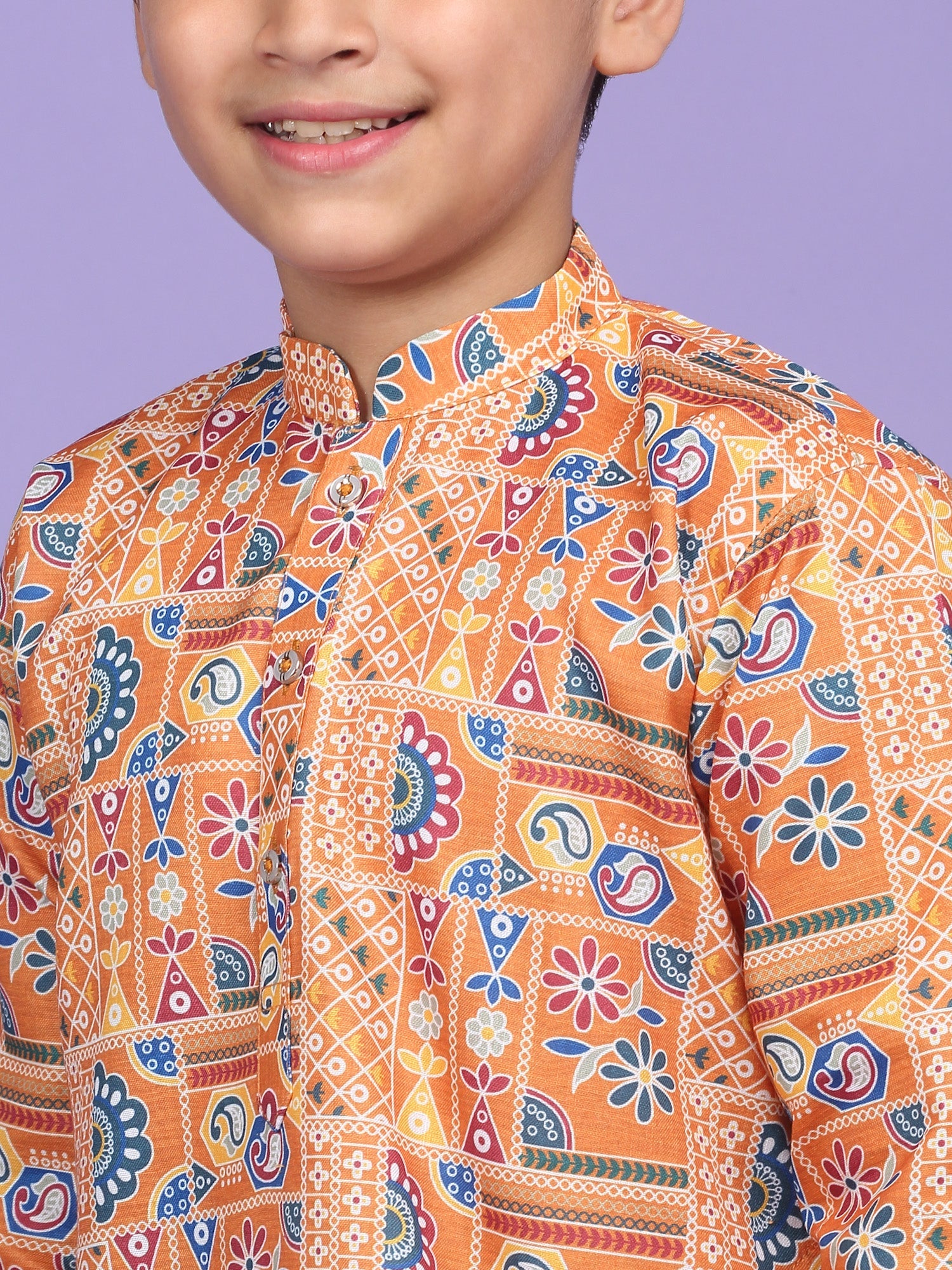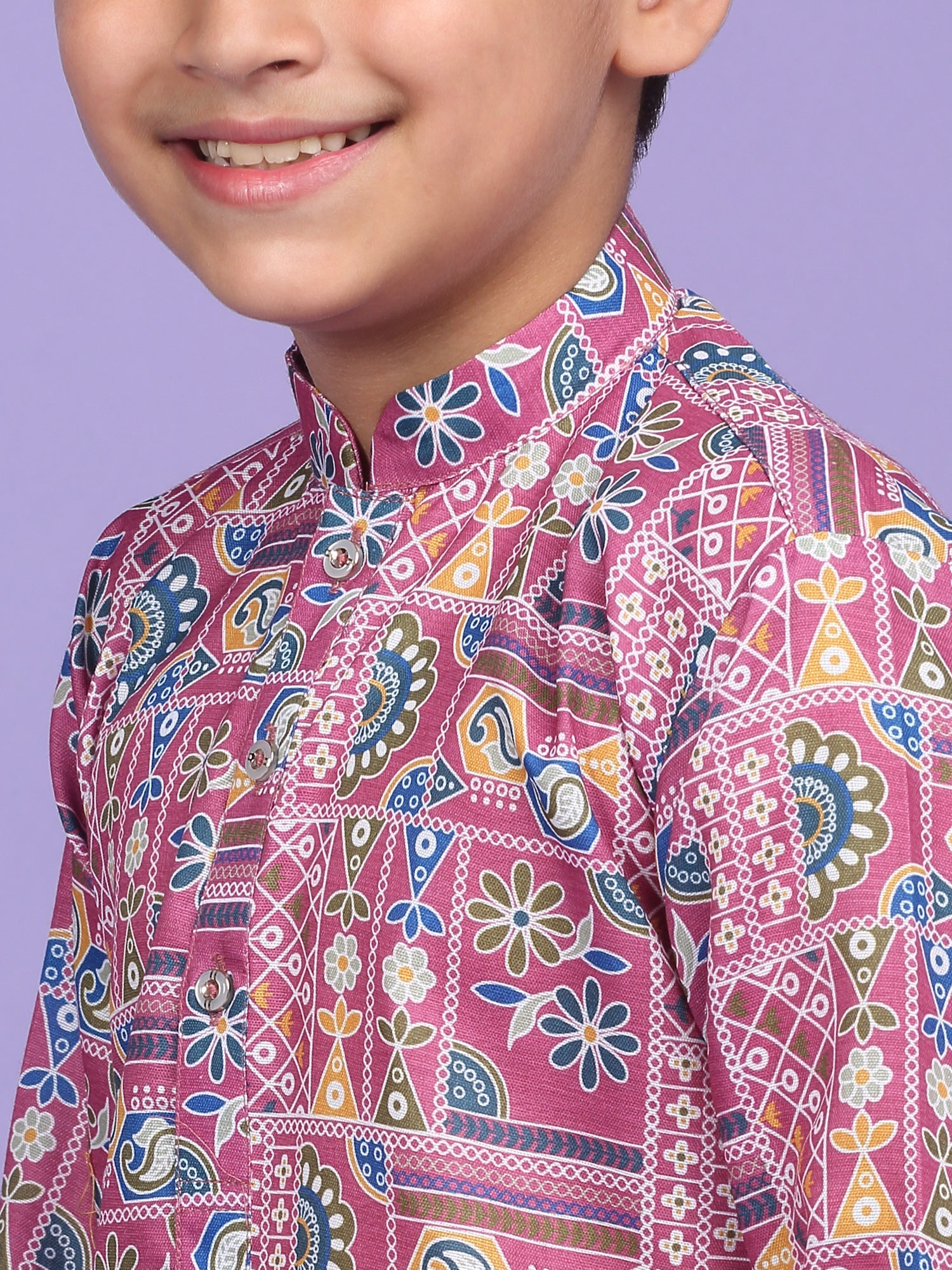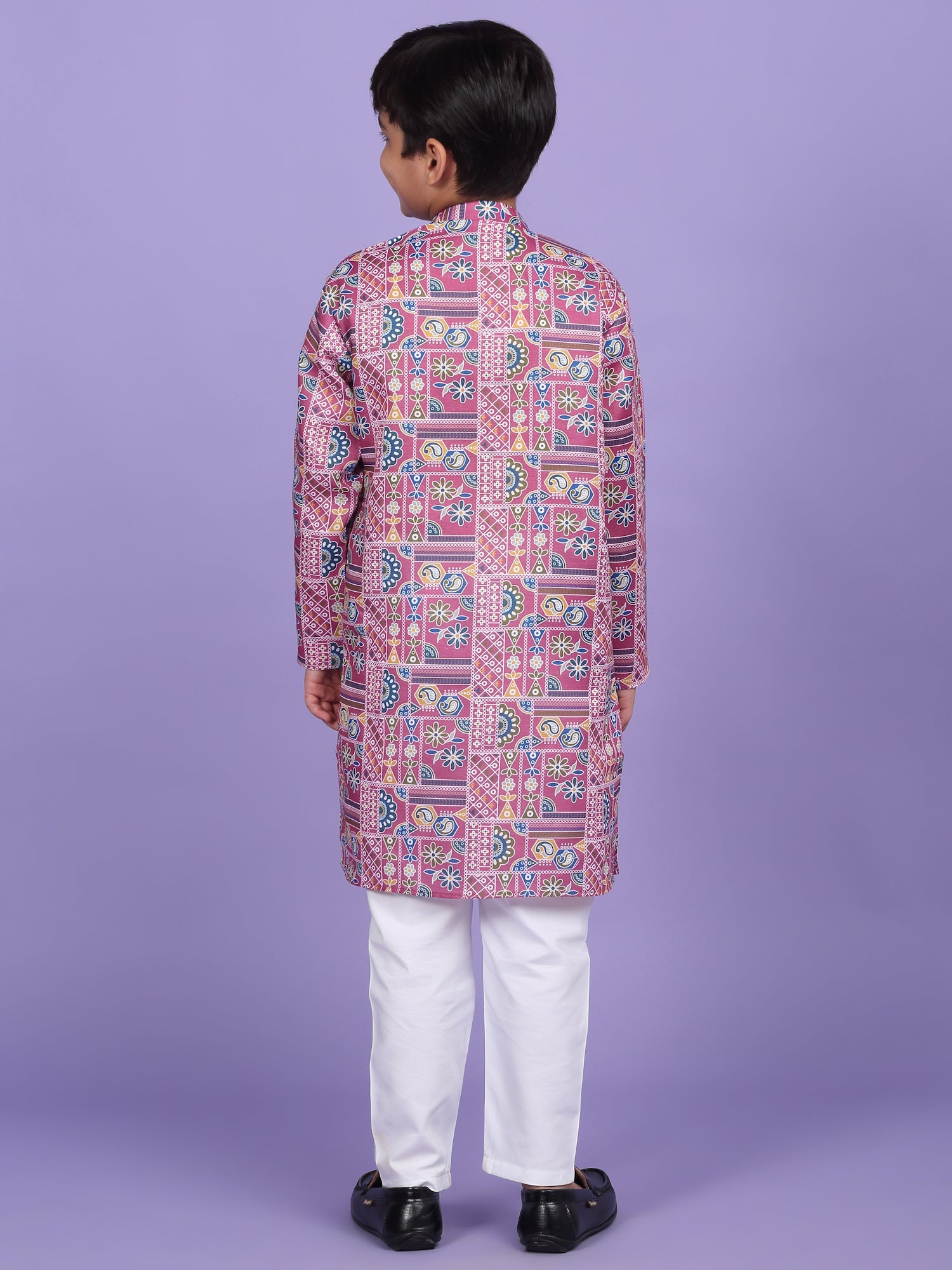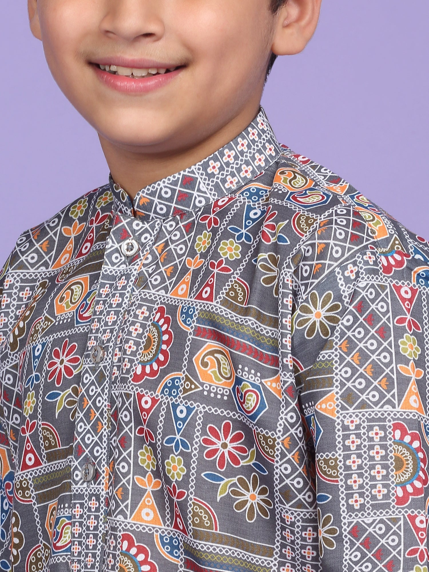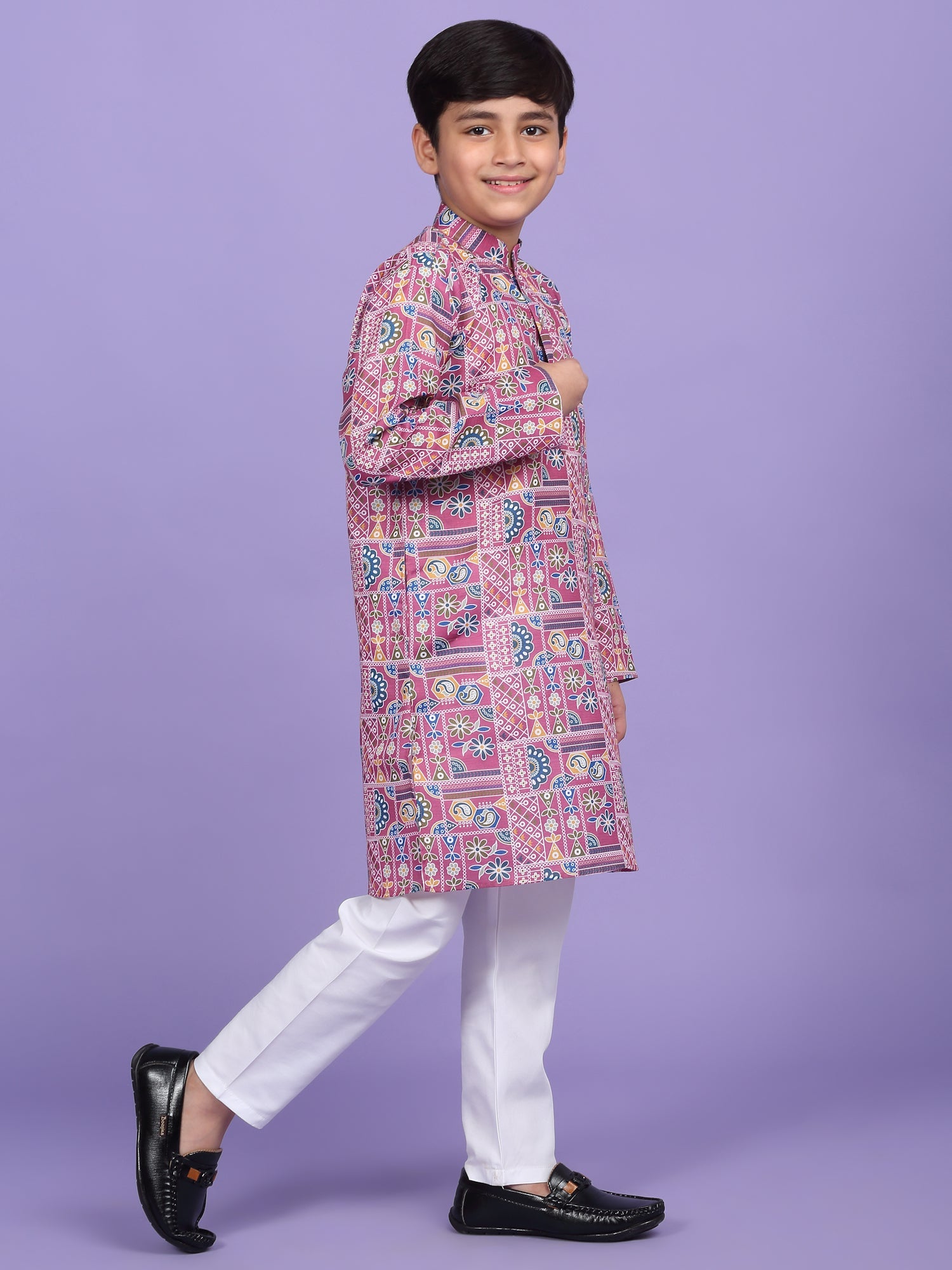 Give your child a smart ethnic upgrade with this Kids Cotton Blend Geometric Printed Kurta. Crafted from a soft and breathable cotton blend, this kurta features a trendy geometric print that adds a modern touch to traditional style. Designed with a Mandarin collar, long sleeves, and a straight hem, it offers both comfort and contemporary charm. Ideal for festive events, school celebrations, or casual family gatherings, this kurta pairs perfectly with white pyjamas, jeans, or trousers.