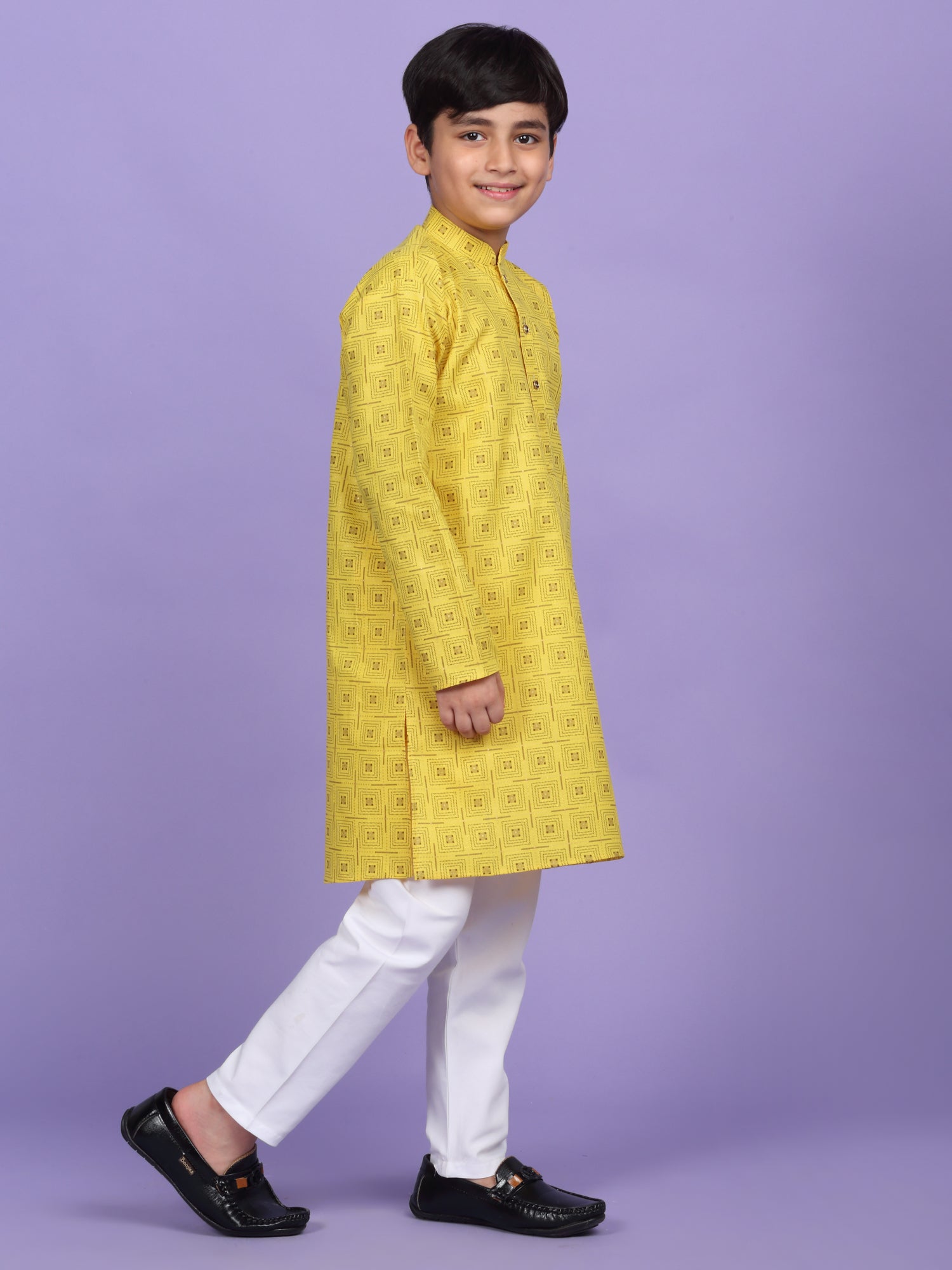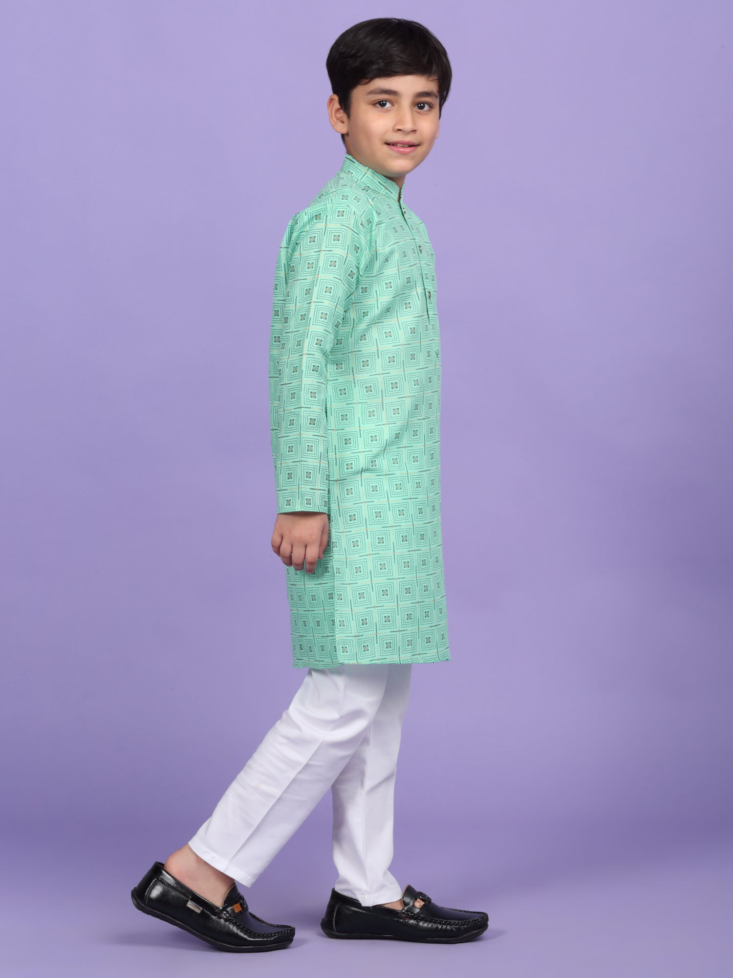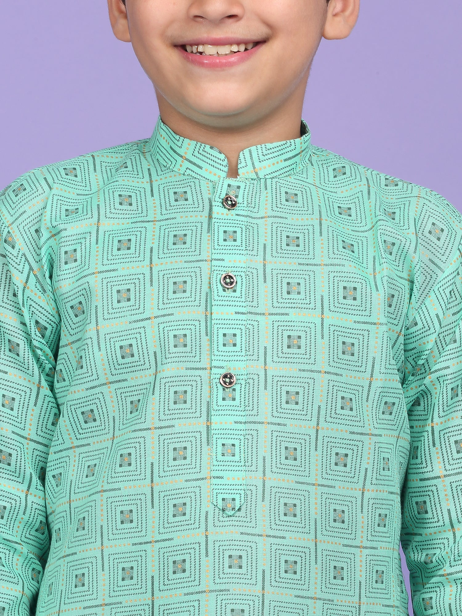 Give your child a smart ethnic upgrade with this Kids Cotton Blend Geometric Printed Kurta. Crafted from a soft and breathable cotton blend, this kurta features a trendy geometric print that adds a modern touch to traditional style. Designed with a Mandarin collar, long sleeves, and a straight hem, it offers both comfort and contemporary charm. Ideal for festive events, school celebrations, or casual family gatherings, this kurta pairs perfectly with white pyjamas, jeans, or trousers.