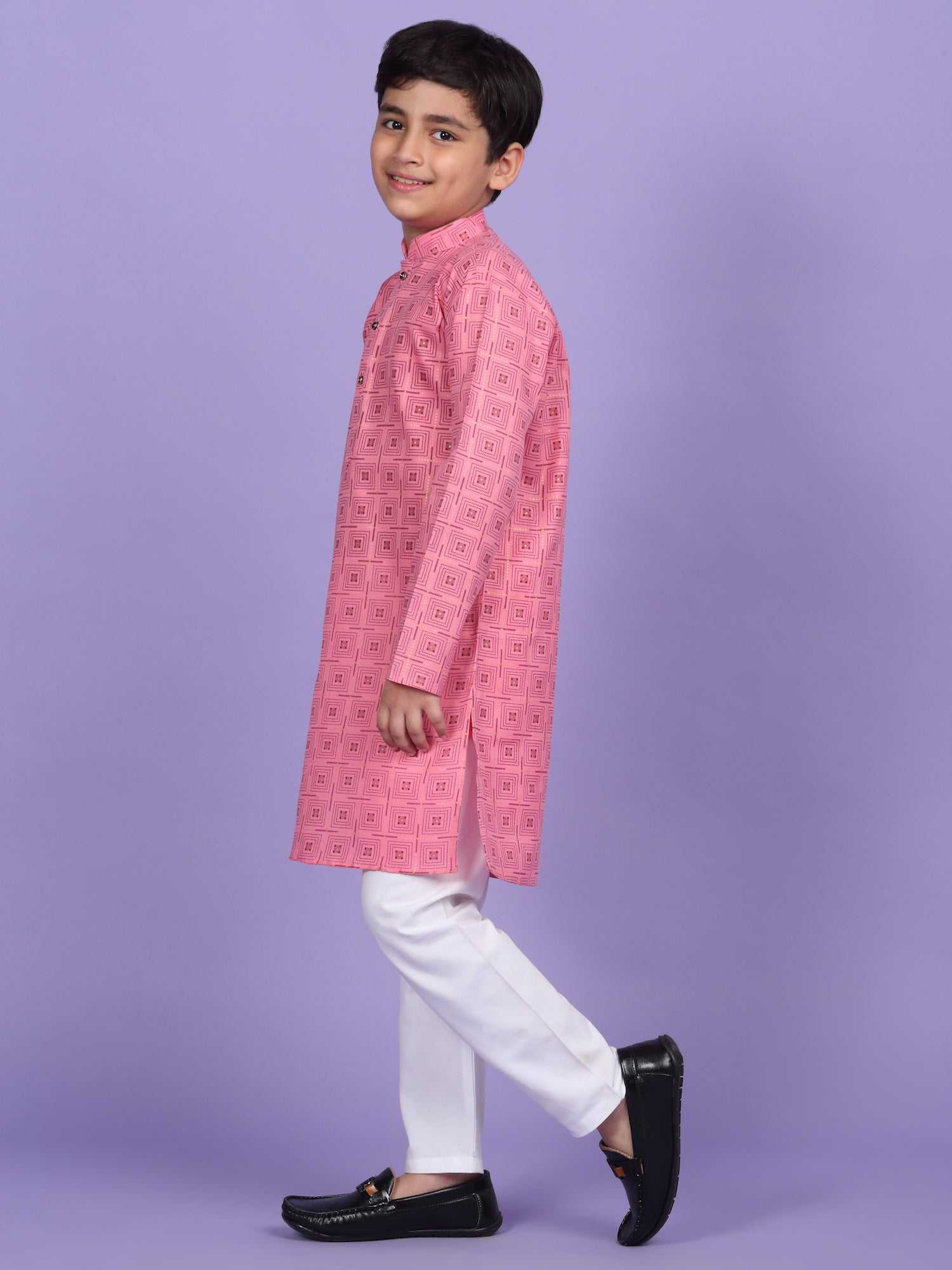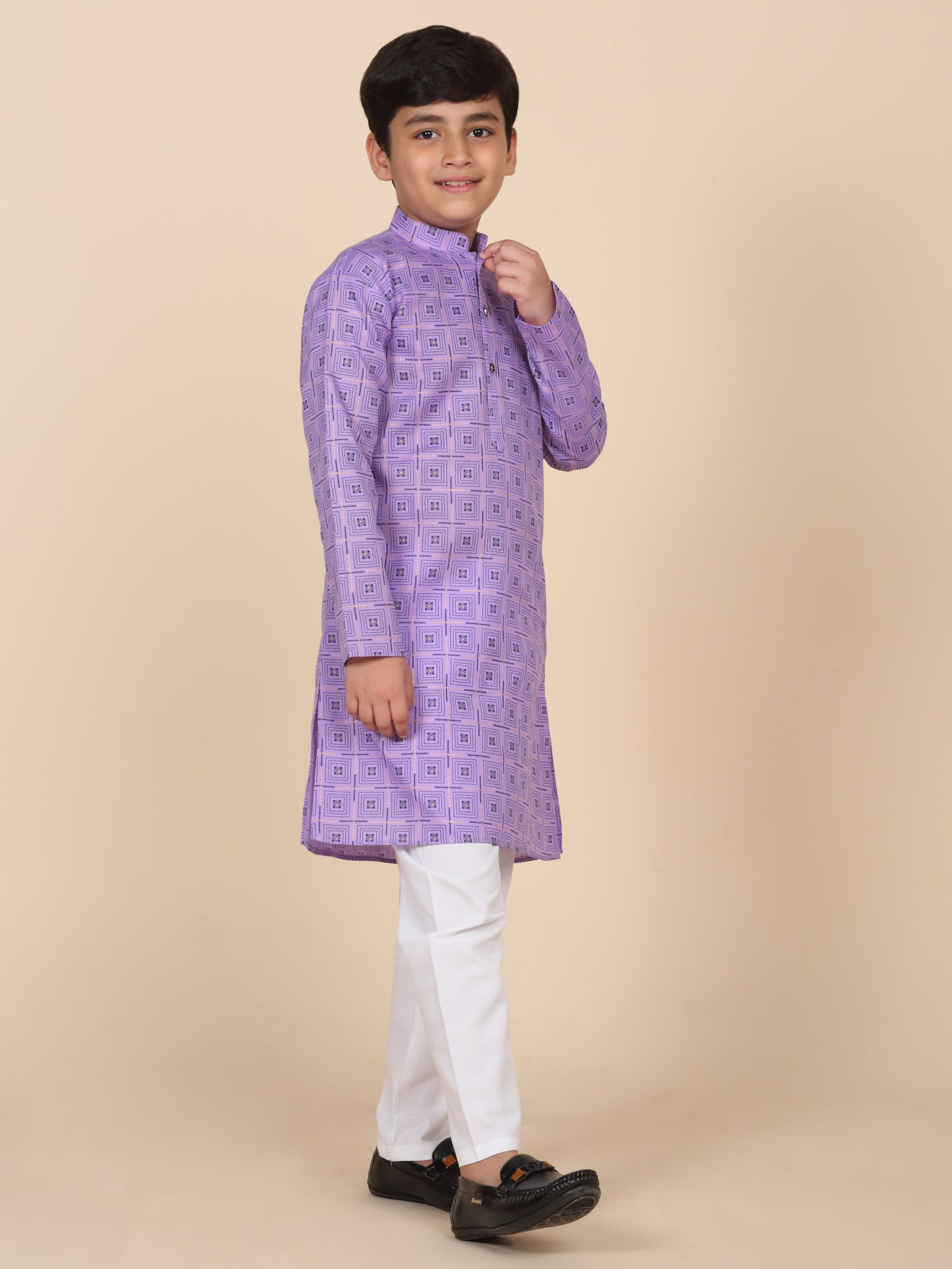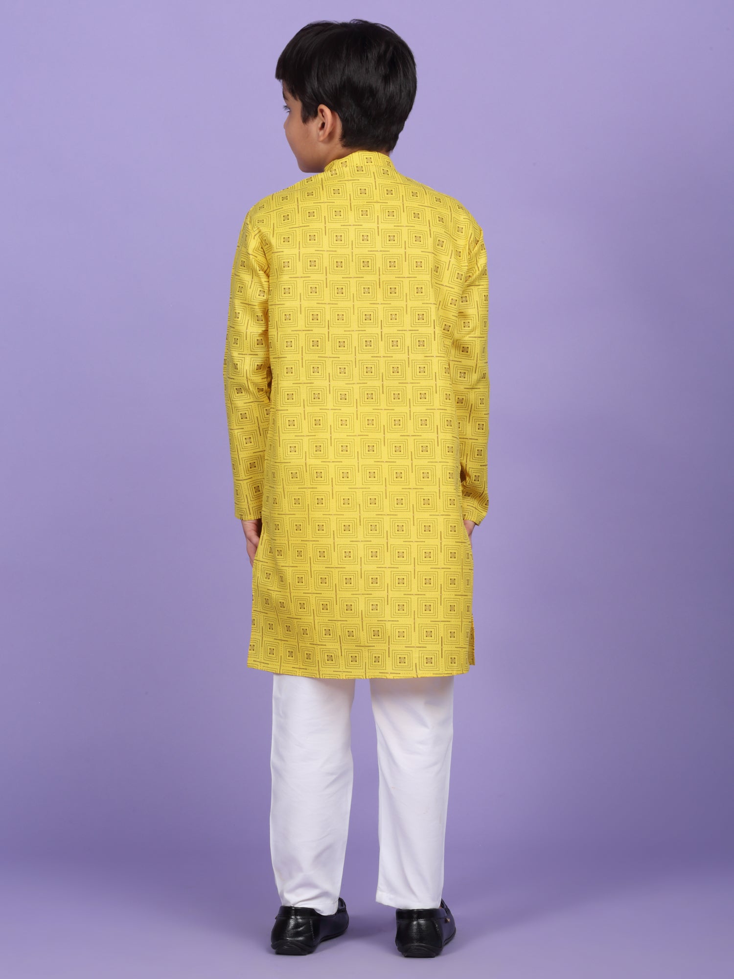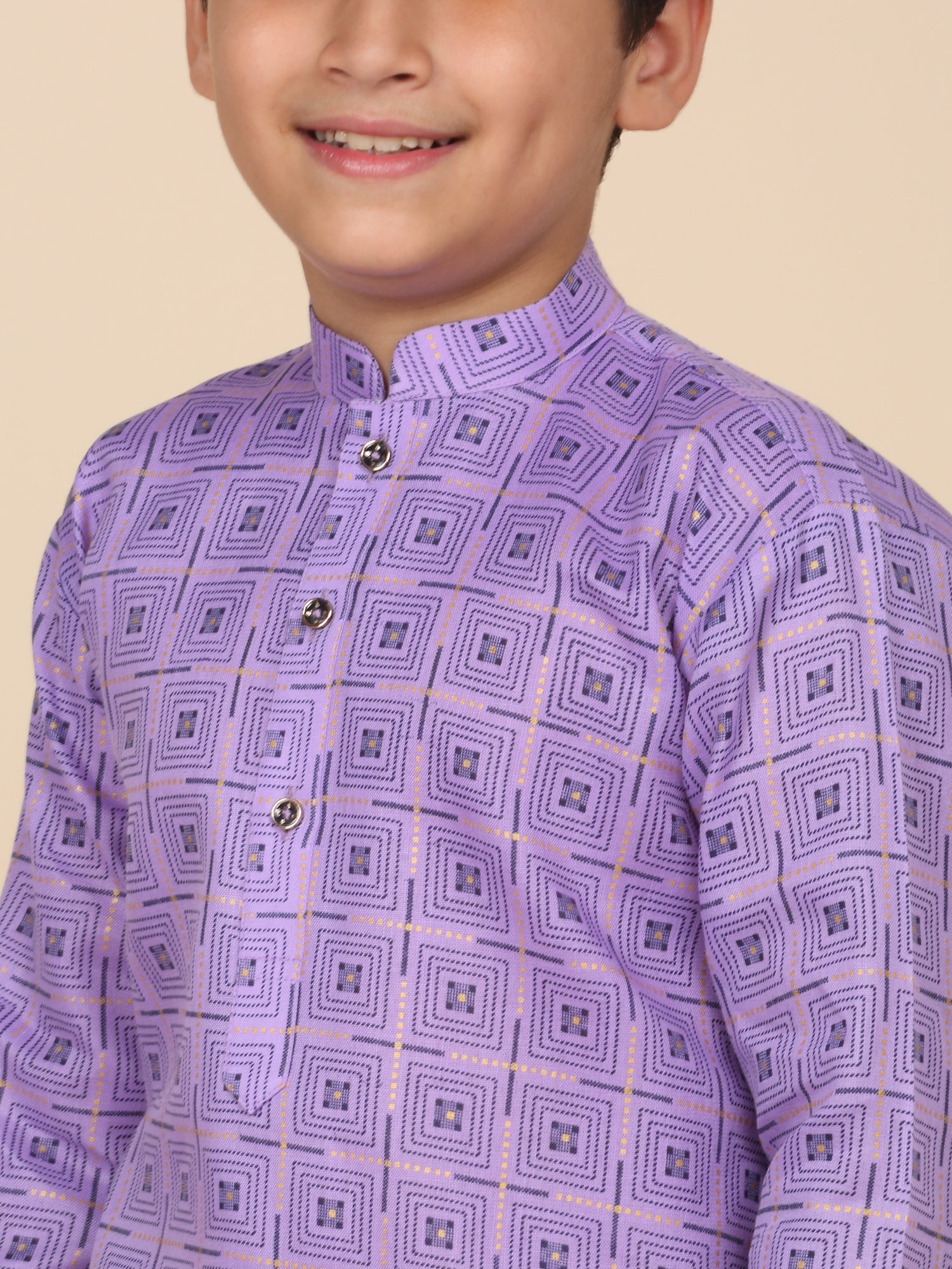 Give your child a smart ethnic upgrade with this Kids Cotton Blend Geometric Printed Kurta. Crafted from a soft and breathable cotton blend, this kurta features a trendy geometric print that adds a modern touch to traditional style. Designed with a Mandarin collar, long sleeves, and a straight hem, it offers both comfort and contemporary charm. Ideal for festive events, school celebrations, or casual family gatherings, this kurta pairs perfectly with white pyjamas, jeans, or trousers.
