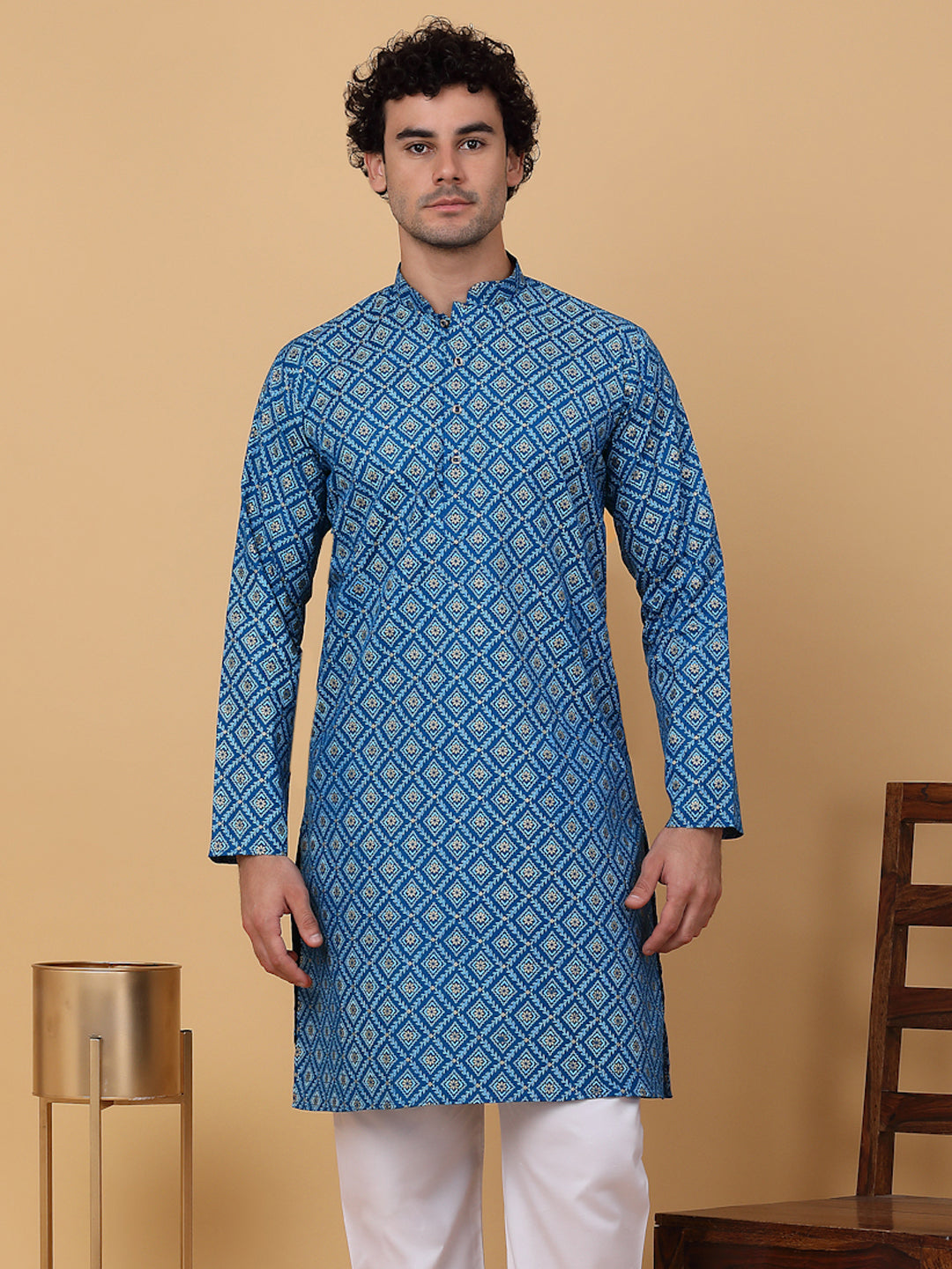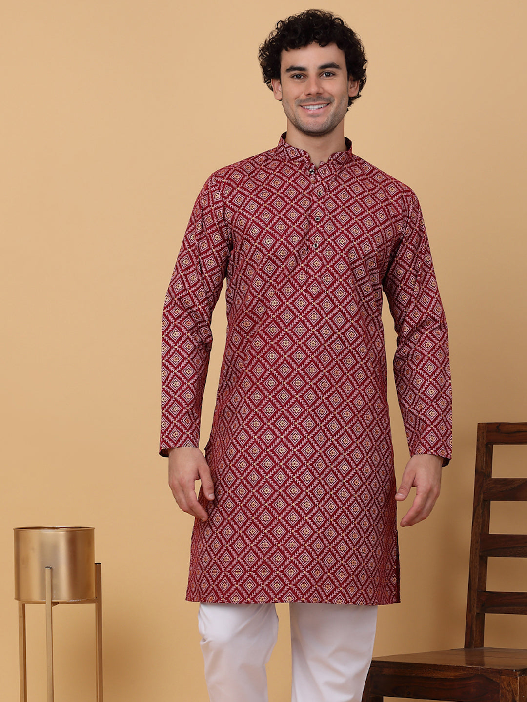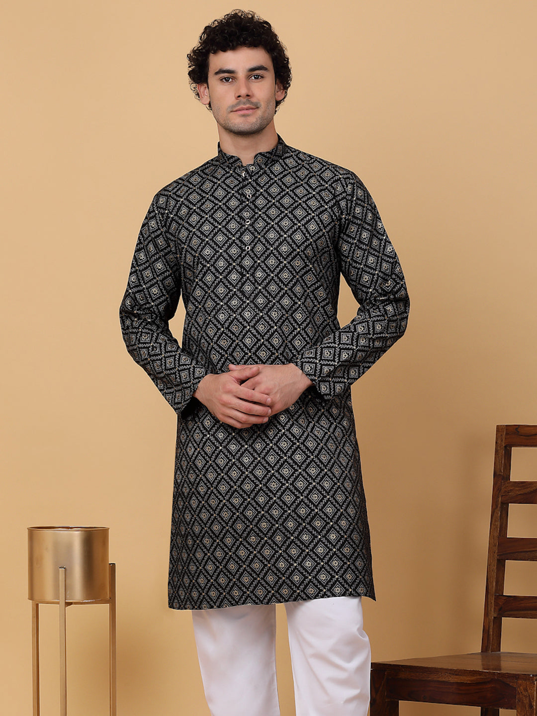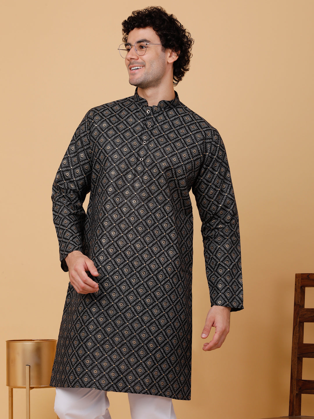 KRAFT INDIA Men Cotton Floral Gold Print Ethnic motif Knee Length Kurta Only