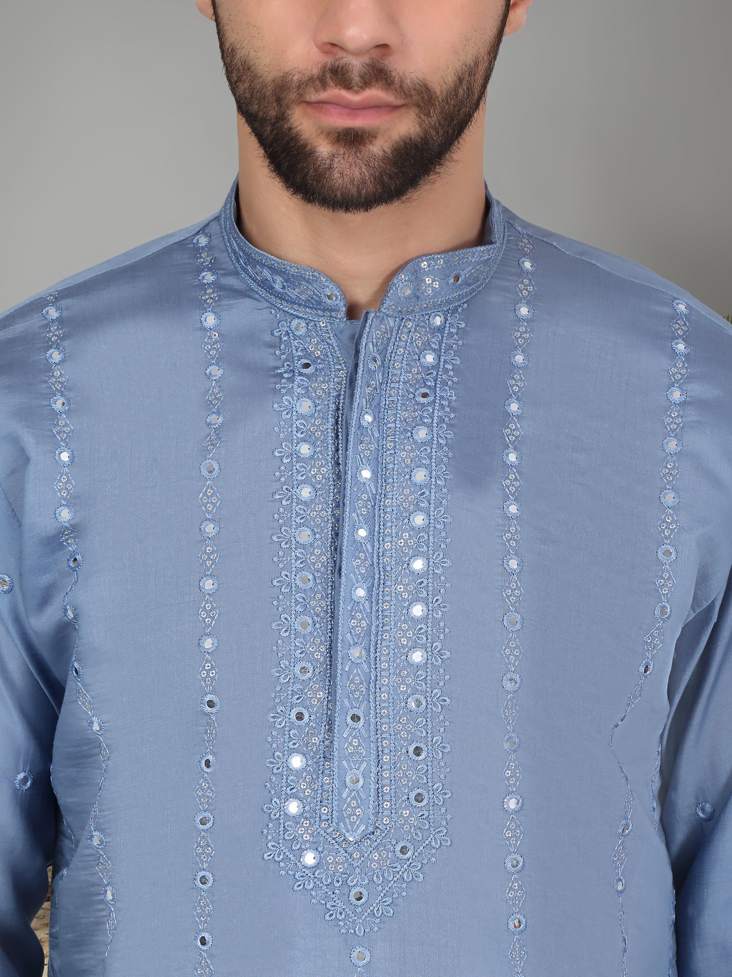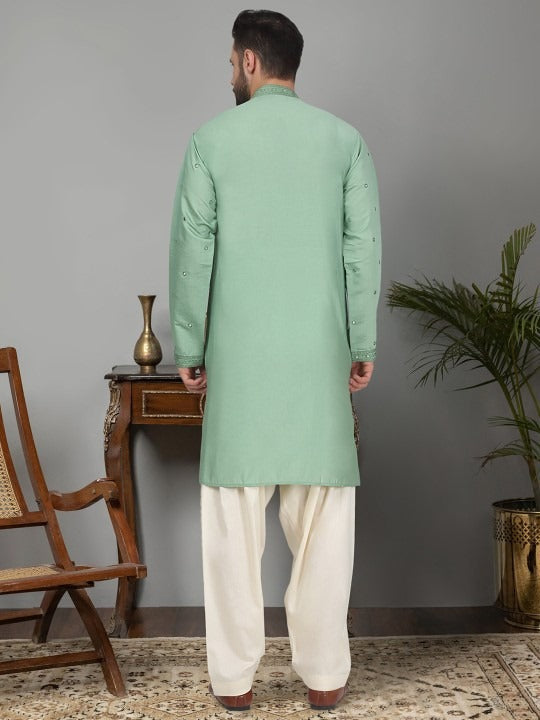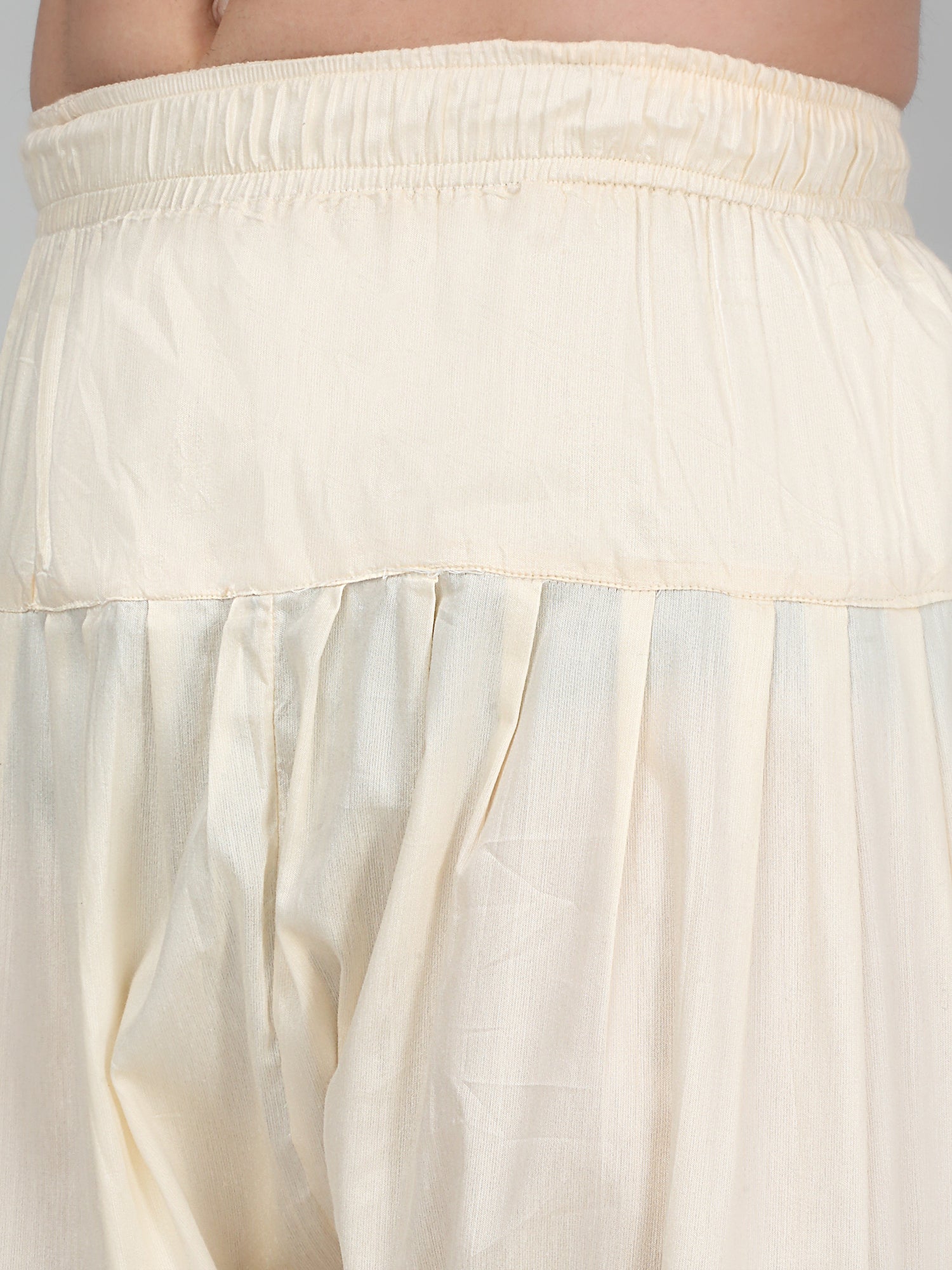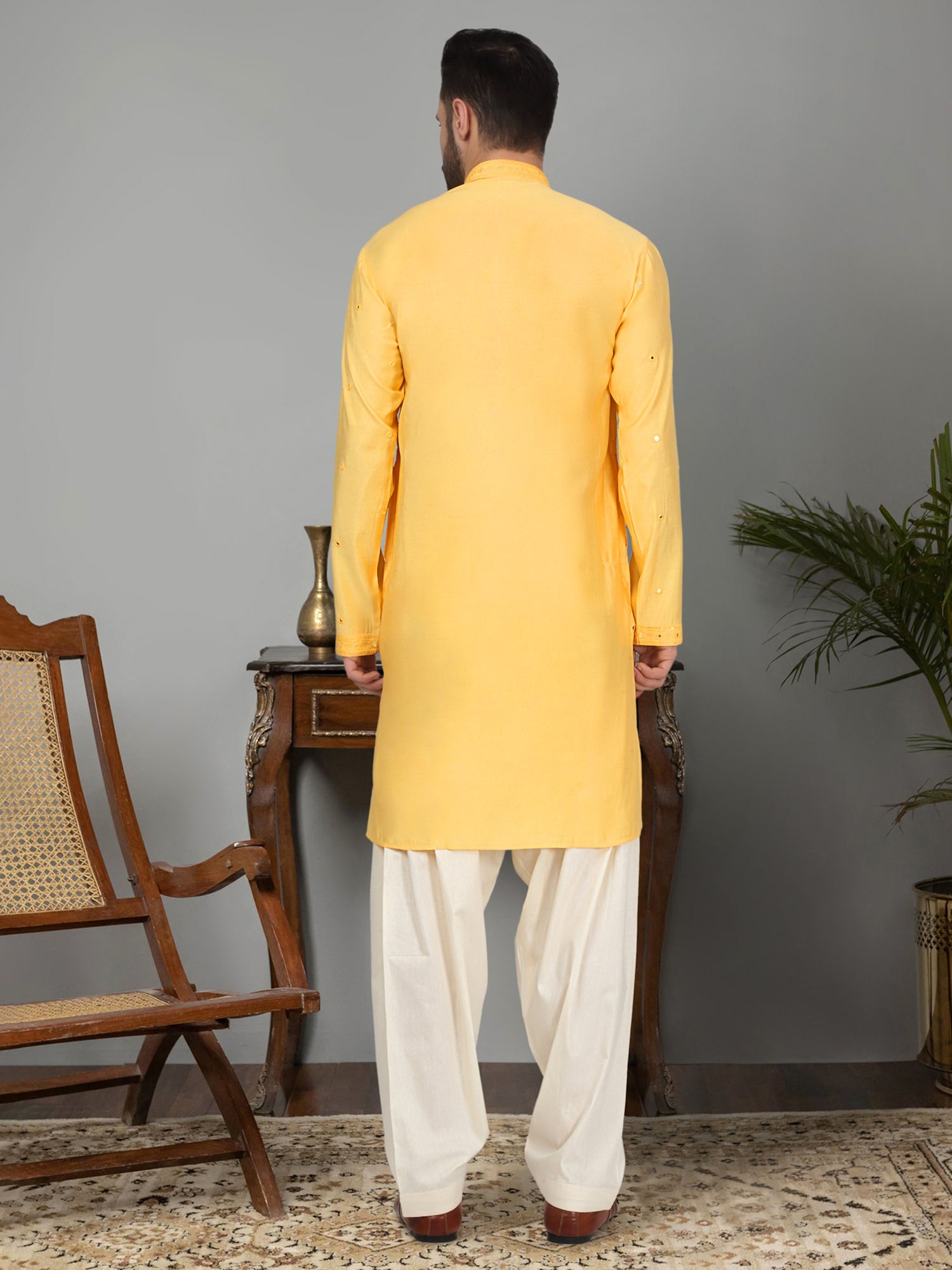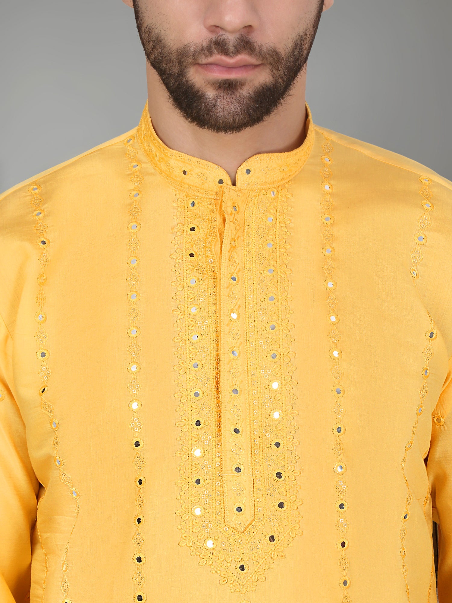 Expertly crafted for comfort and style, our Men's Cotton Silk Kurta boasts a stunning Mirror Work Yoke design. With long sleeves and an elastic waistband Beige Salwar, this kurta offers a perfect blend of traditional and modern. Made from high-quality cotton silk, it provides both breathability and durability. Elevate your wardrobe with this sophisticated piece.