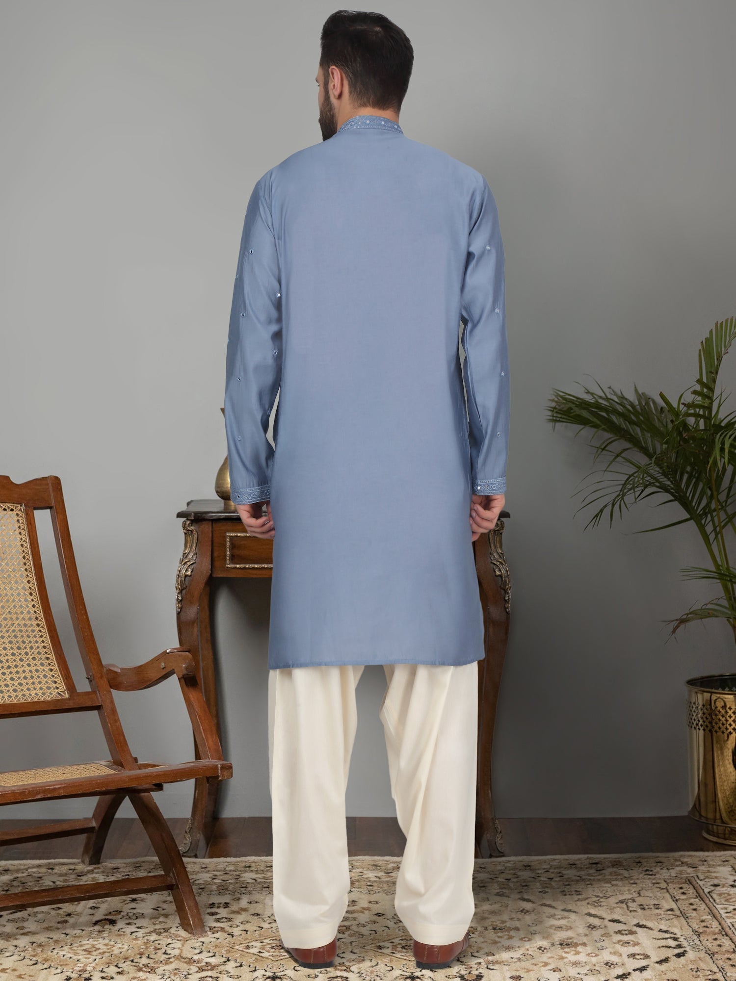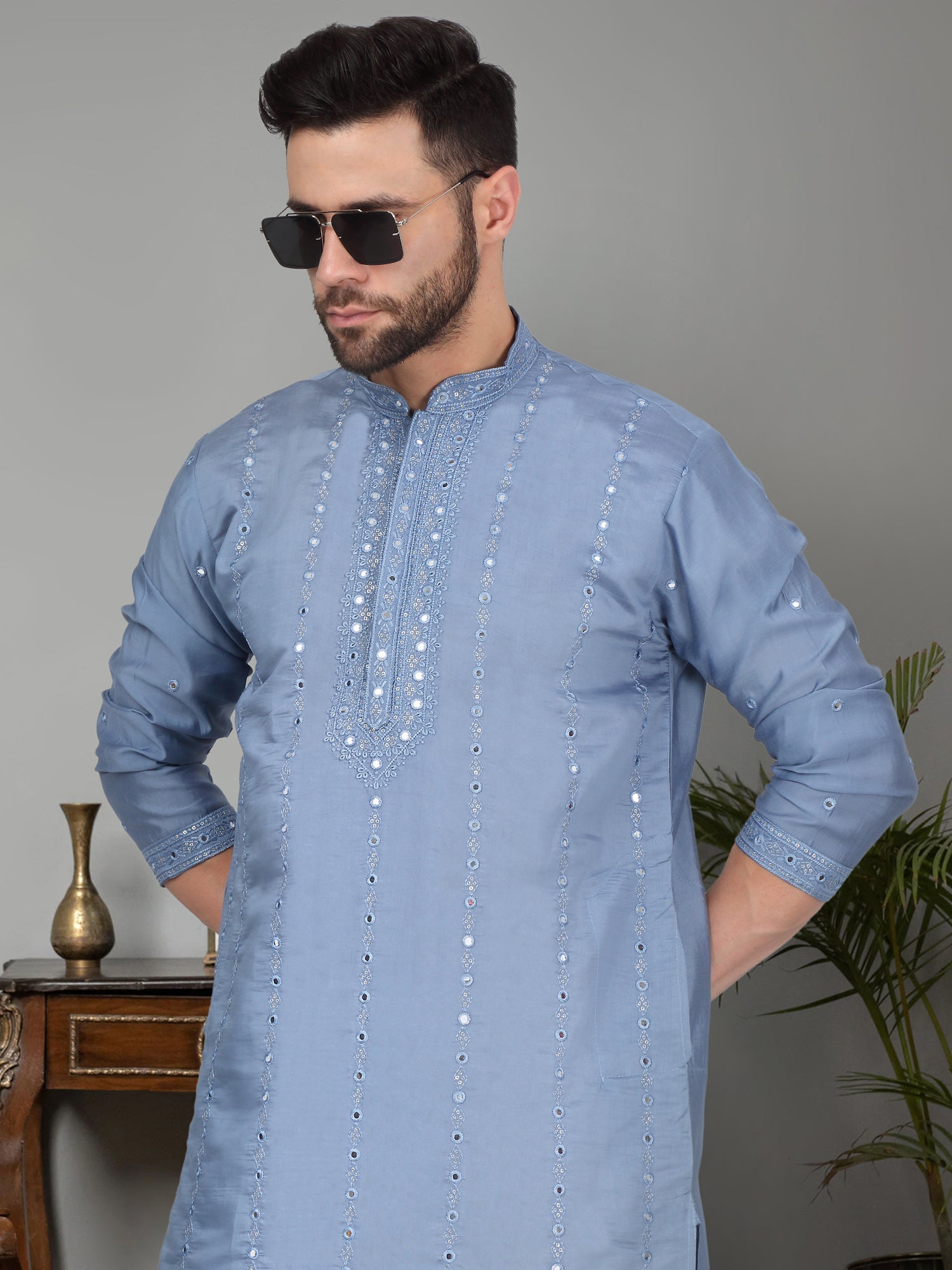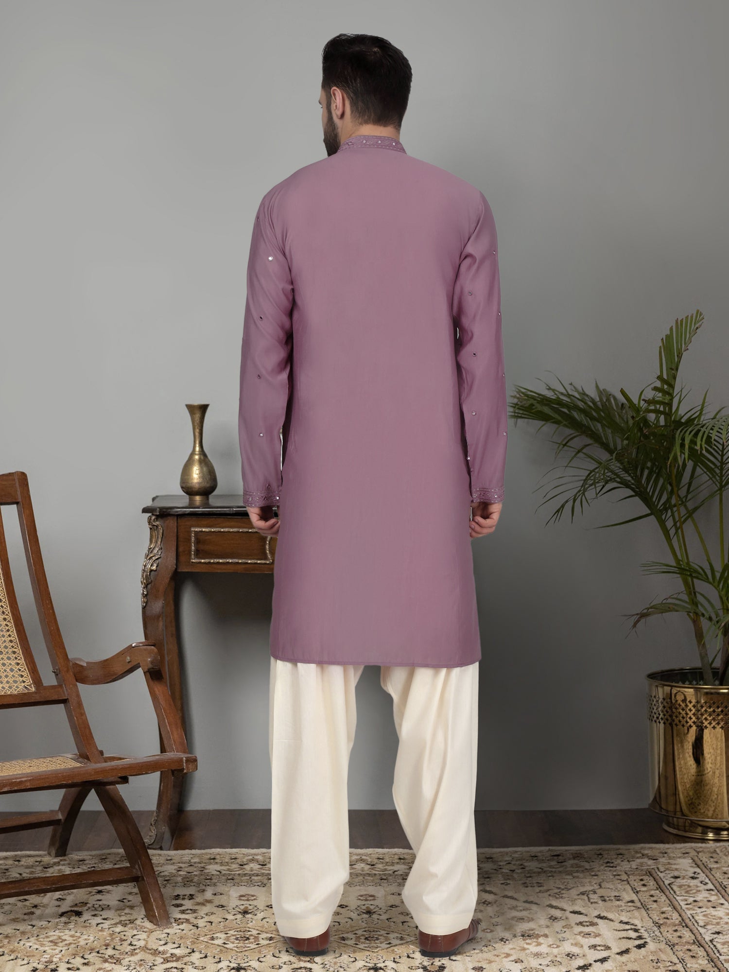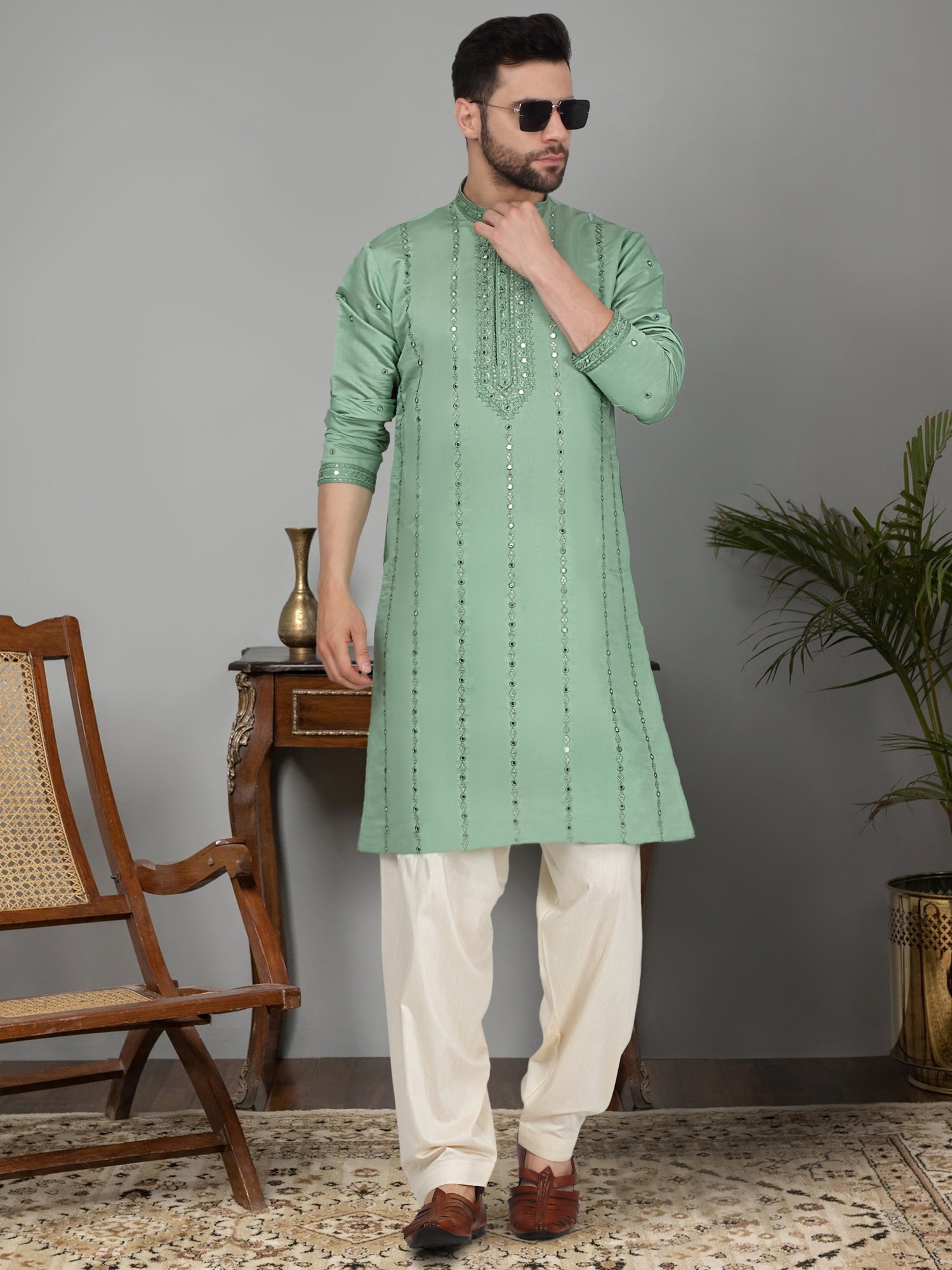 Expertly crafted for comfort and style, our Men's Cotton Silk Kurta boasts a stunning Mirror Work Yoke design. With long sleeves and an elastic waistband Beige Salwar, this kurta offers a perfect blend of traditional and modern. Made from high-quality cotton silk, it provides both breathability and durability. Elevate your wardrobe with this sophisticated piece.