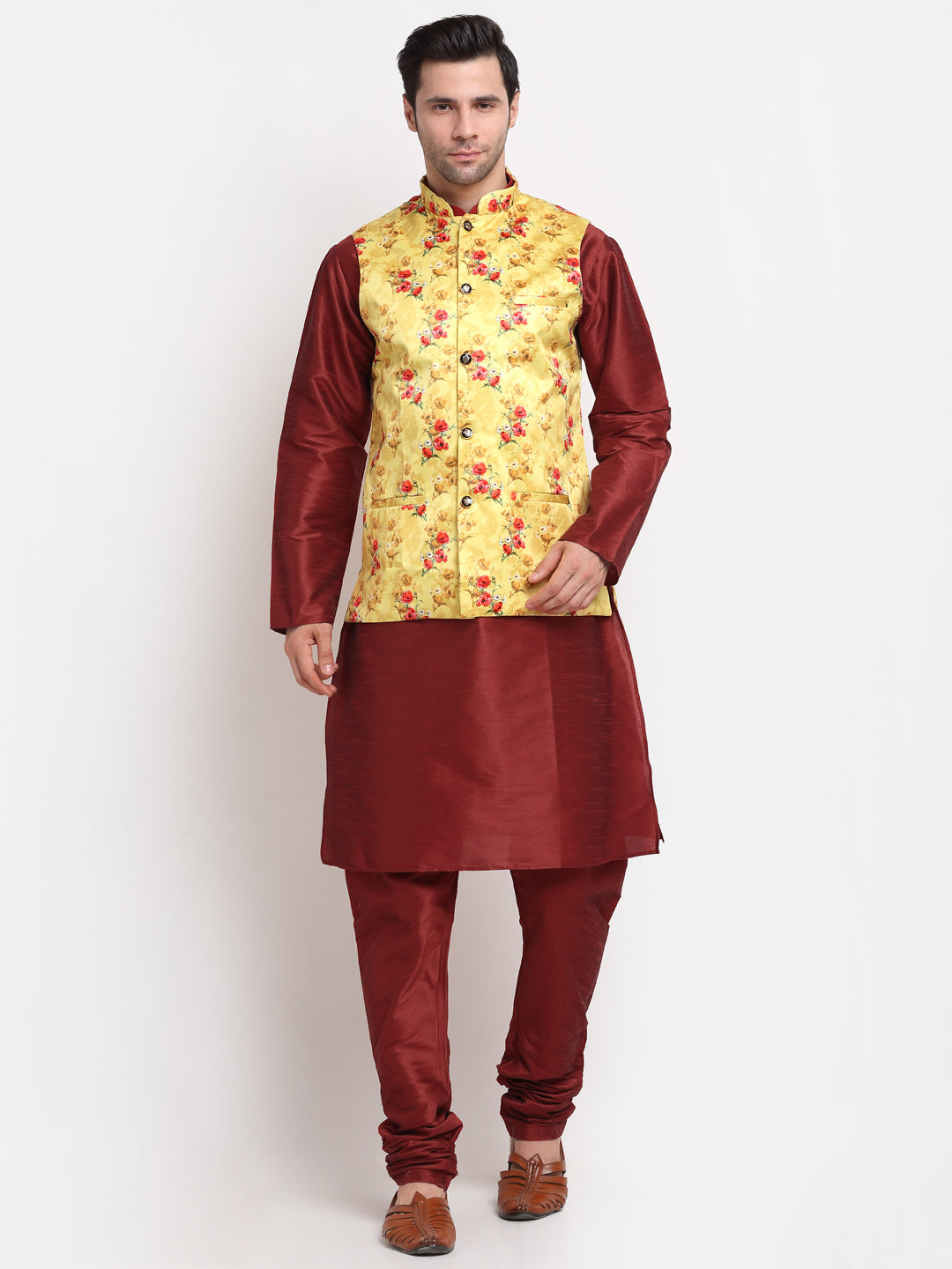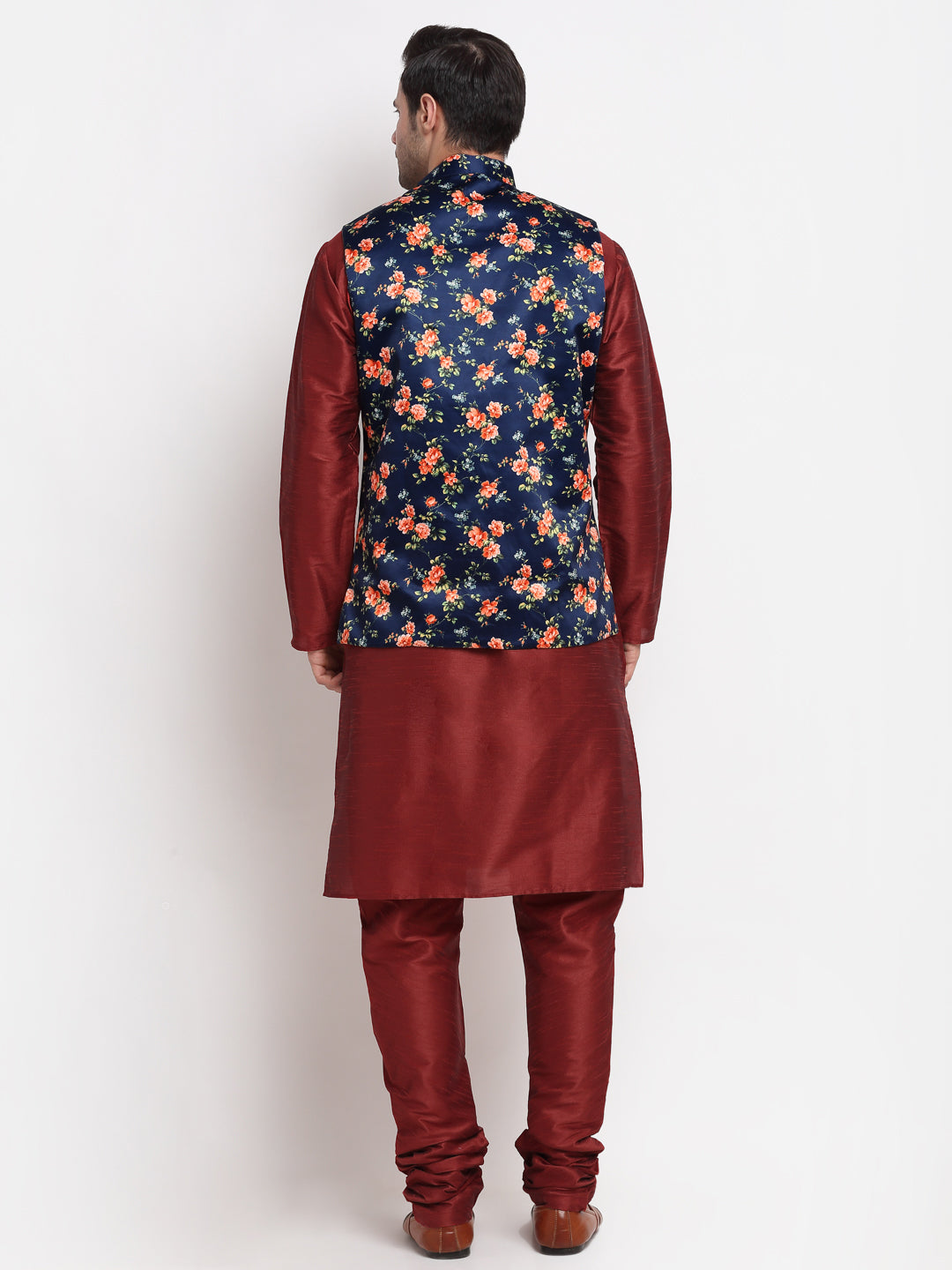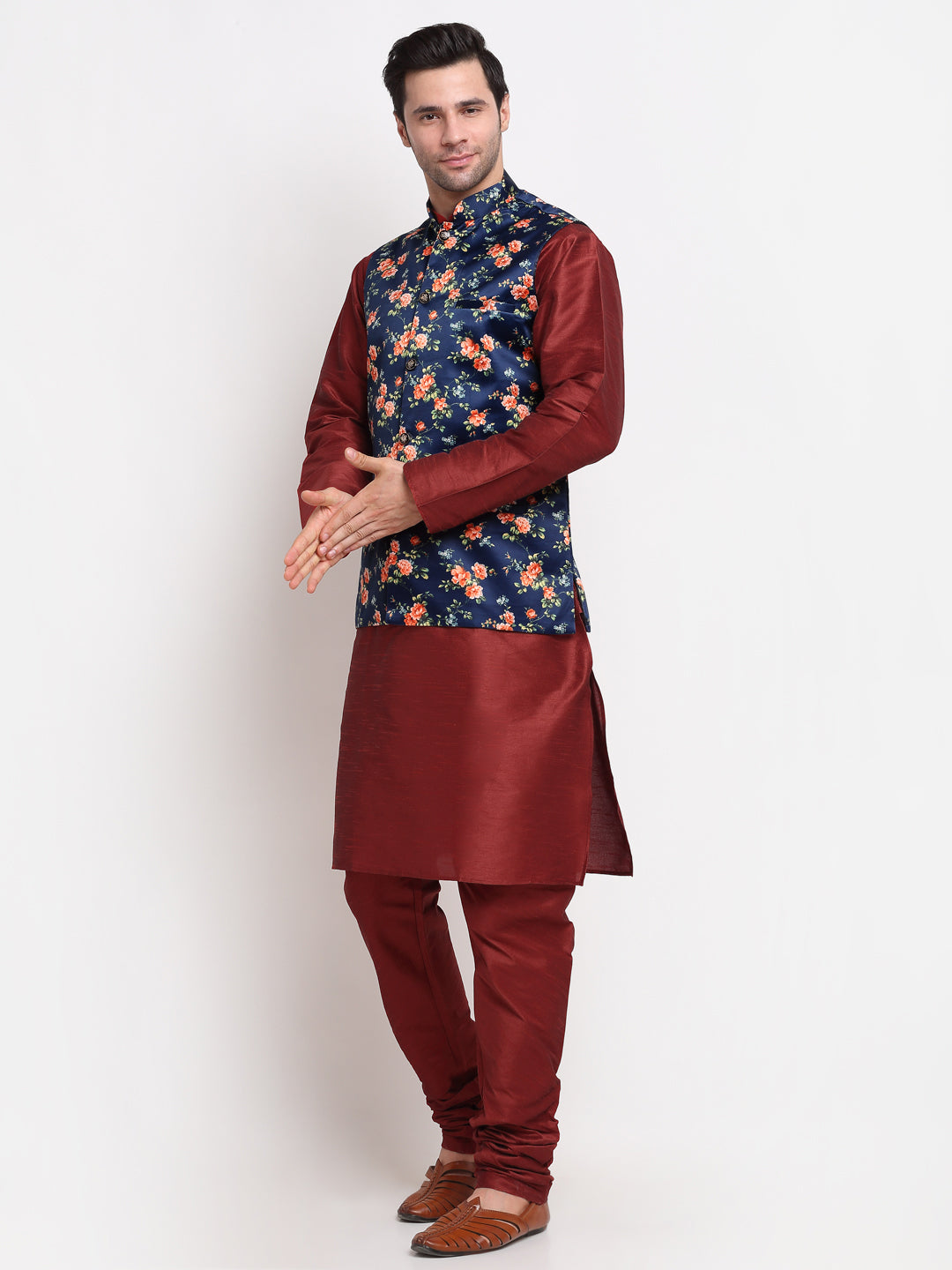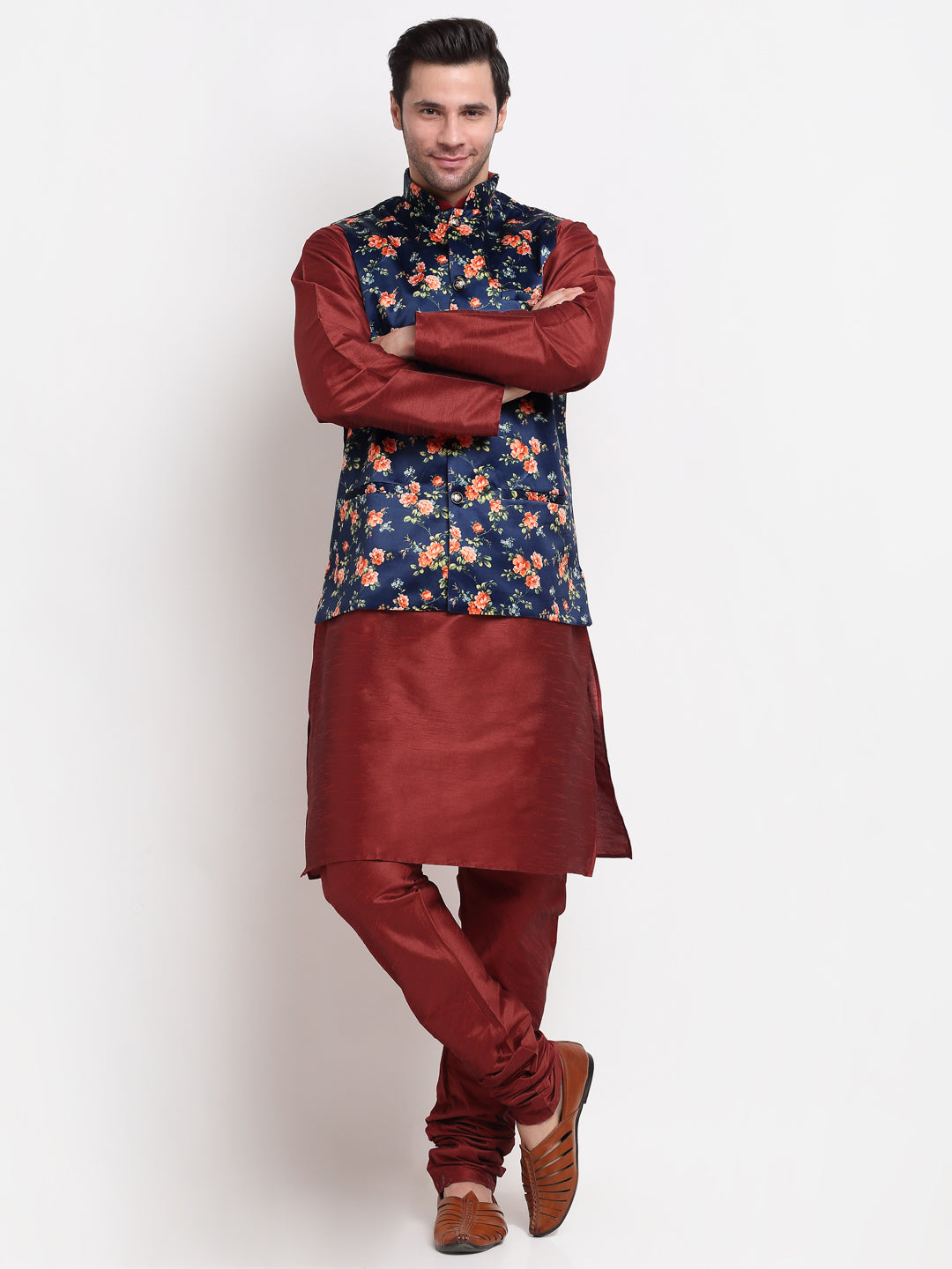 KRAFT INDIA Men Maroon Kurta Churidar With Satin Floral Print Nehru Jacket