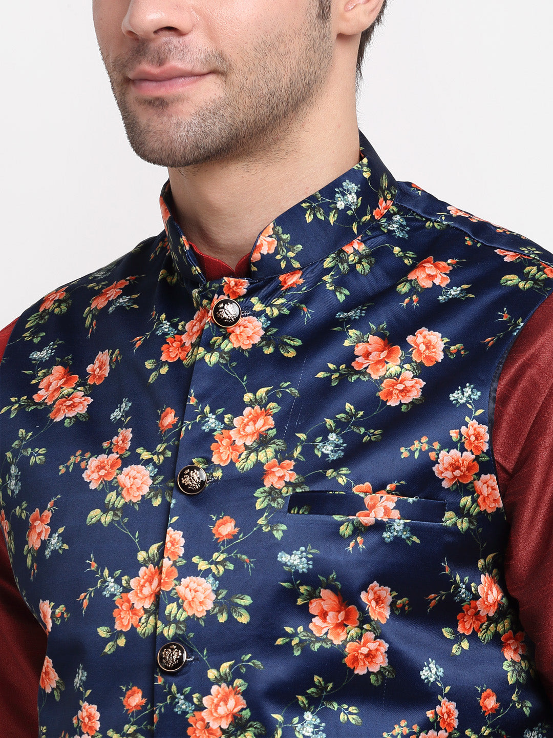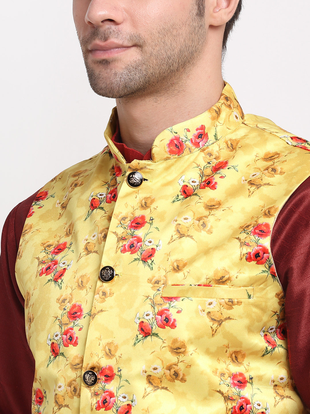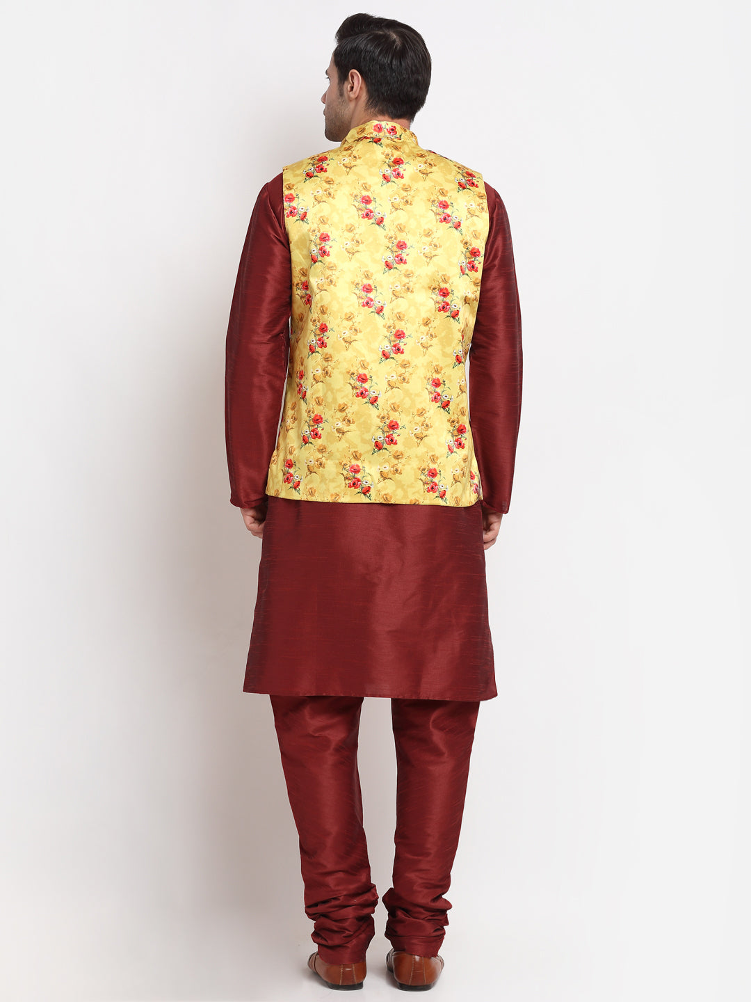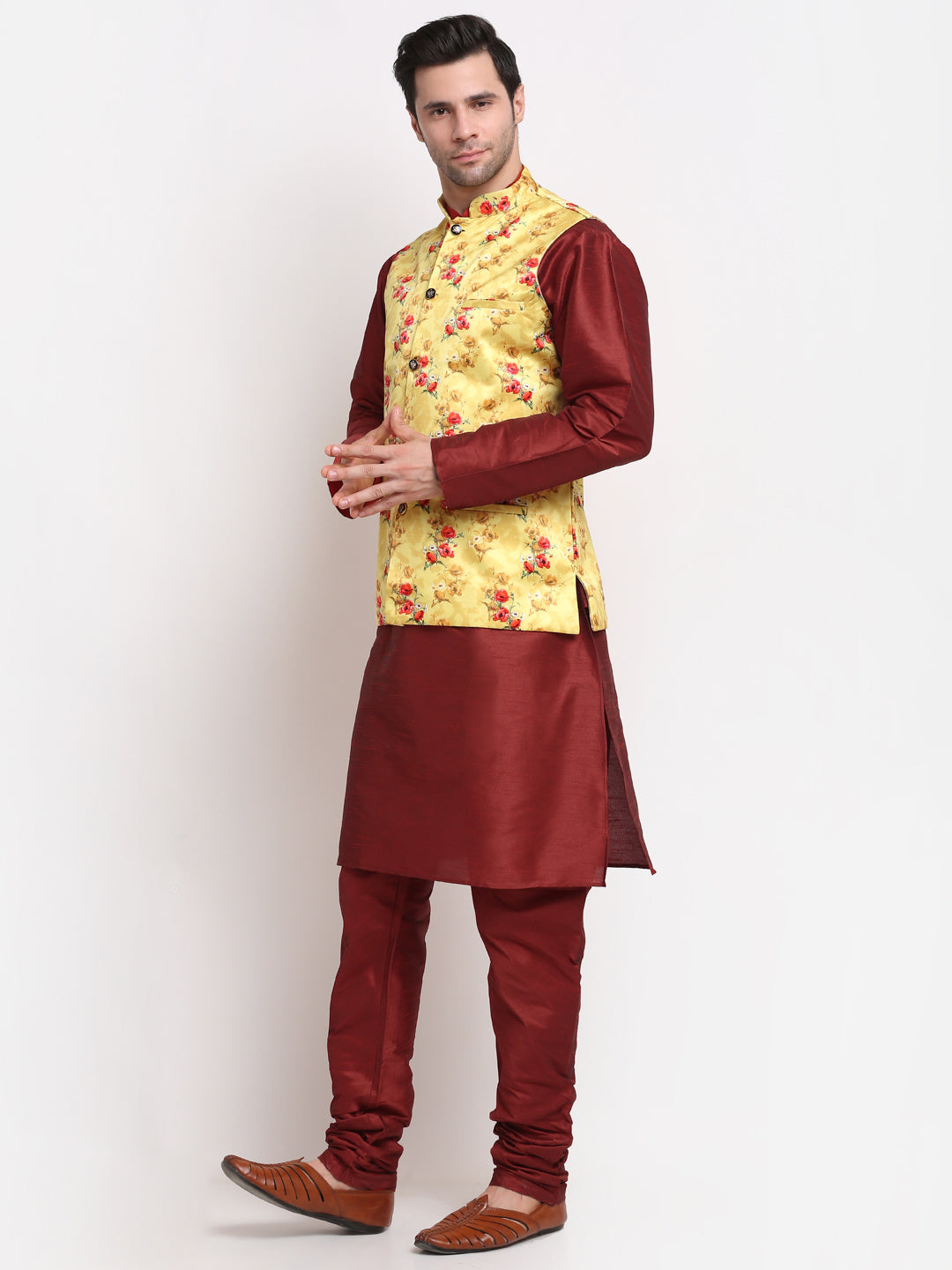 KRAFT INDIA Men Maroon Kurta Churidar With Satin Floral Print Nehru Jacket