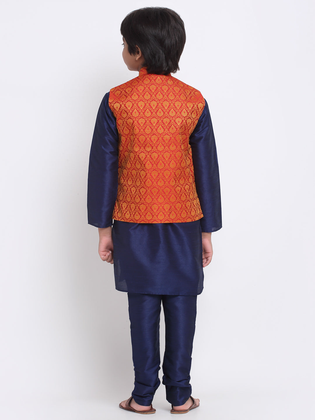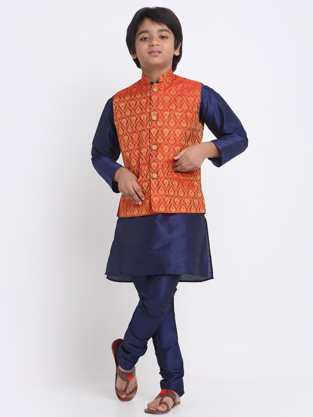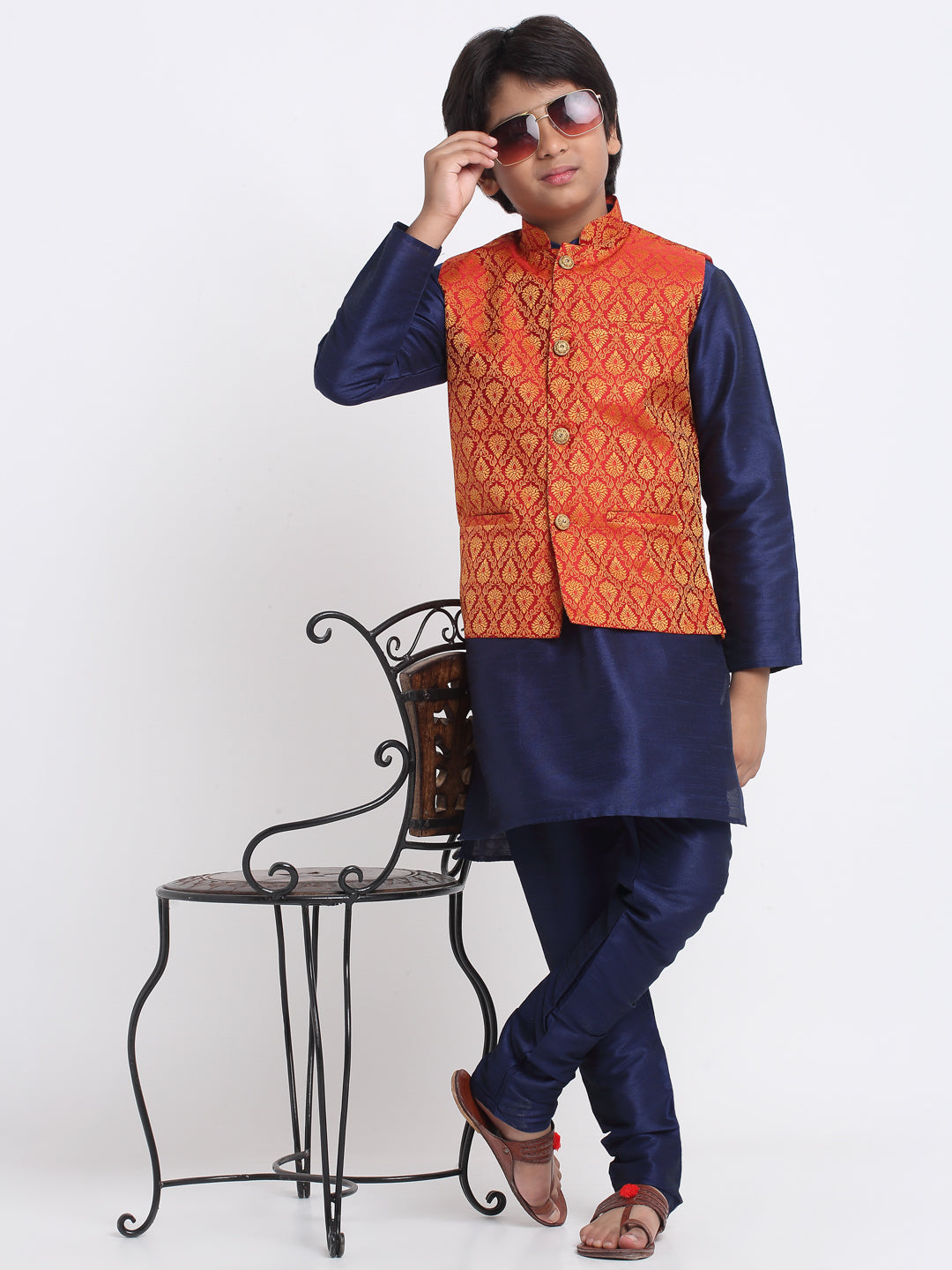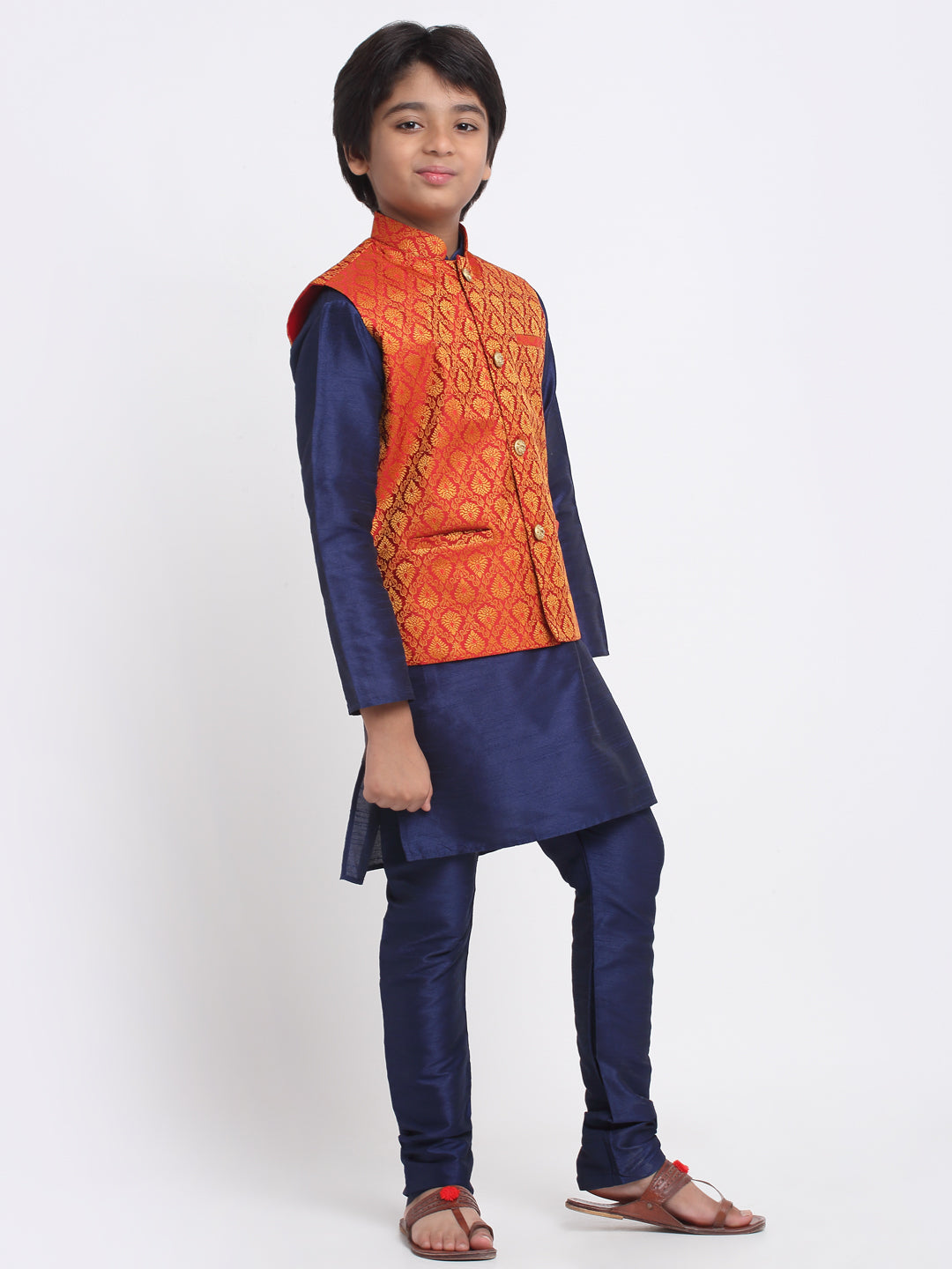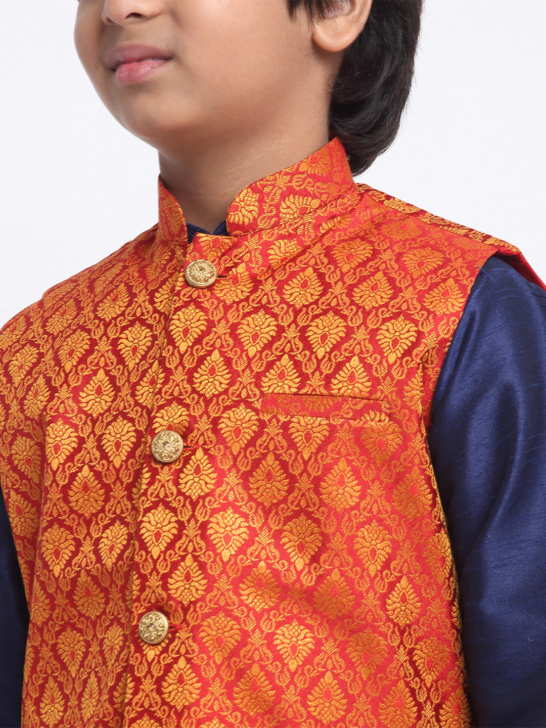 KRAFT INDIA Boys Navy Blue Silk Blend Kurta and Churidar with Jacquard Red Nehru jacket