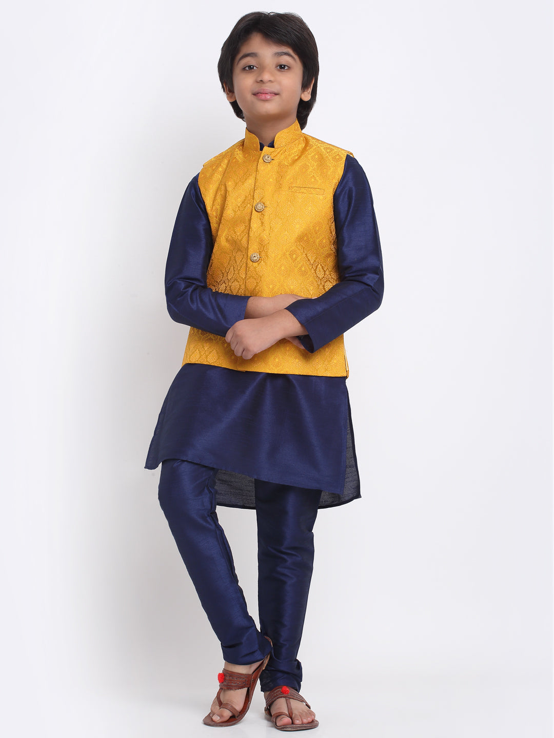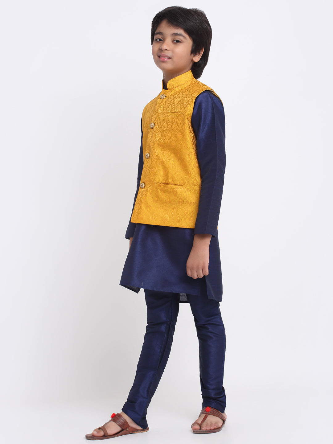 KRAFT INDIA Boys Navy Blue Silk Blend Kurta and Churidar with Jacquard Yellow Nehru jacket