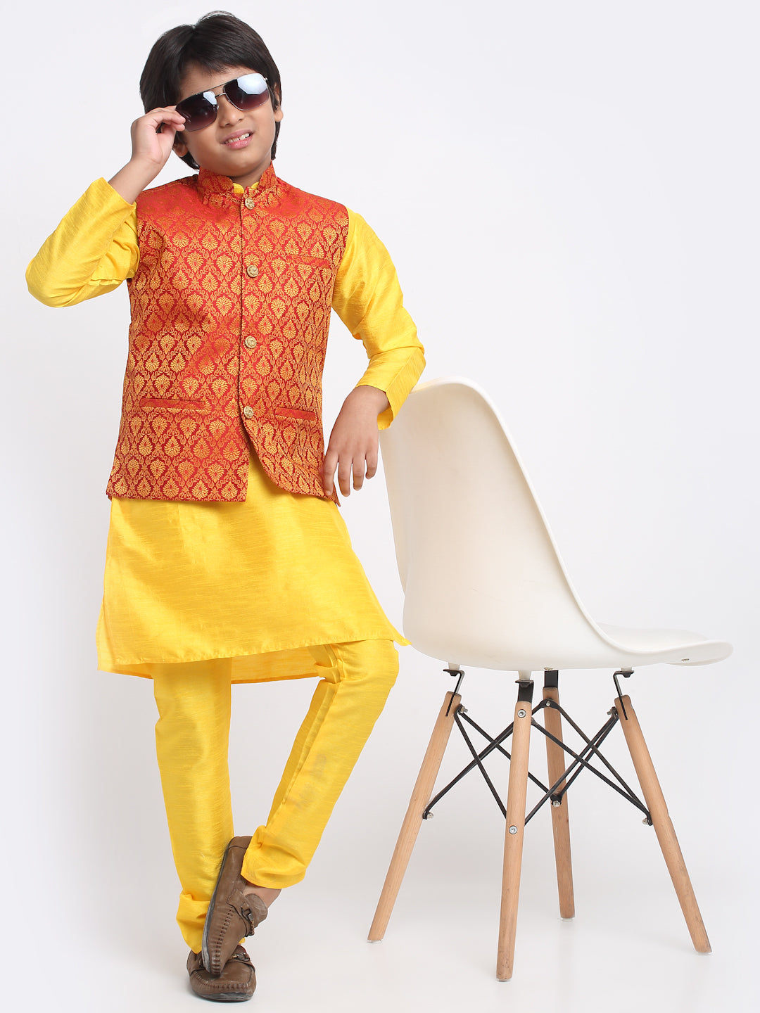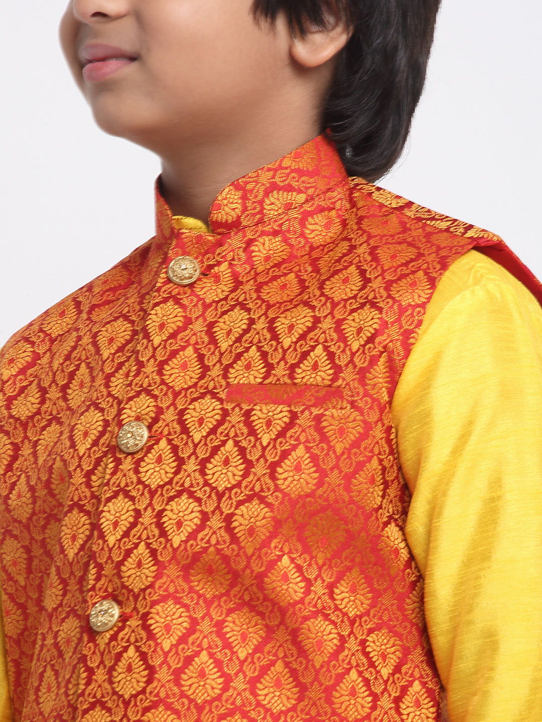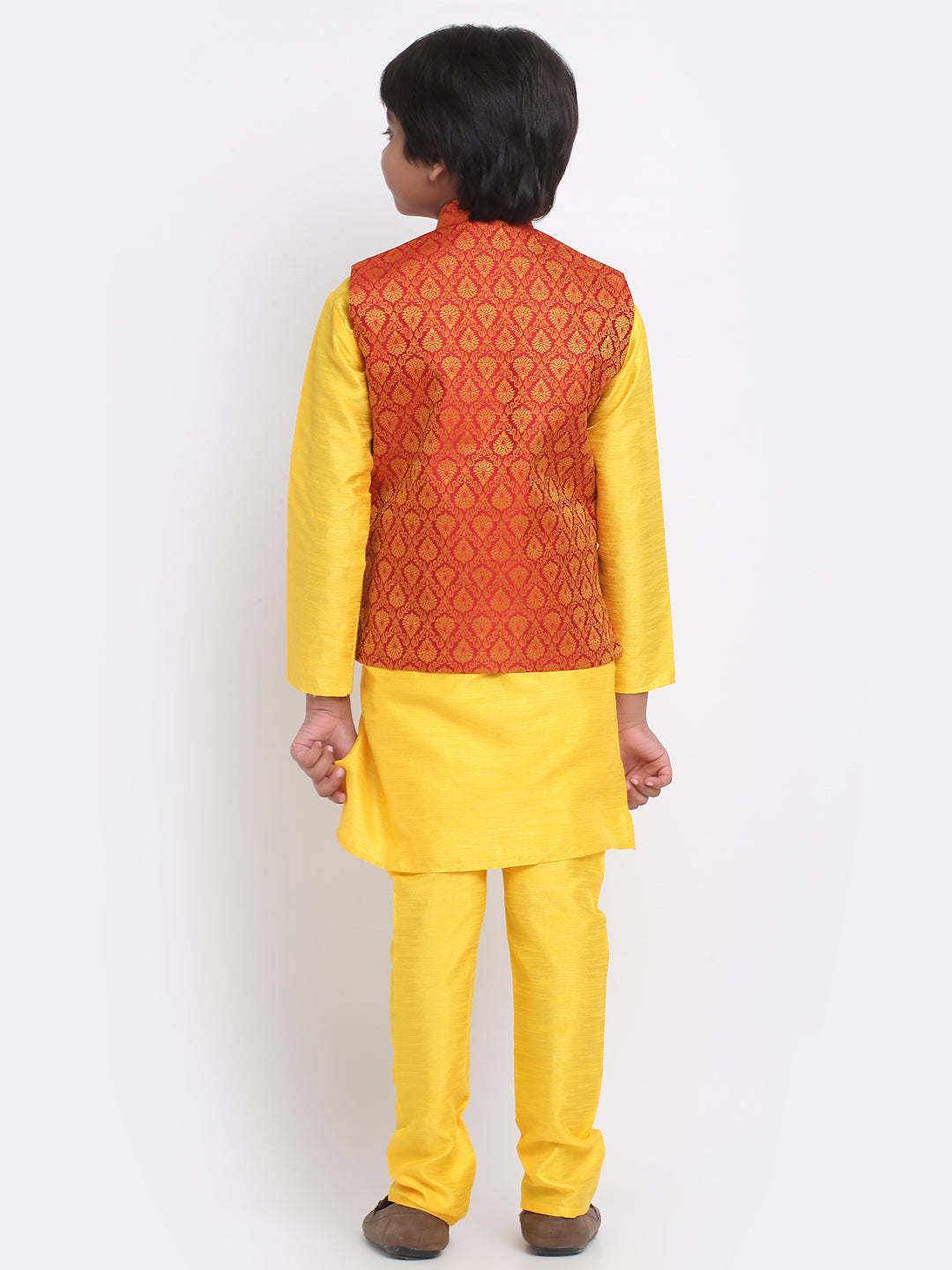 KRAFT INDIA Boys Yellow Silk Blend Kurta and Churidar with Jacquard Red Nehru jacket