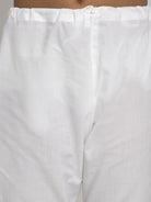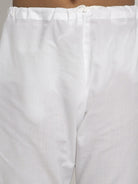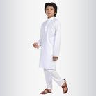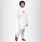 Knee-length kurta, has a mandarin collar, long sleeves, button closure, side slits, straight hem with drawstring closure white pyjama.