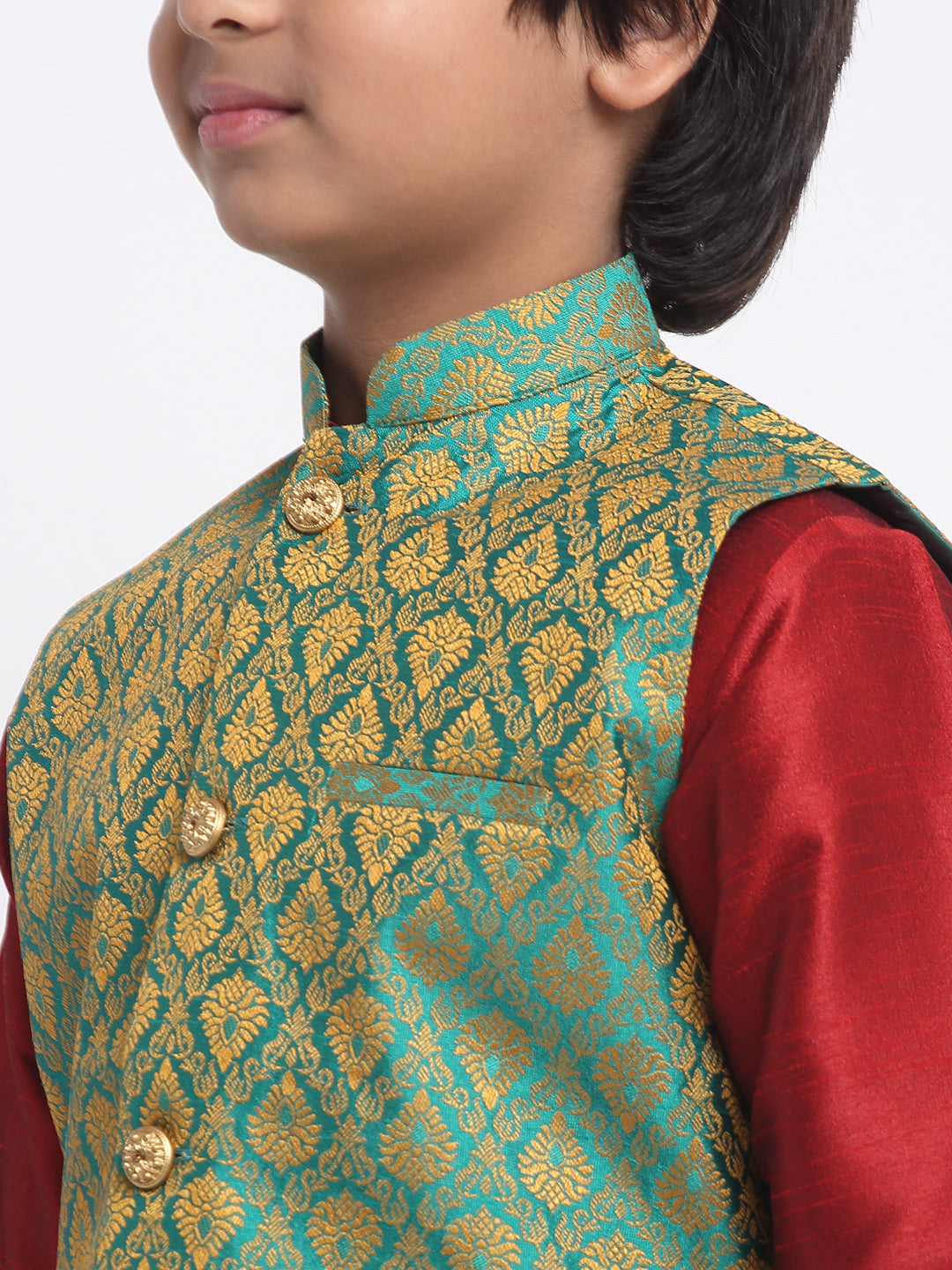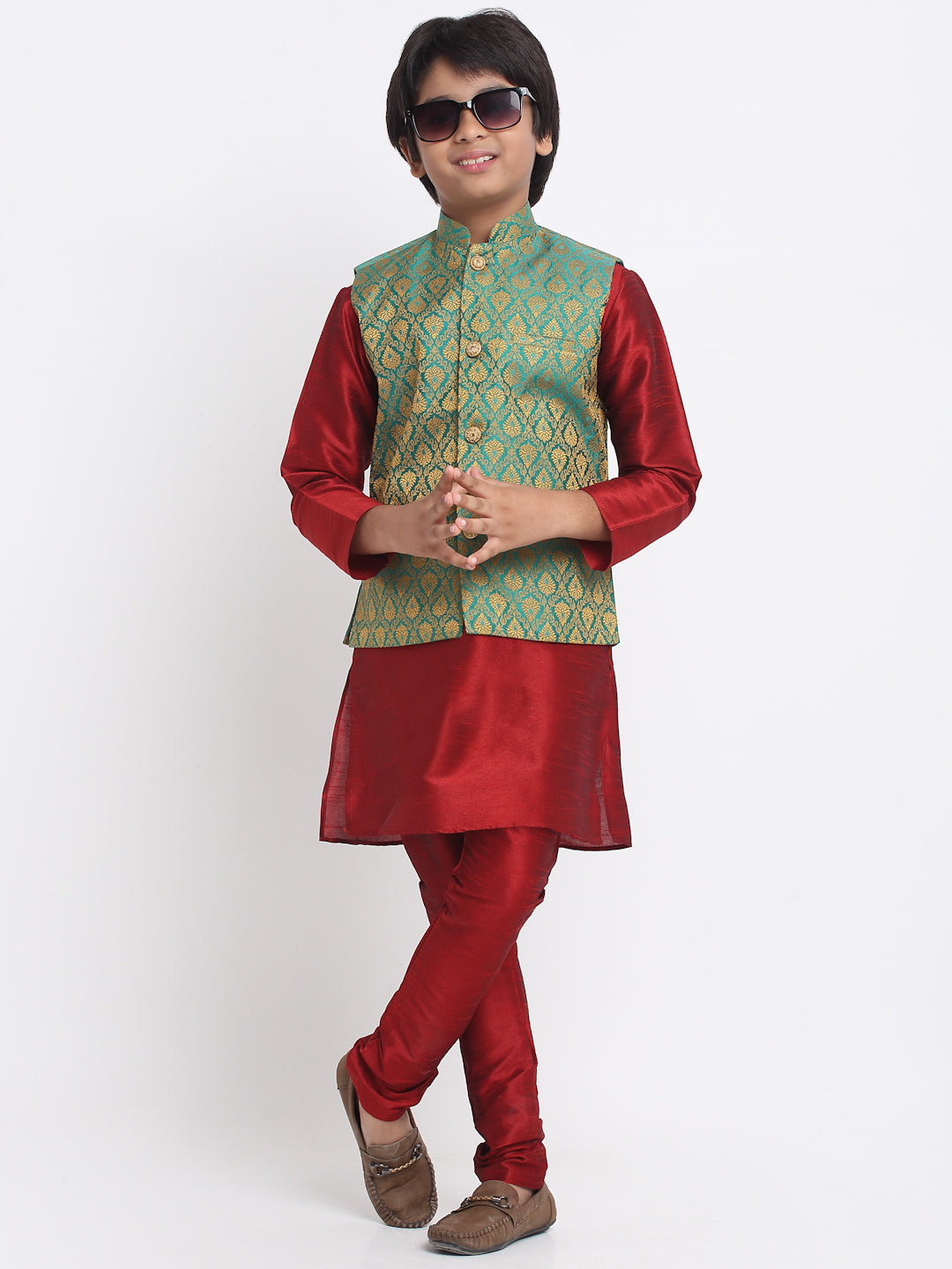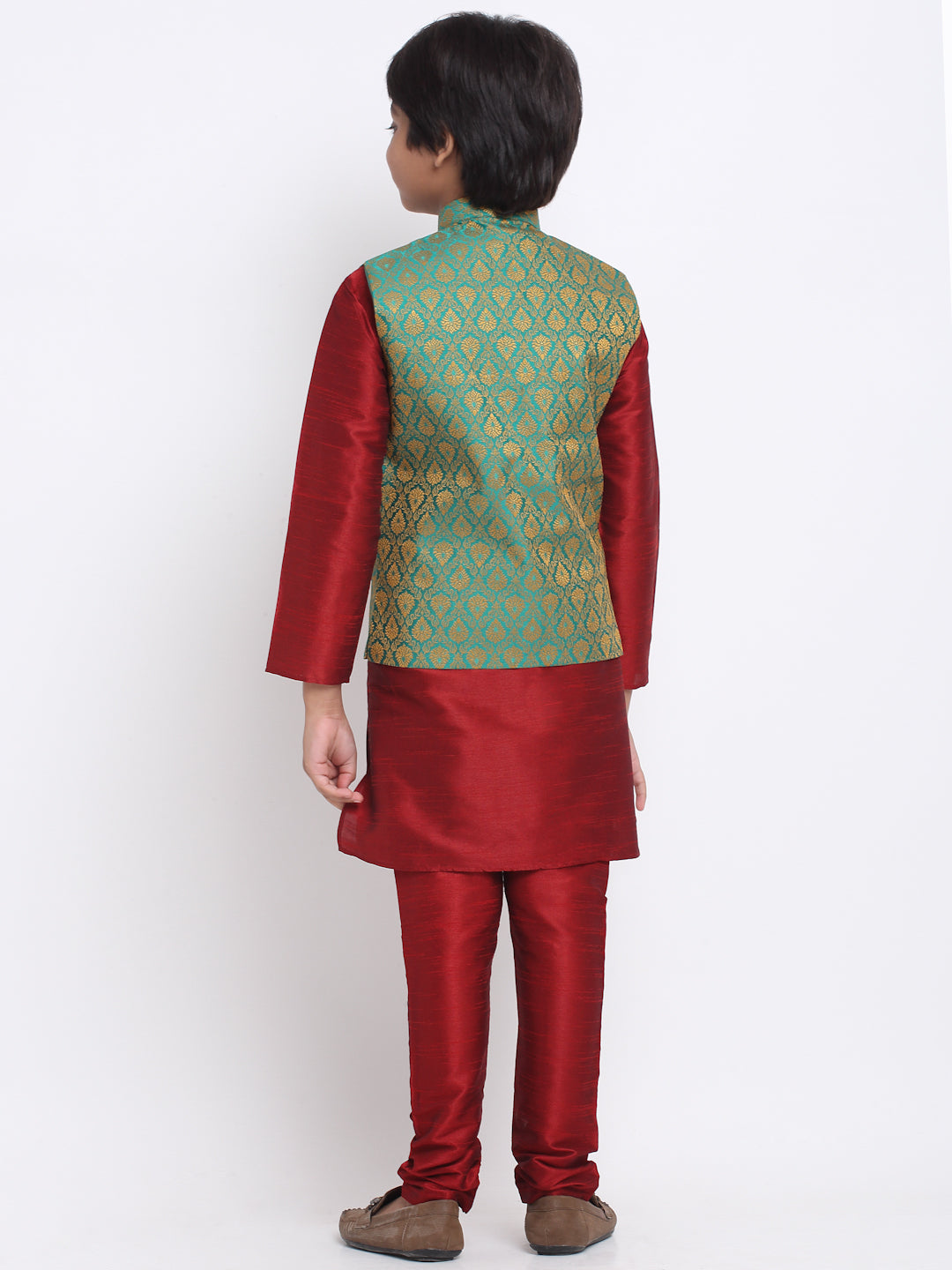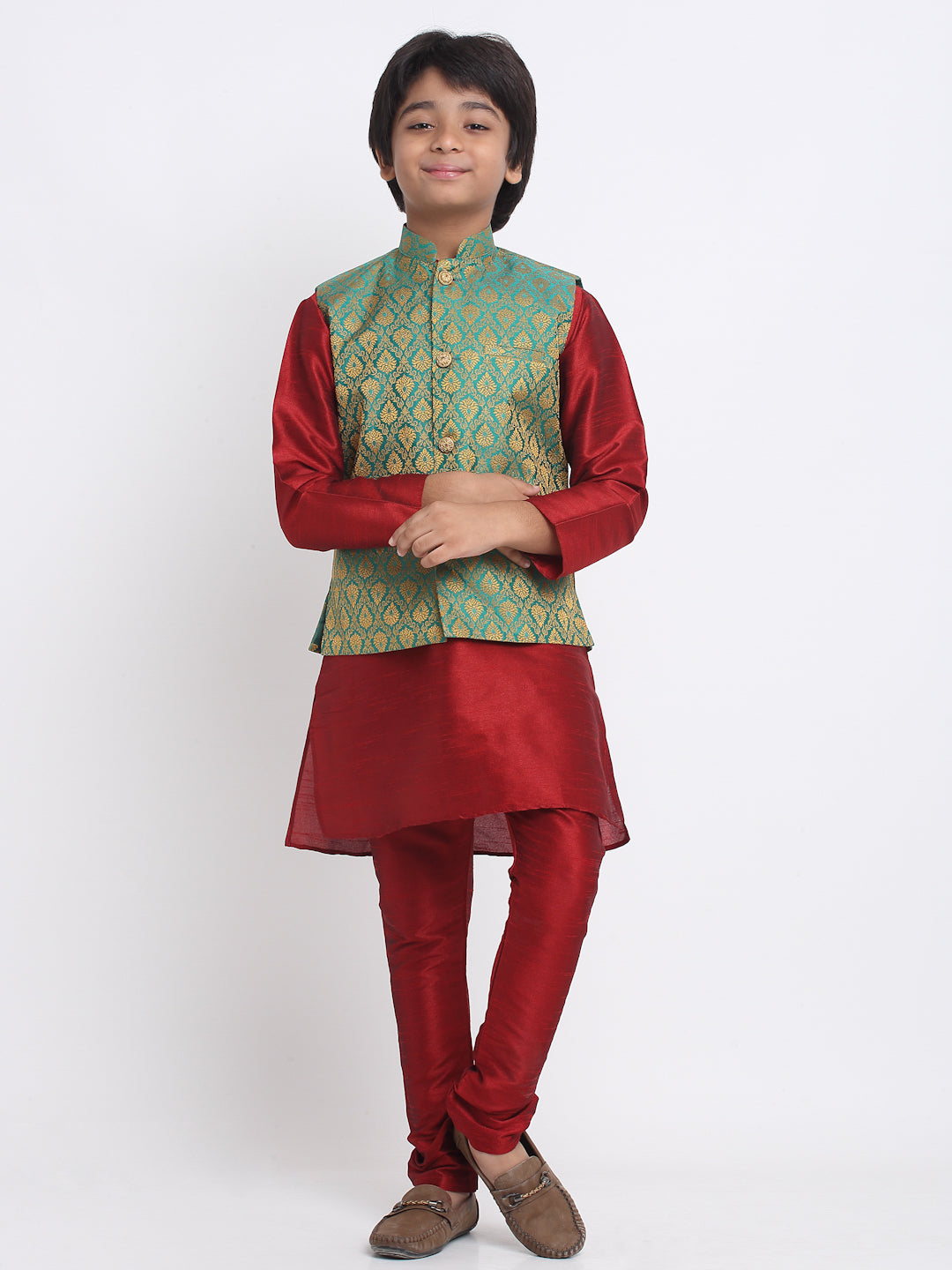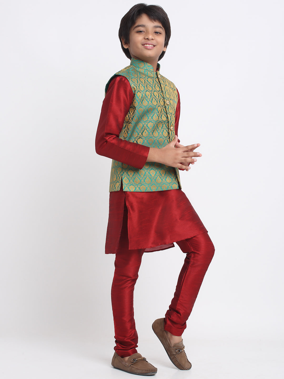 KRAFT INDIA Boys Maroon Silk Blend Kurta and Churidar with Jacquard Green Nehru jacket