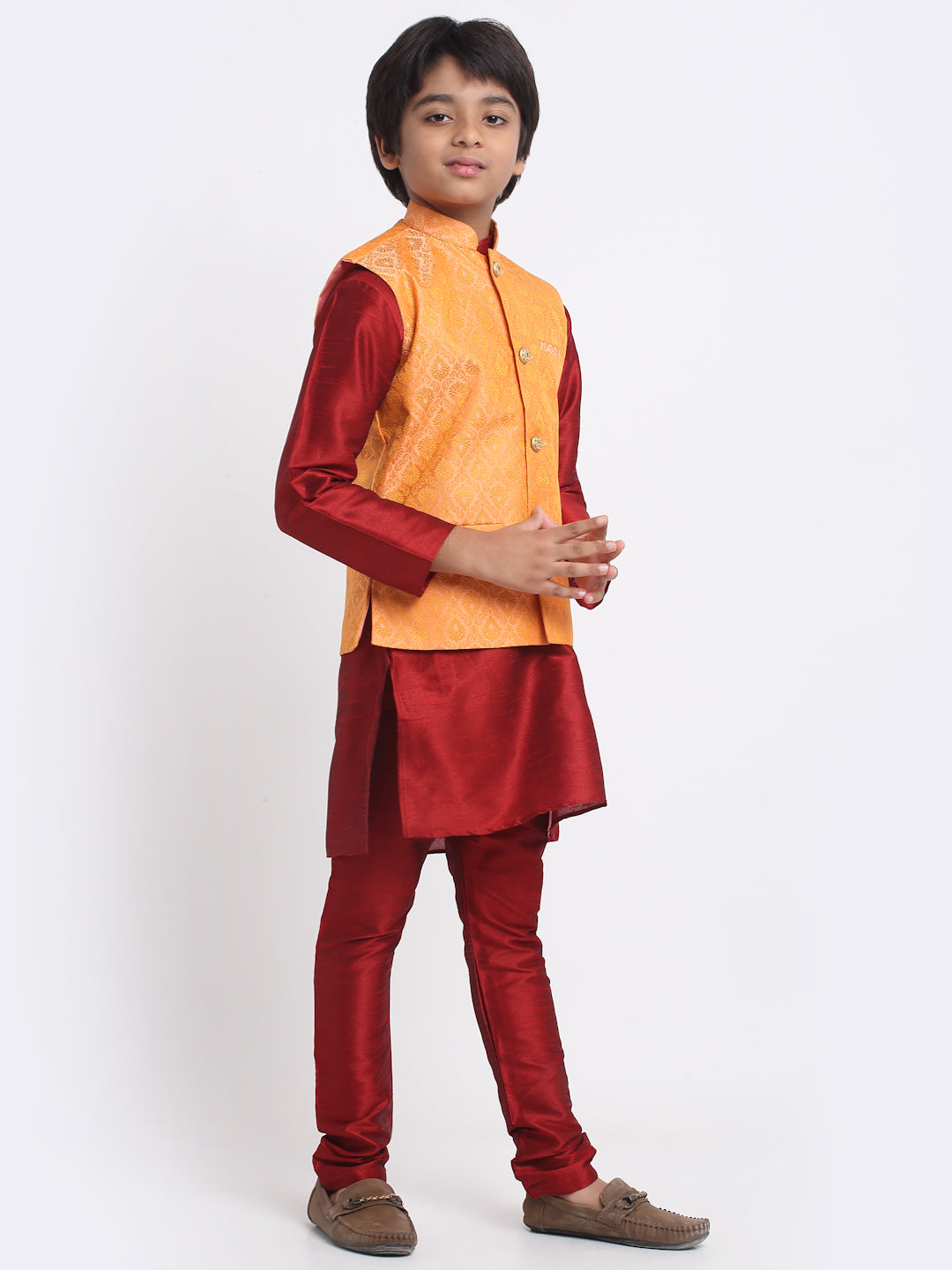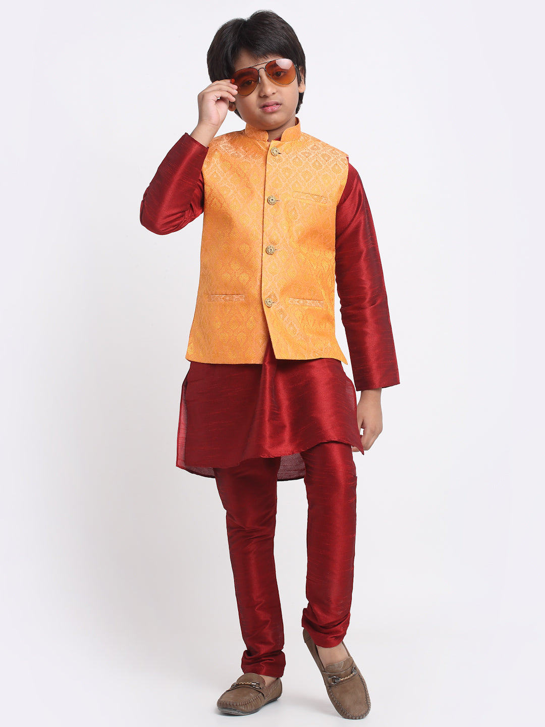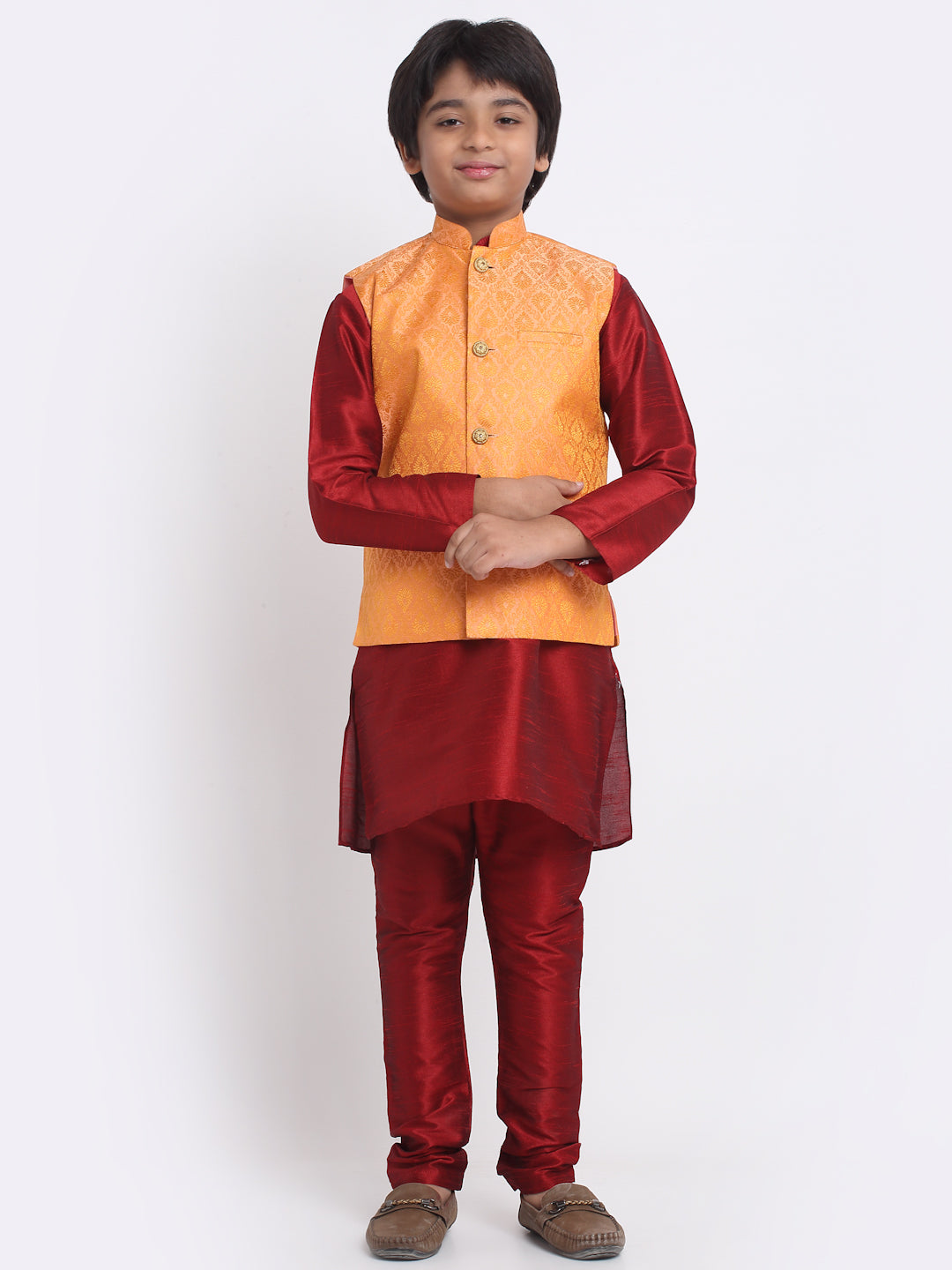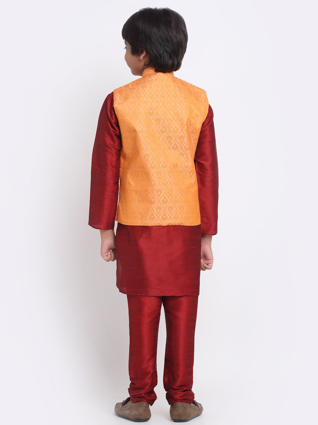 KRAFT INDIA Boys Maroon Silk Blend Kurta and Churidar with Jacquard Peach Nehru jacket
