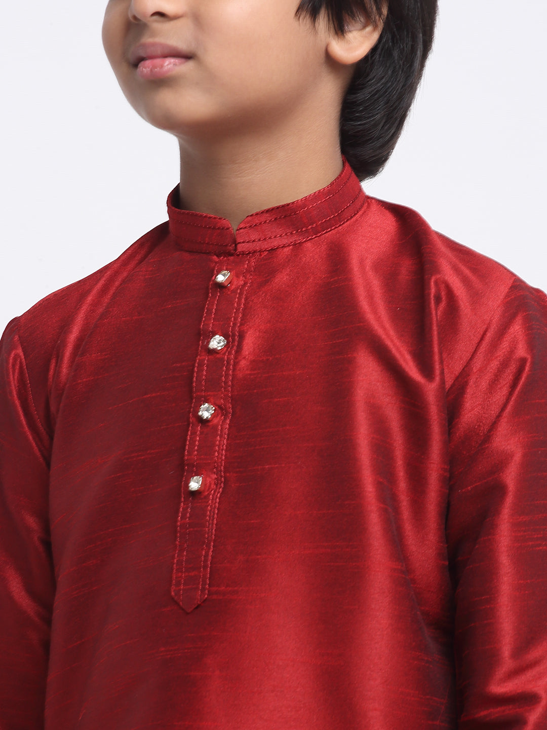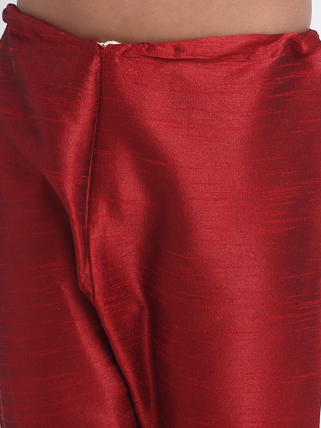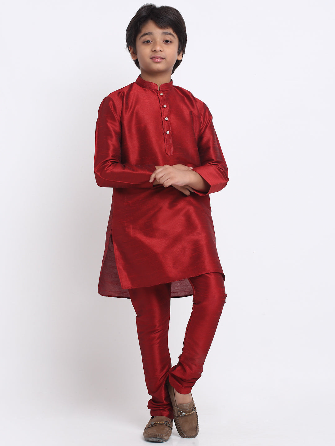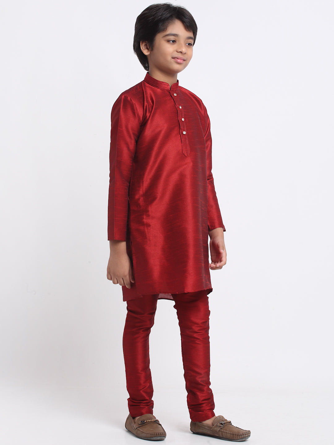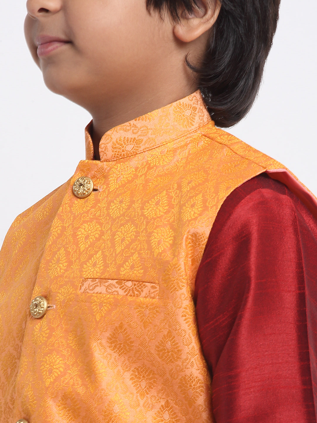 KRAFT INDIA Boys Maroon Silk Blend Kurta and Churidar with Jacquard Peach Nehru jacket