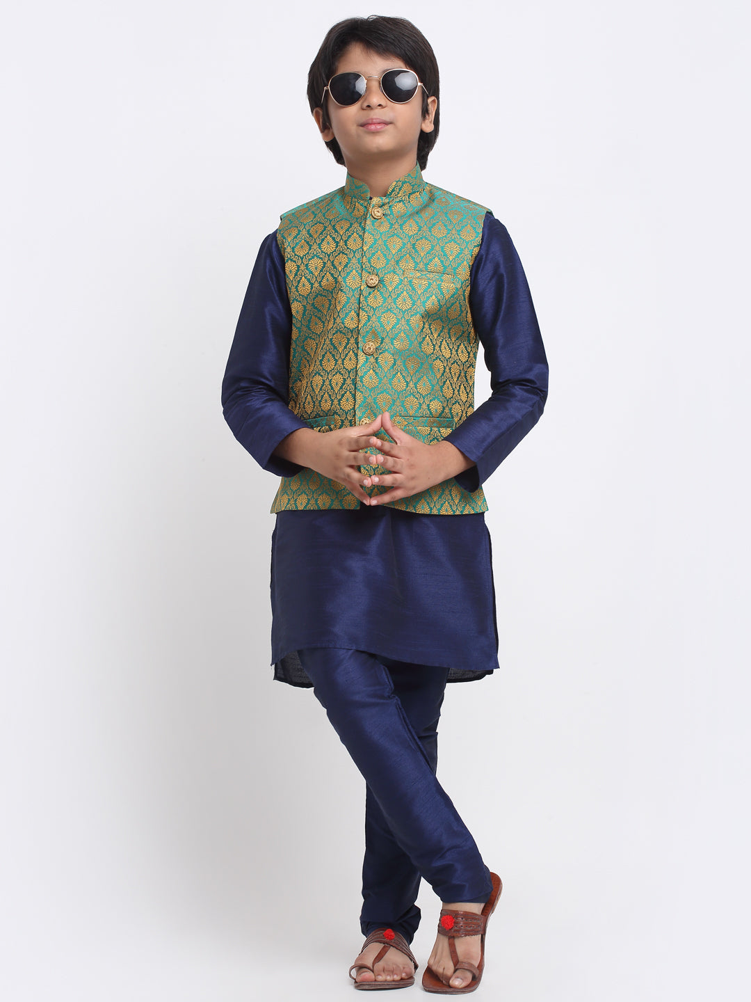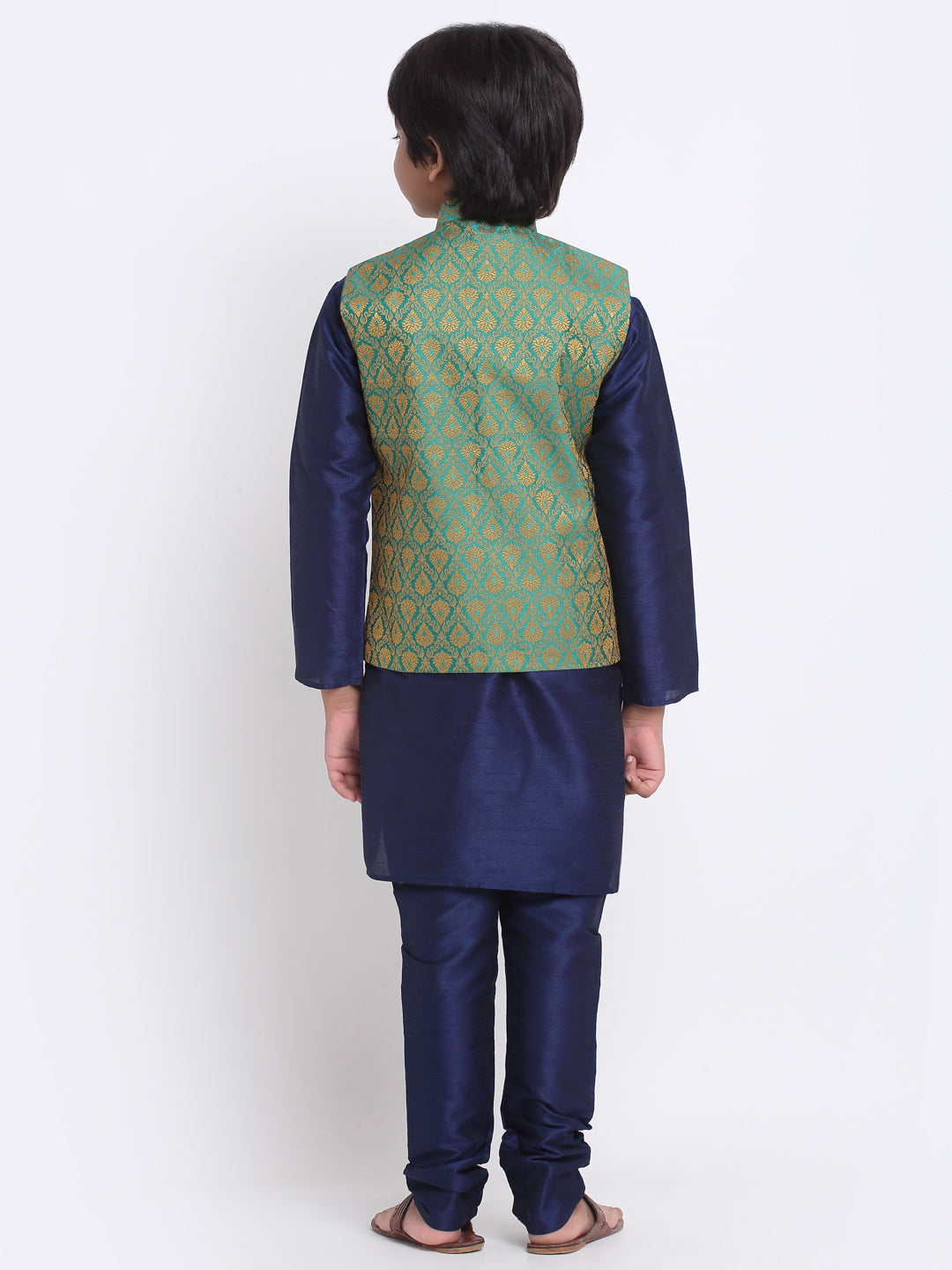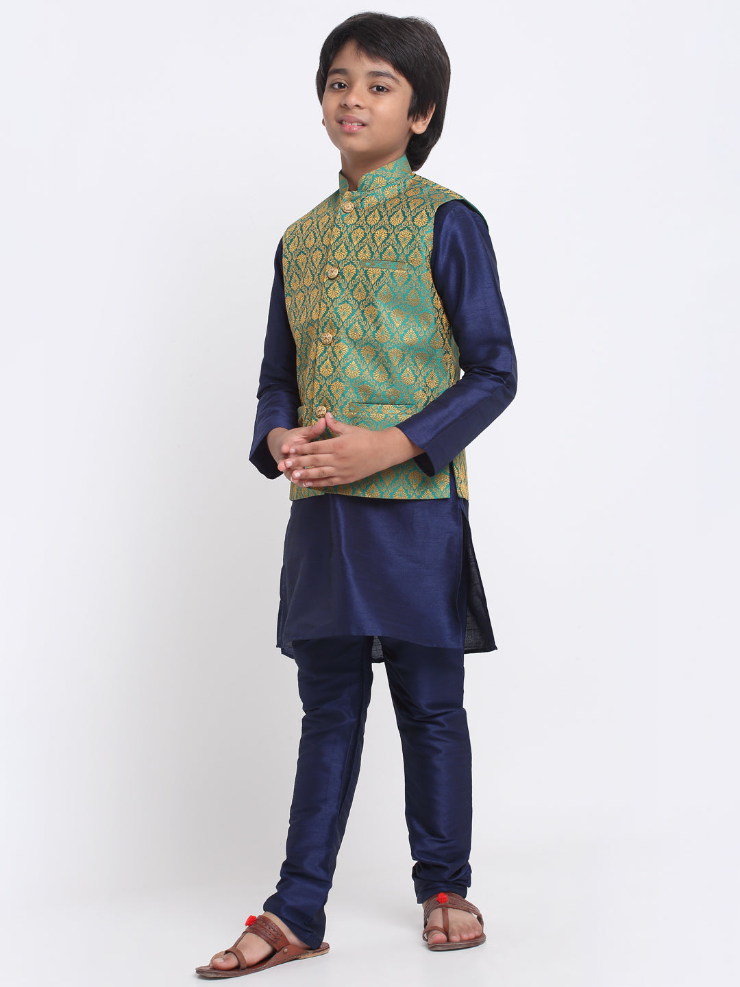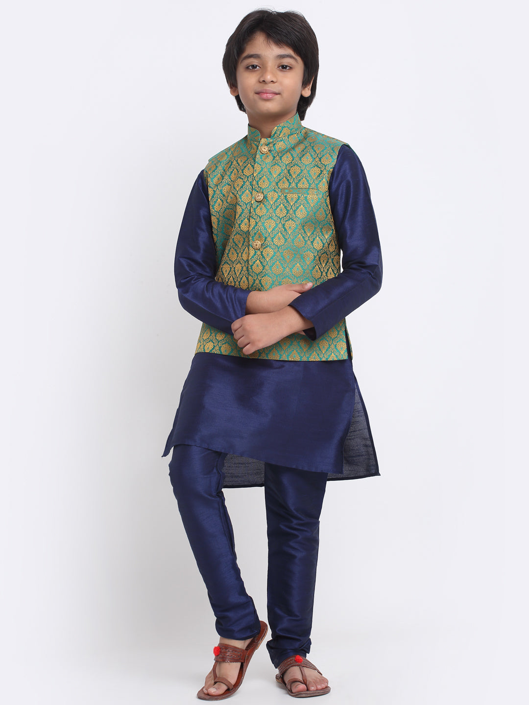 KRAFT INDIA Boys Navy Blue Silk Blend Kurta and Churidar with Jacquard Green Nehru jacket
