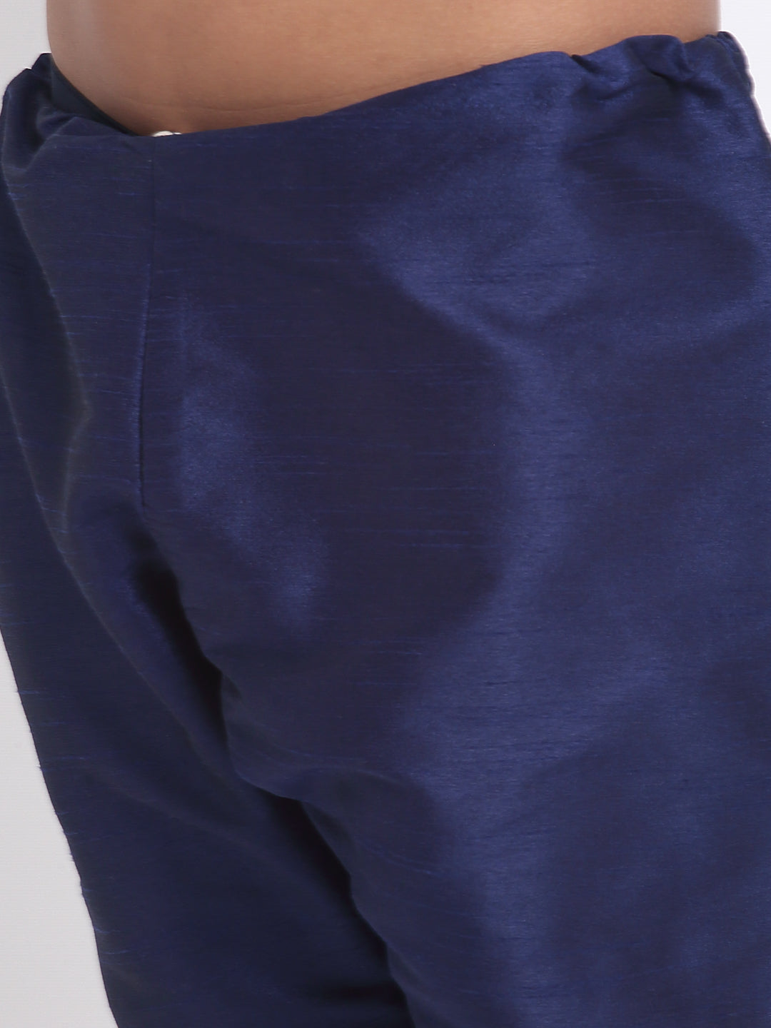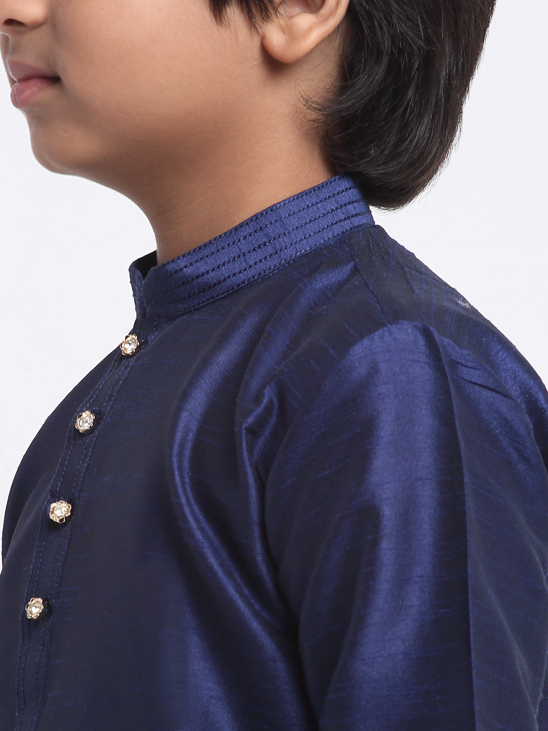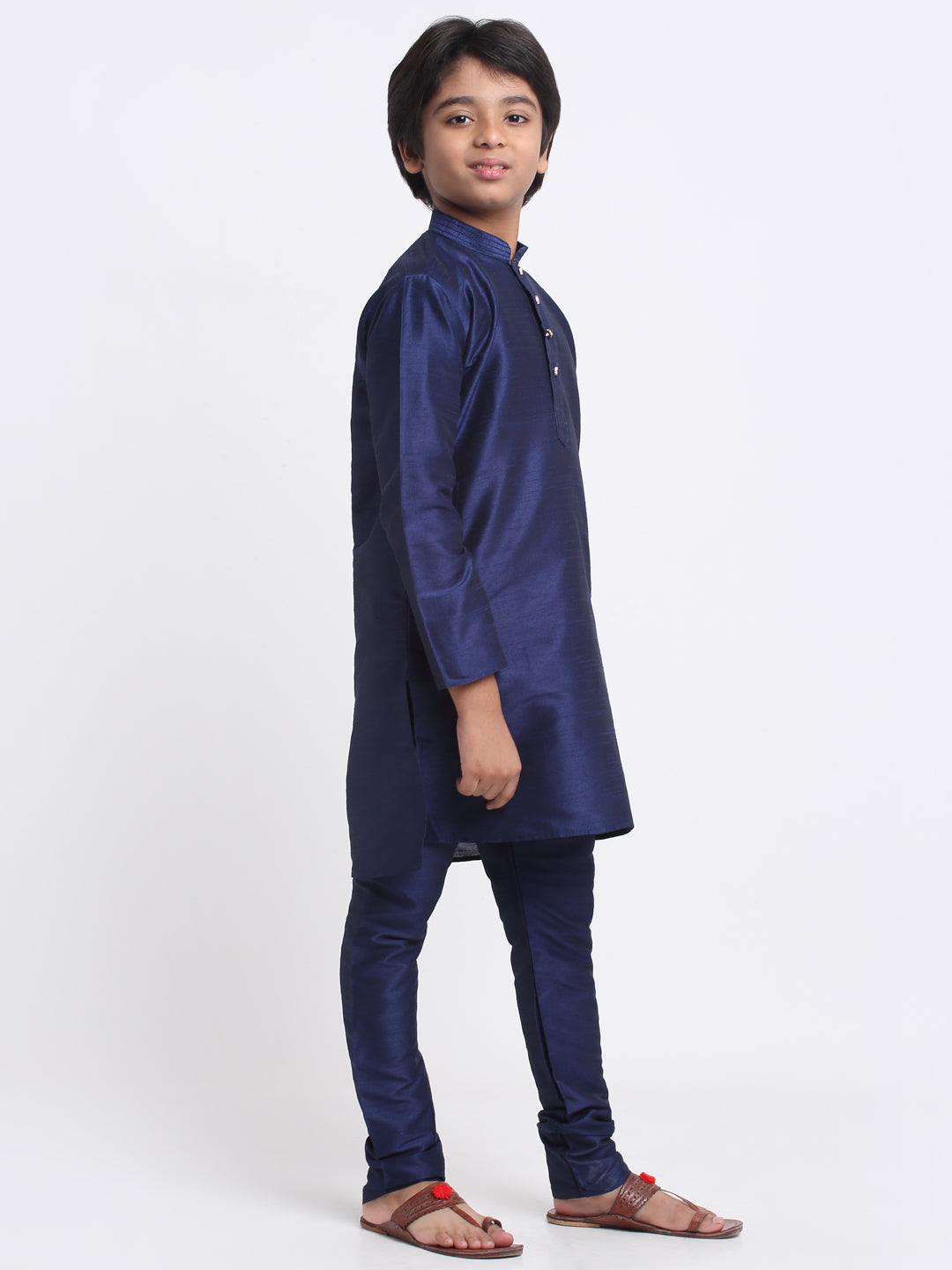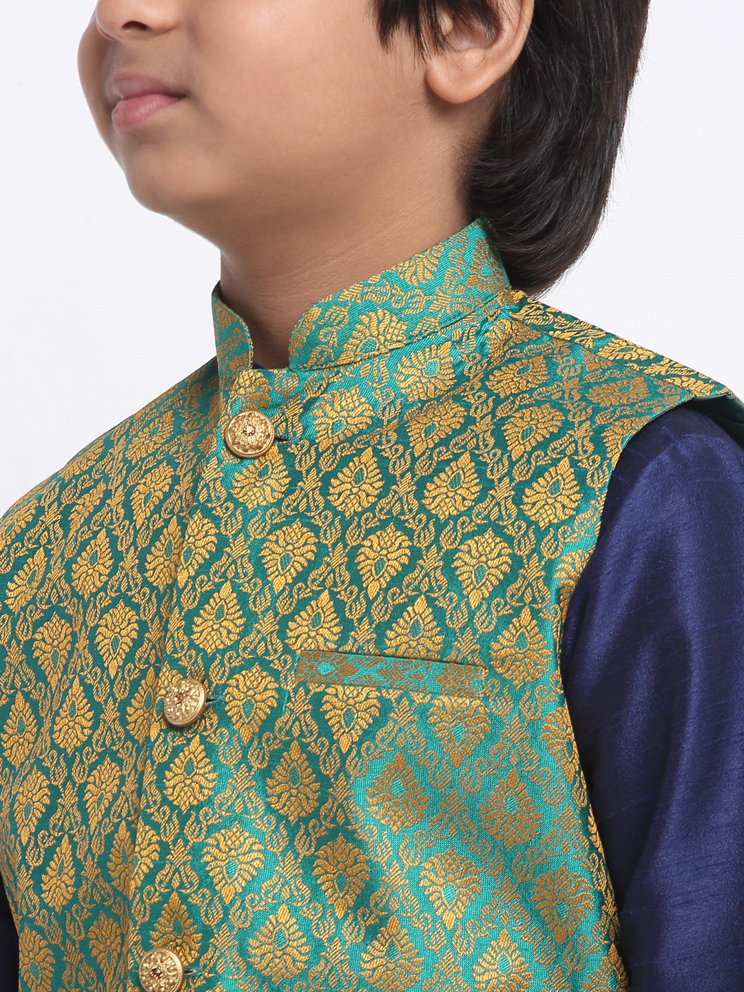 KRAFT INDIA Boys Navy Blue Silk Blend Kurta and Churidar with Jacquard Green Nehru jacket
