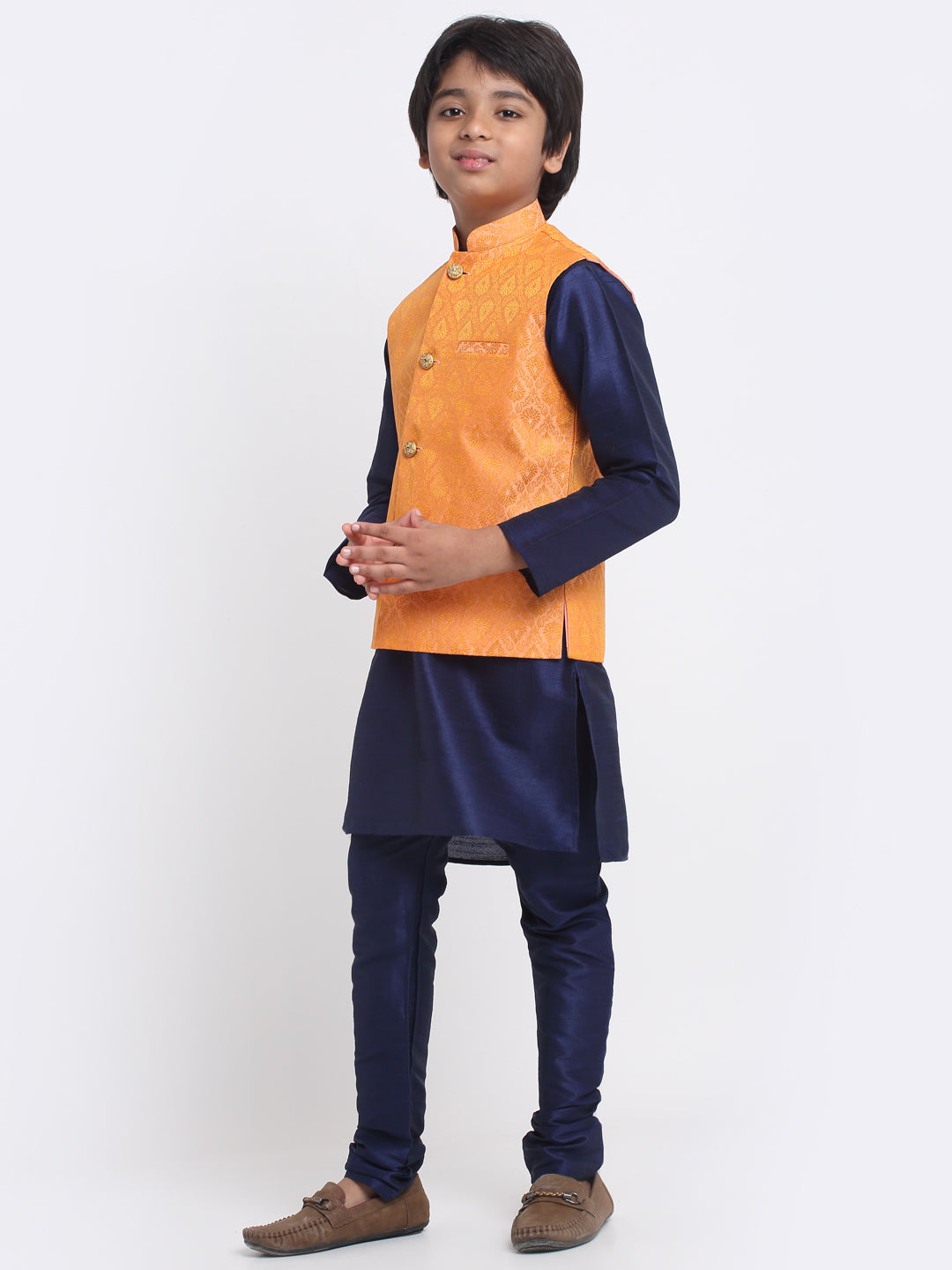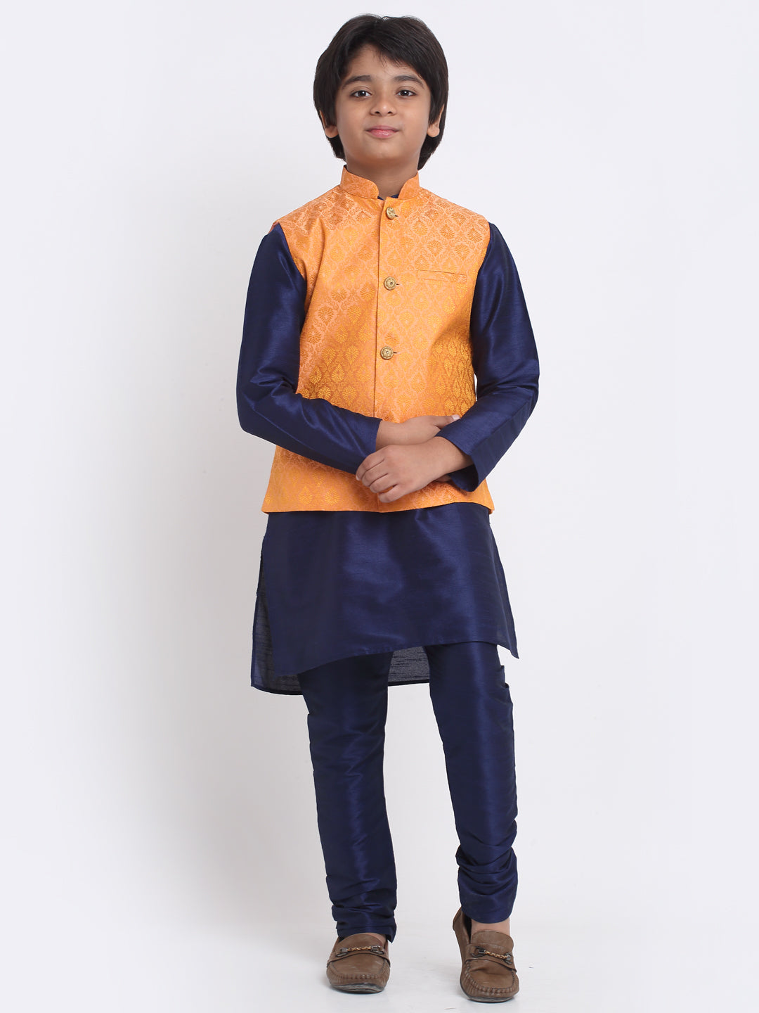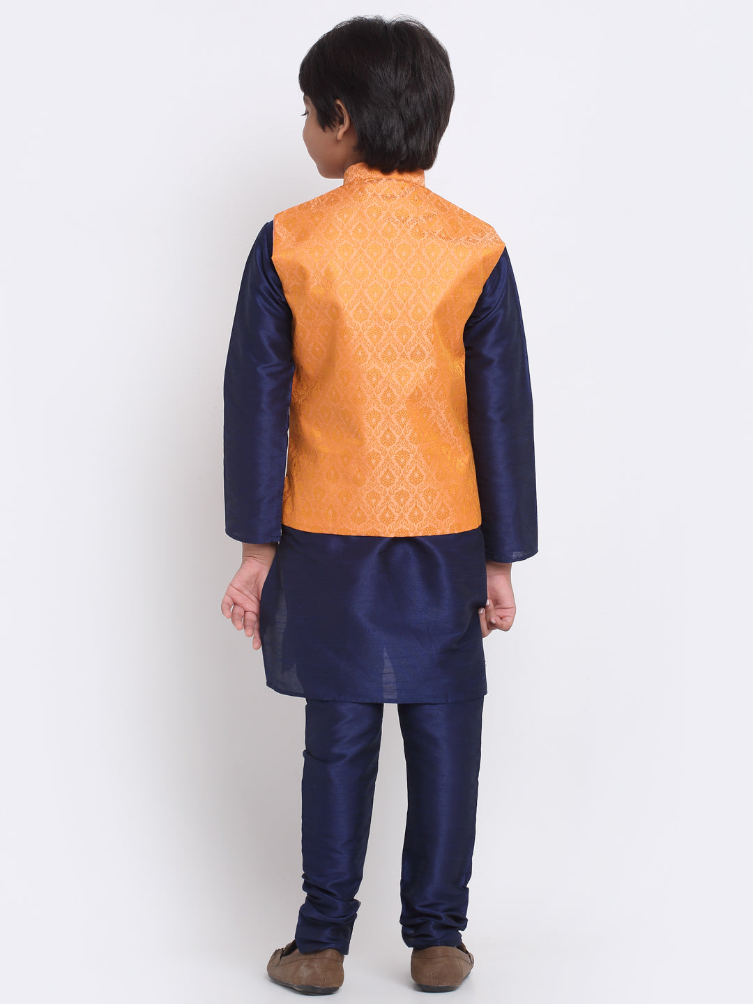 KRAFT INDIA Boys Navy Blue Silk Blend Kurta and Churidar with Jacquard Peach Nehru jacket