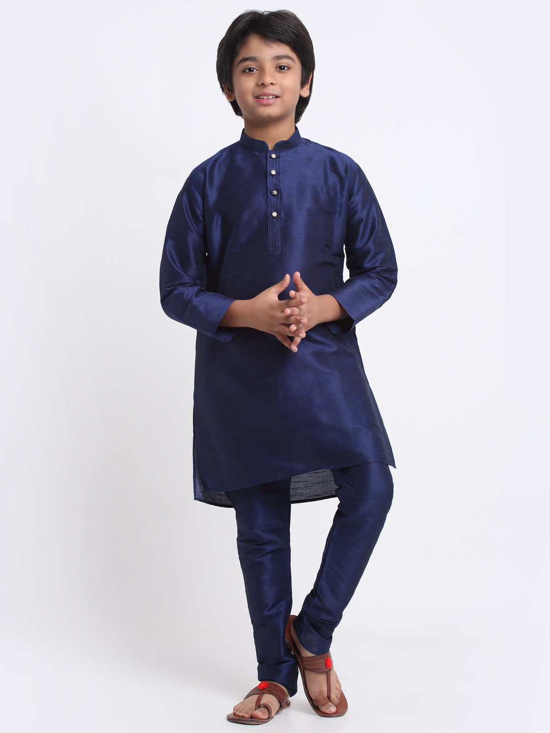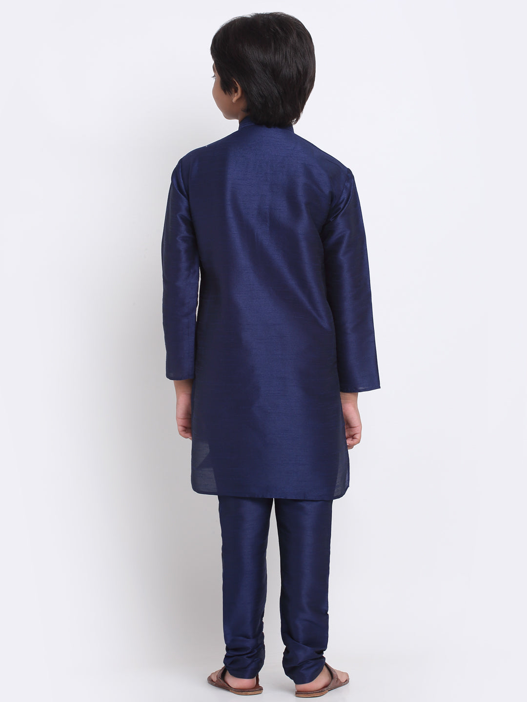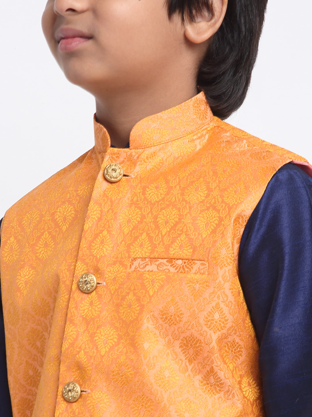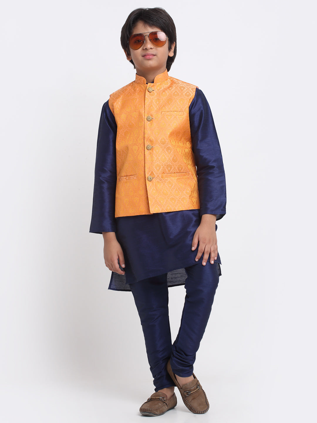 KRAFT INDIA Boys Navy Blue Silk Blend Kurta and Churidar with Jacquard Peach Nehru jacket