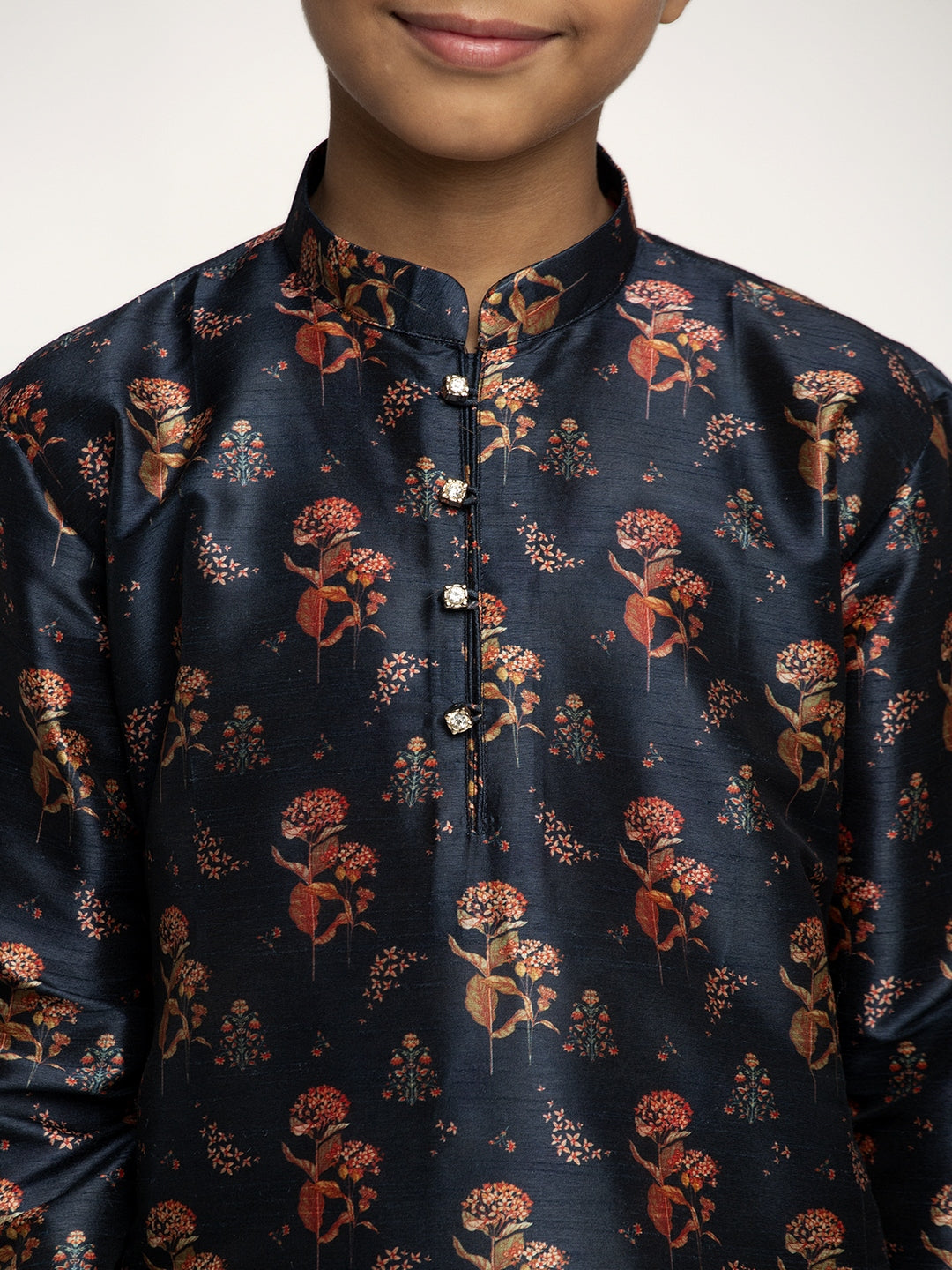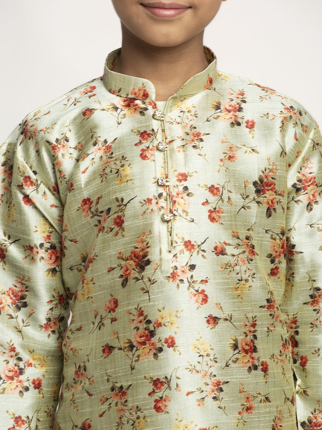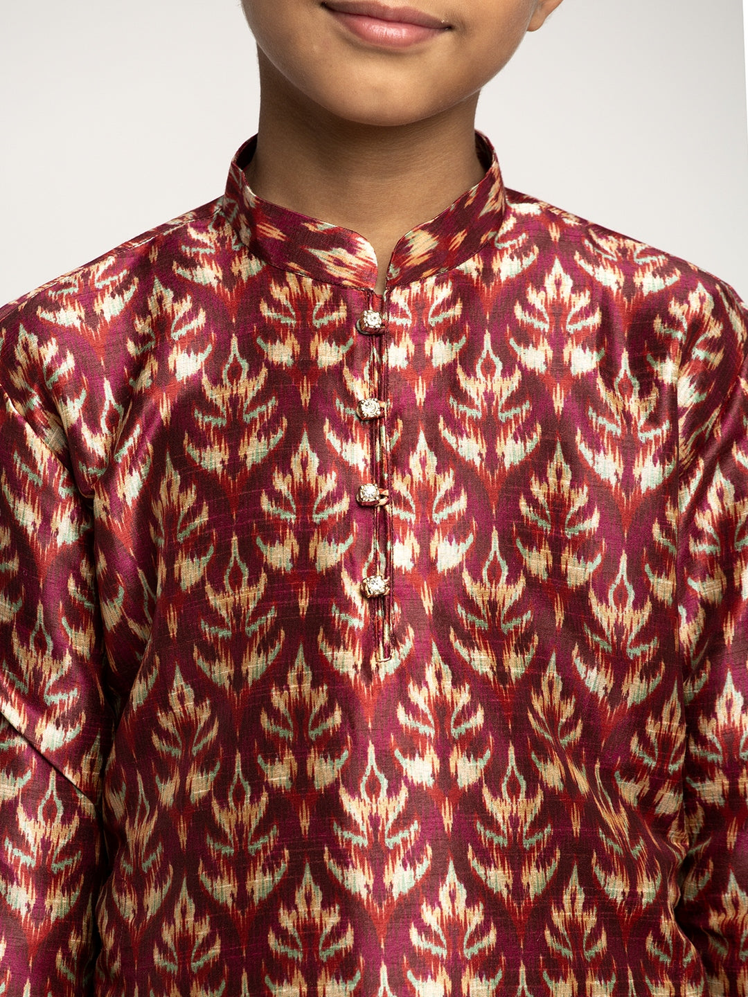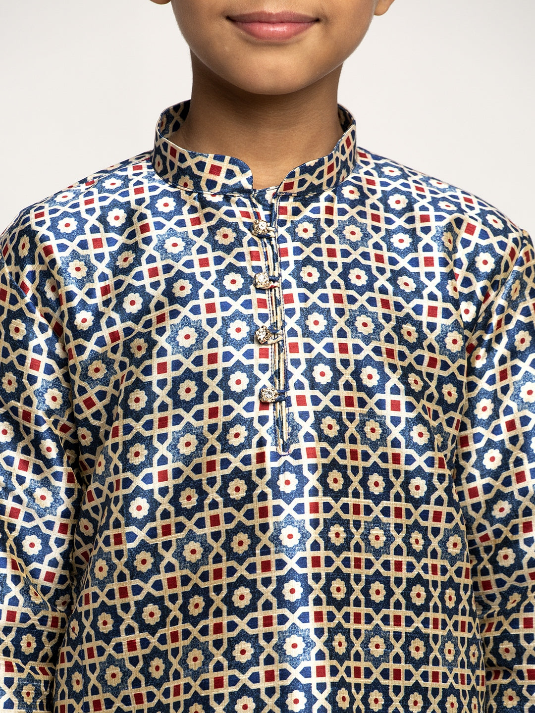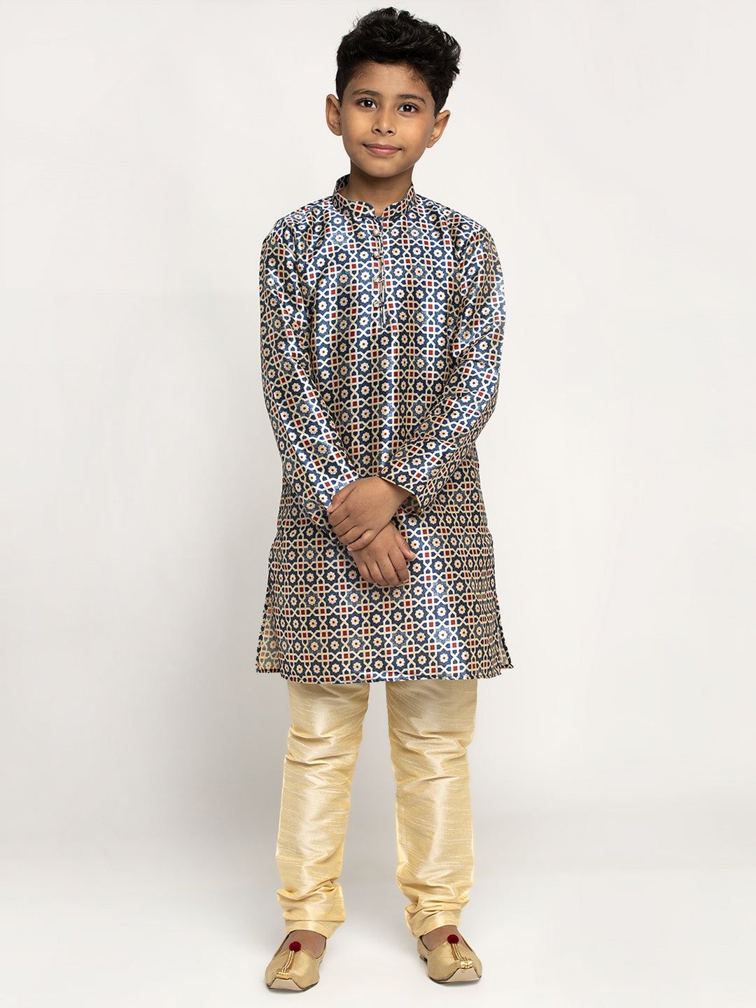 Boy's Printed straight knee length kurta has a mandarin collar, long sleeves, straight hem, button closure, side slits with drawstring closure churidar.