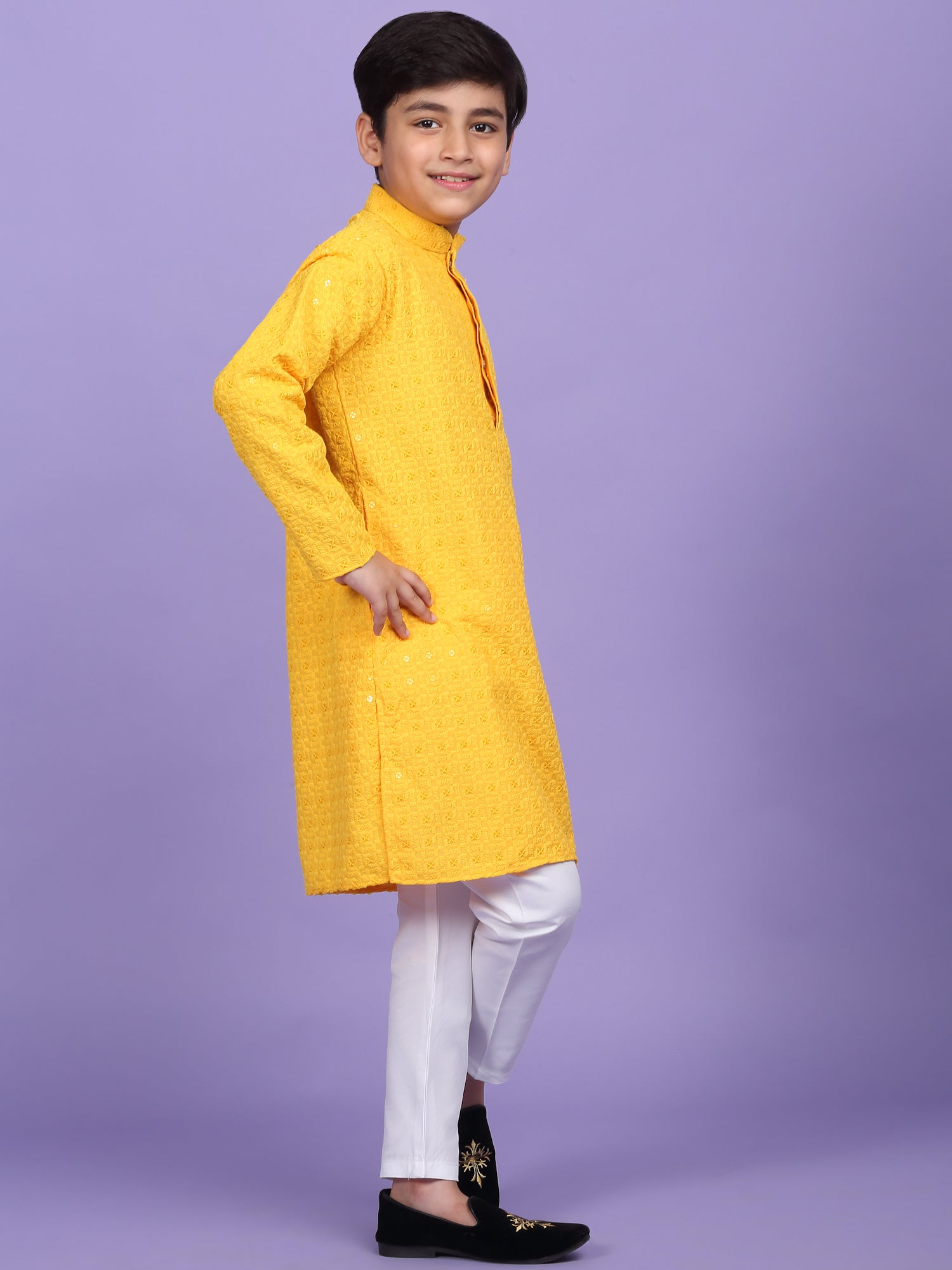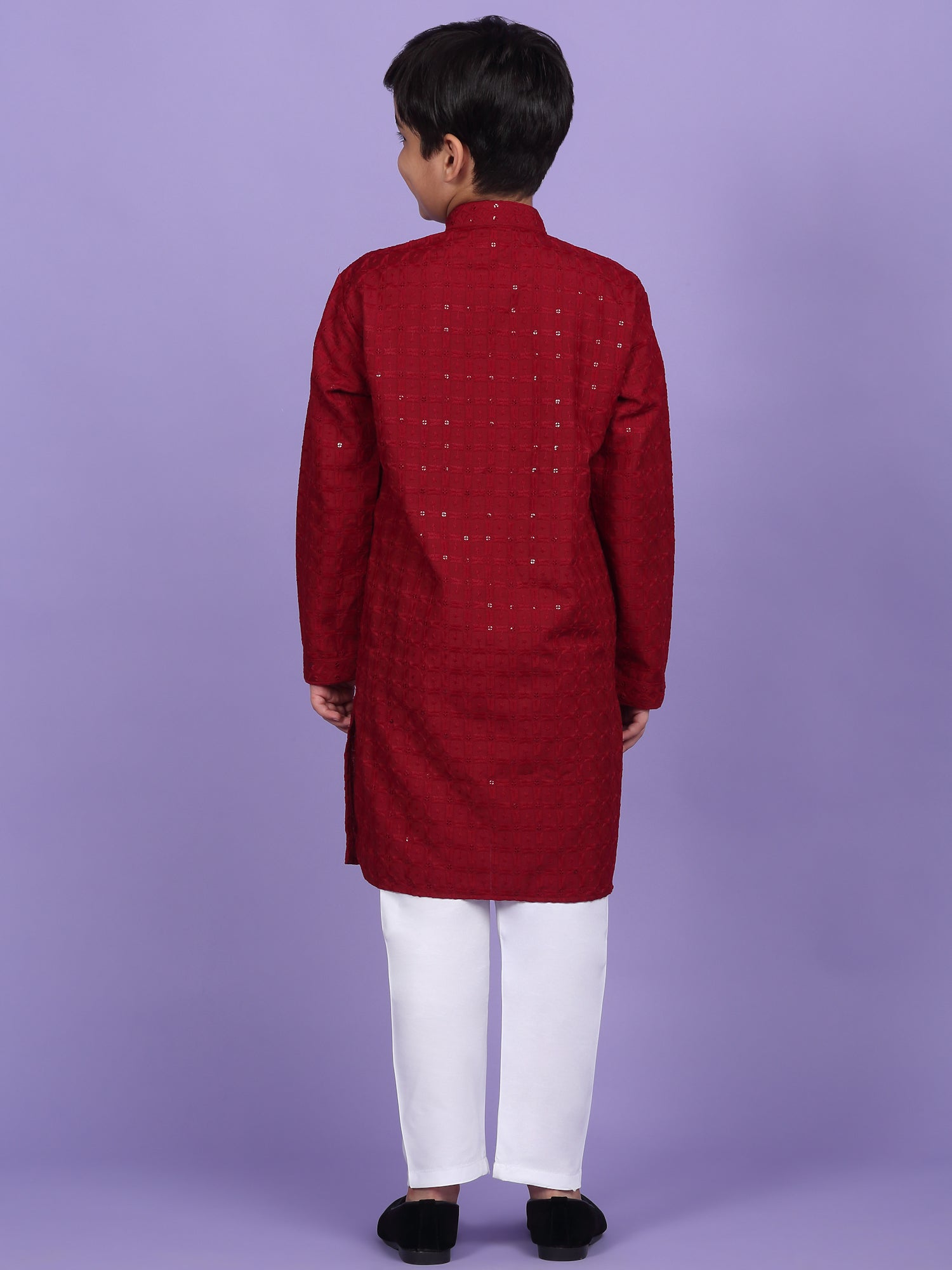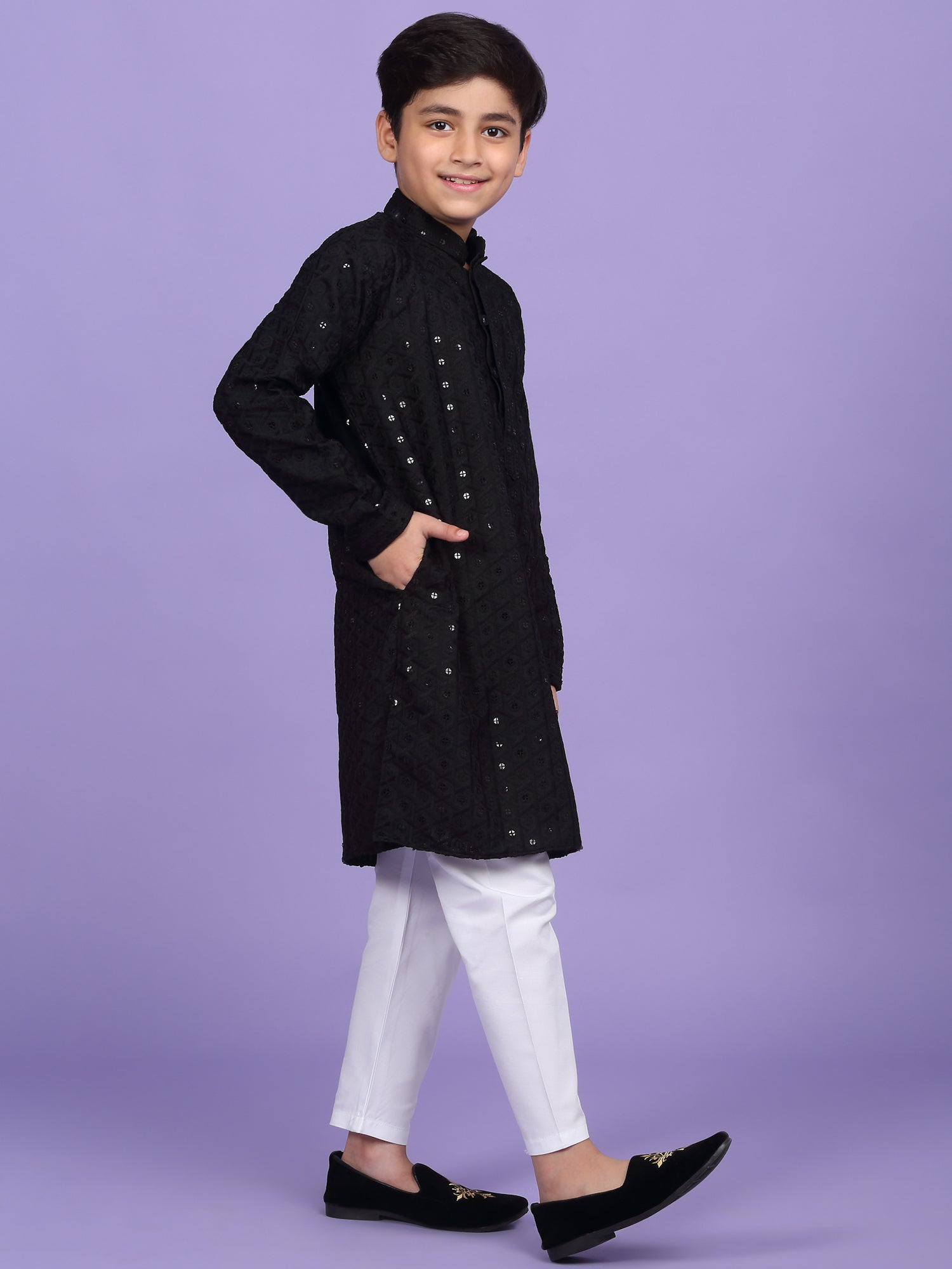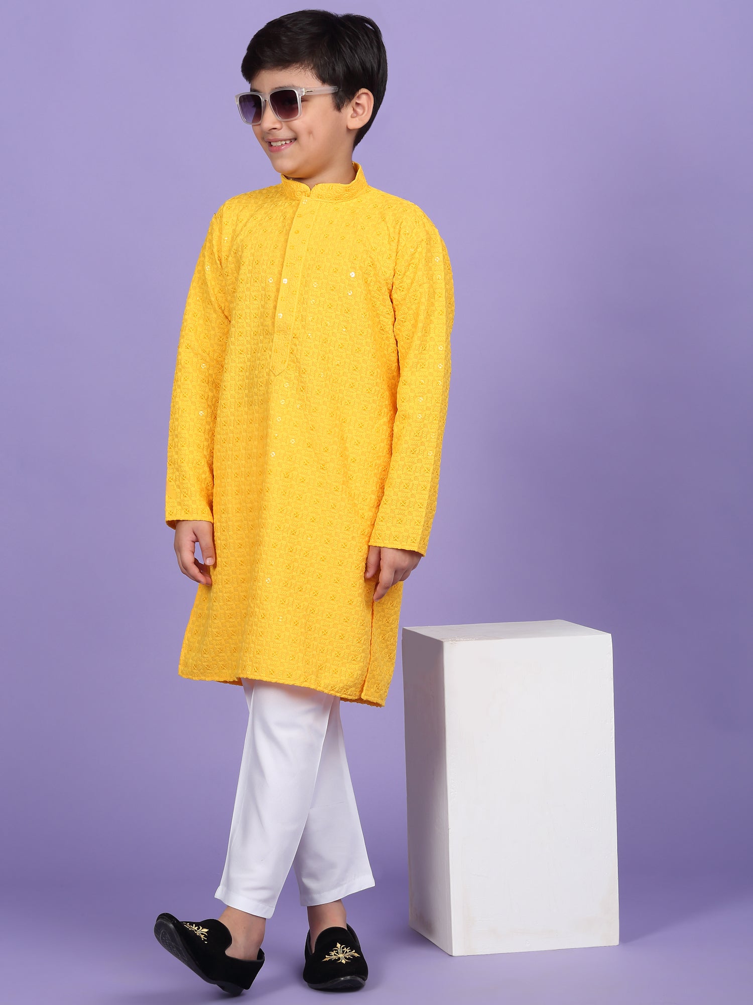 Add a traditional twist to your child's festive wardrobe with this charming Chikan Sequin Kurta and Pyjama Set. Crafted from soft, breathable cotton, the kurta features elegant Chikan embroidery with subtle sequin highlights, offering a perfect blend of tradition and shimmer. It comes with a Mandarin collar, long sleeves, side pockets, and a straight hemline, making it both functional and stylish. Paired with a classic white pyjama, this set is ideal for festivals, weddings, and cultural occasions.