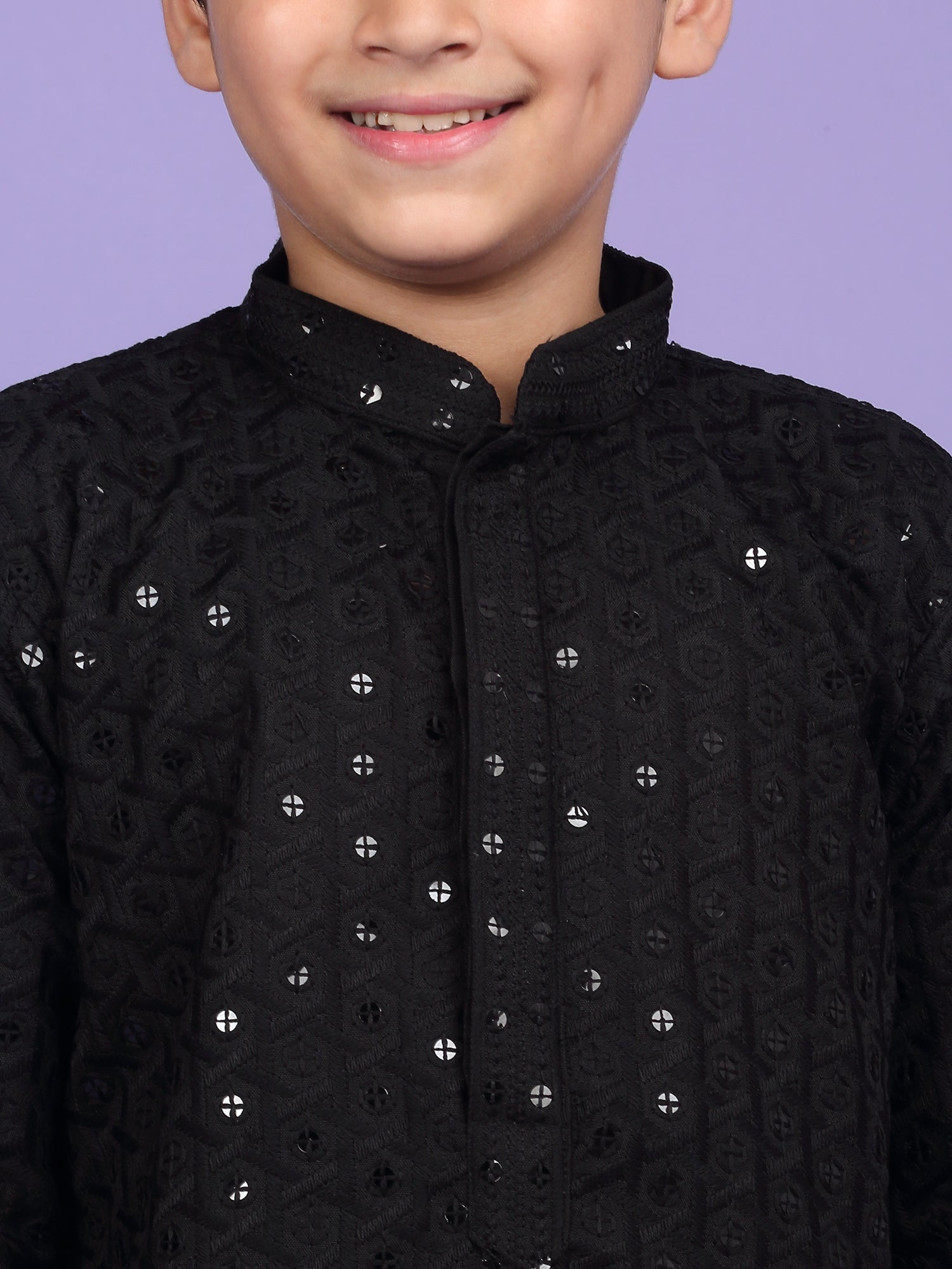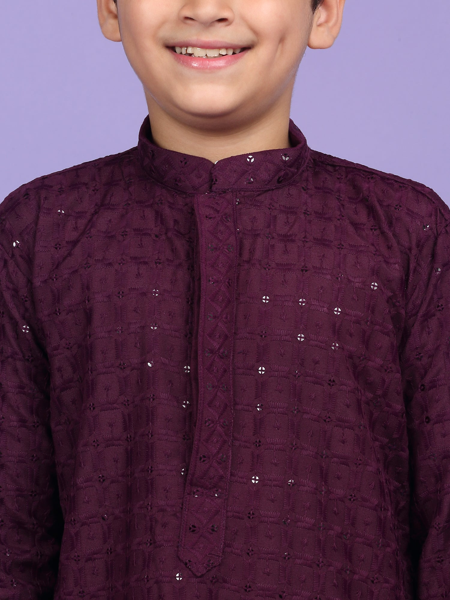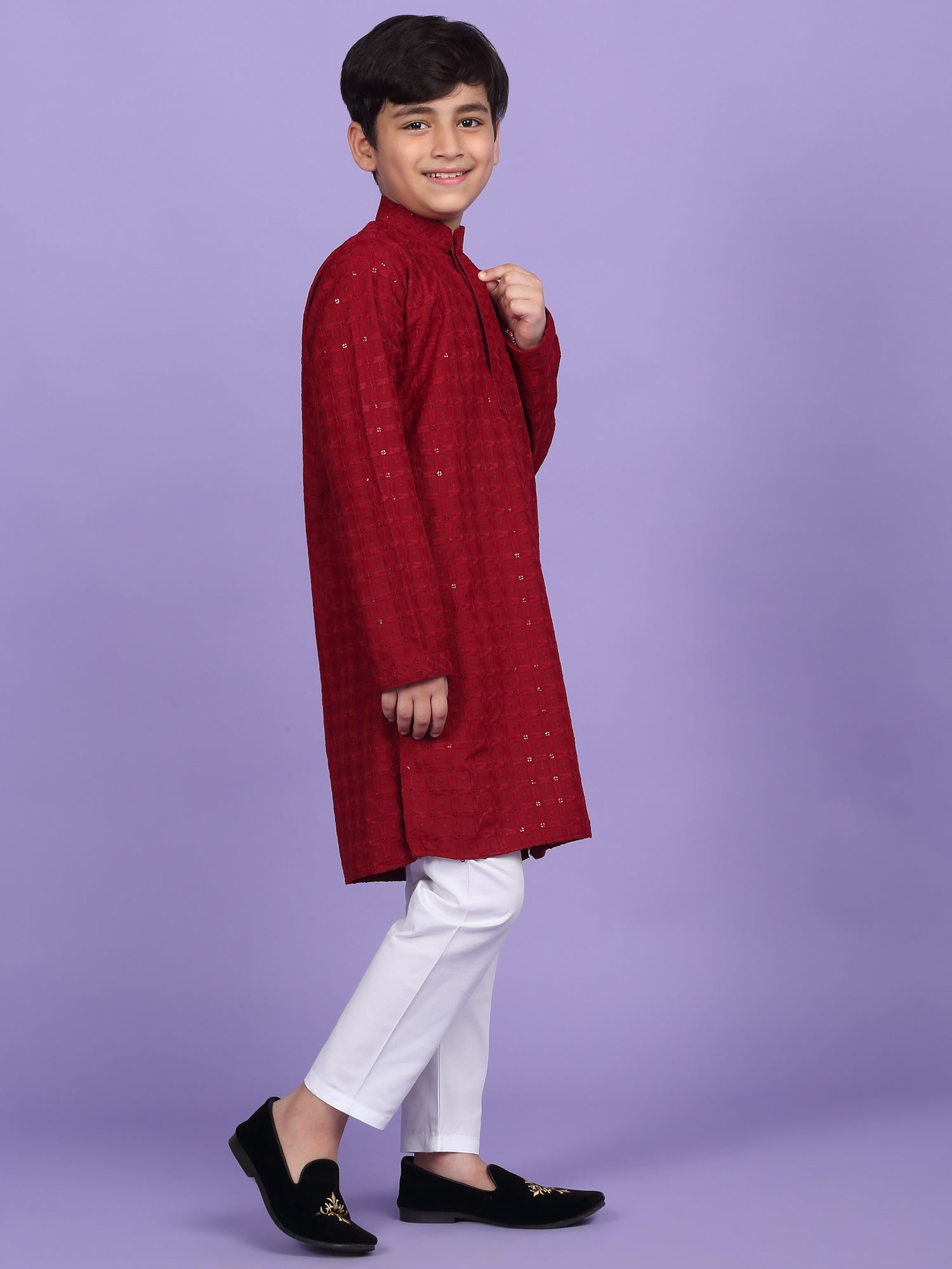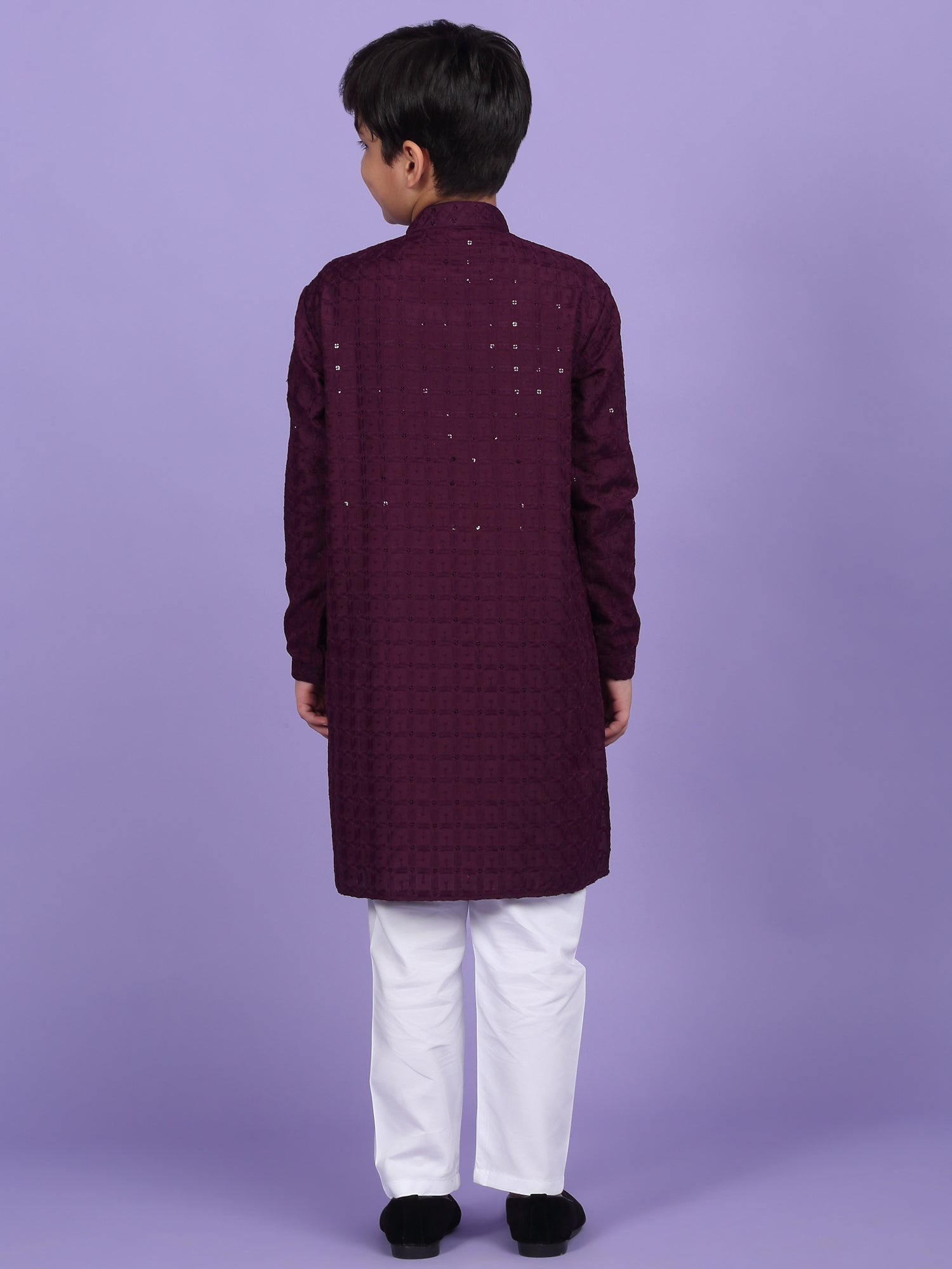 Add a traditional twist to your child's festive wardrobe with this charming Chikan Sequin Kurta and Pyjama Set. Crafted from soft, breathable cotton, the kurta features elegant Chikan embroidery with subtle sequin highlights, offering a perfect blend of tradition and shimmer. It comes with a Mandarin collar, long sleeves, side pockets, and a straight hemline, making it both functional and stylish. Paired with a classic white pyjama, this set is ideal for festivals, weddings, and cultural occasions.