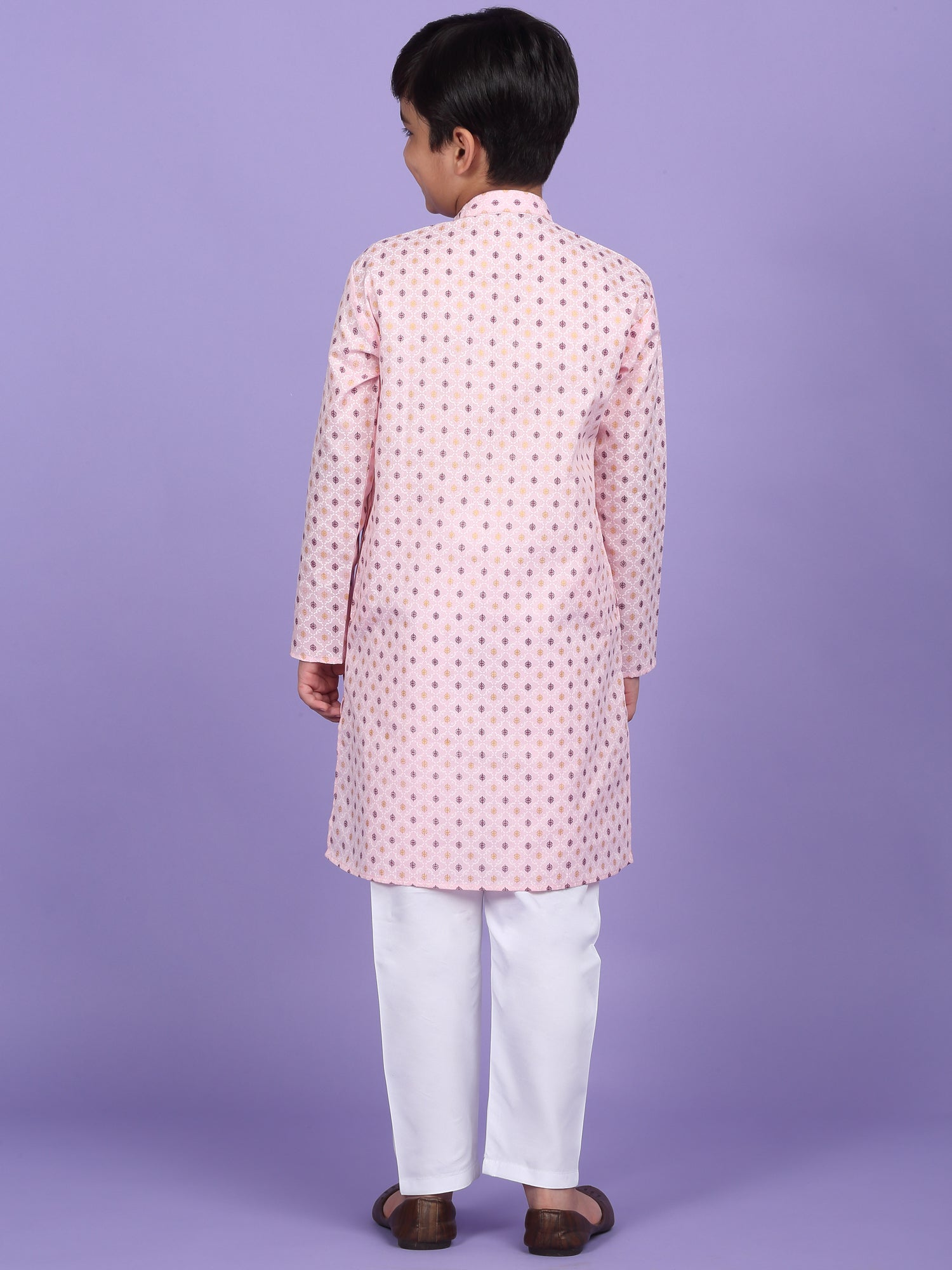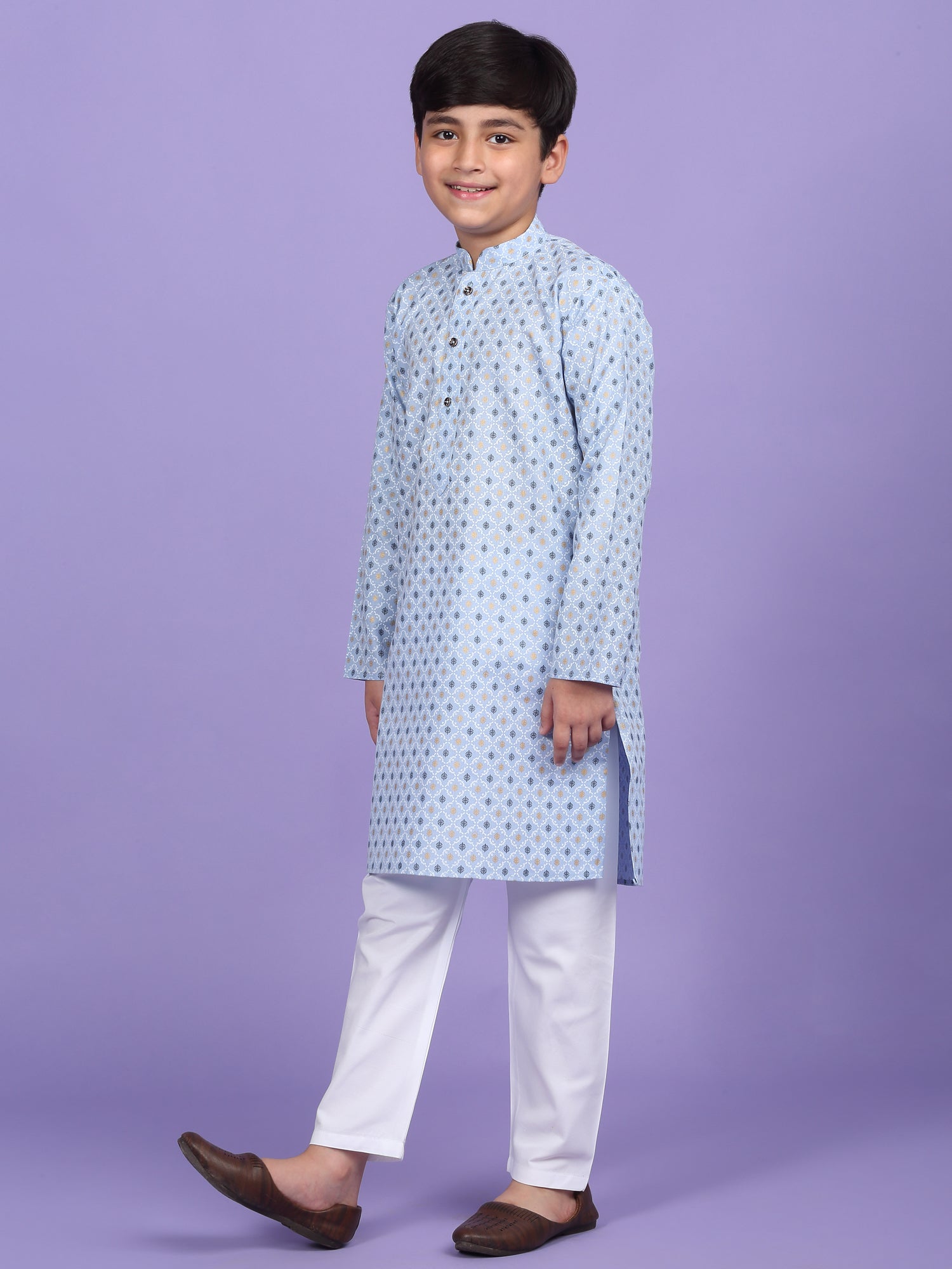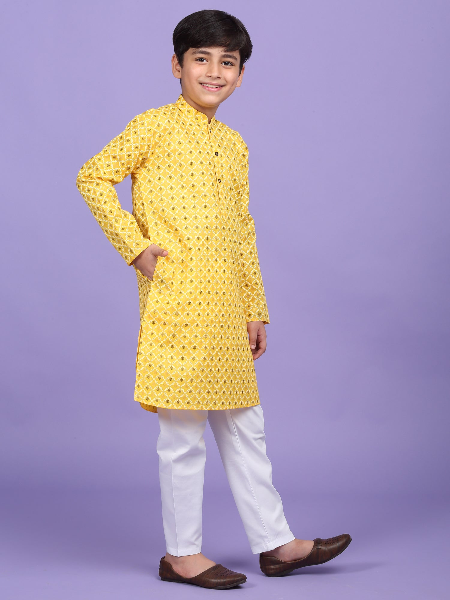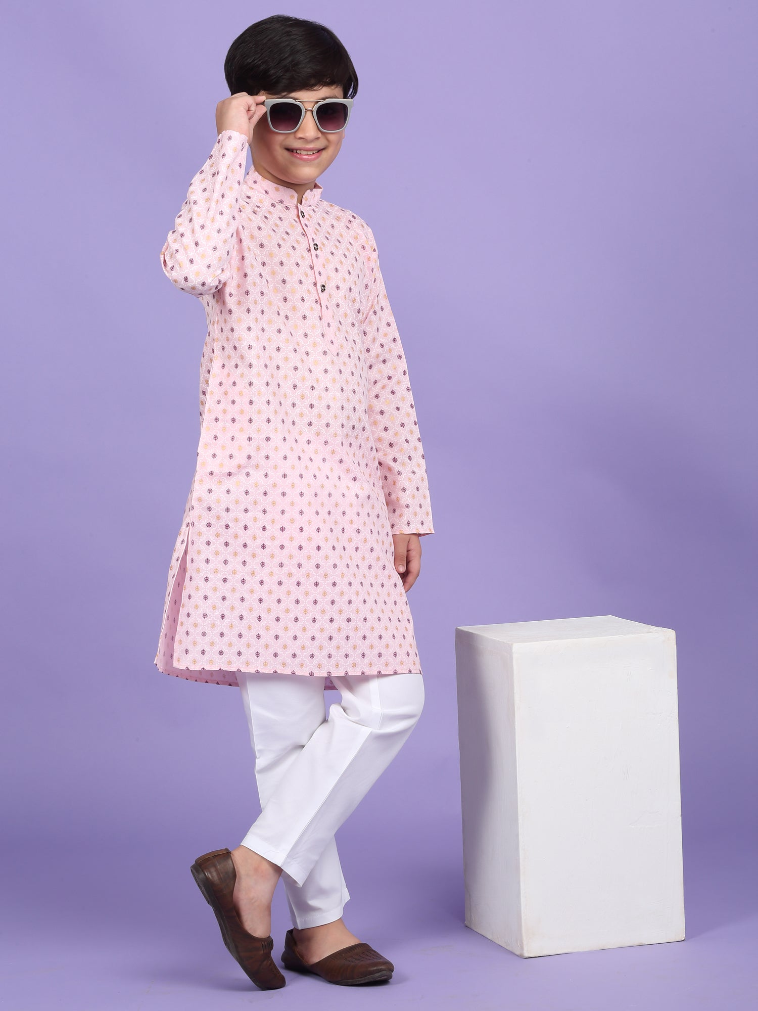 Brighten up your child's festive wardrobe with this charming Floral Printed Kurta and Pyjama Set. Made from soft and breathable cotton, the kurta features an all-over floral print that adds a fresh, vibrant touch. Designed with a Mandarin collar, long sleeves, button front, and side pockets, it offers a perfect blend of comfort and ethnic elegance. The set is completed with a classic white pyjama, making it ideal for festivals, family functions, and cultural events.