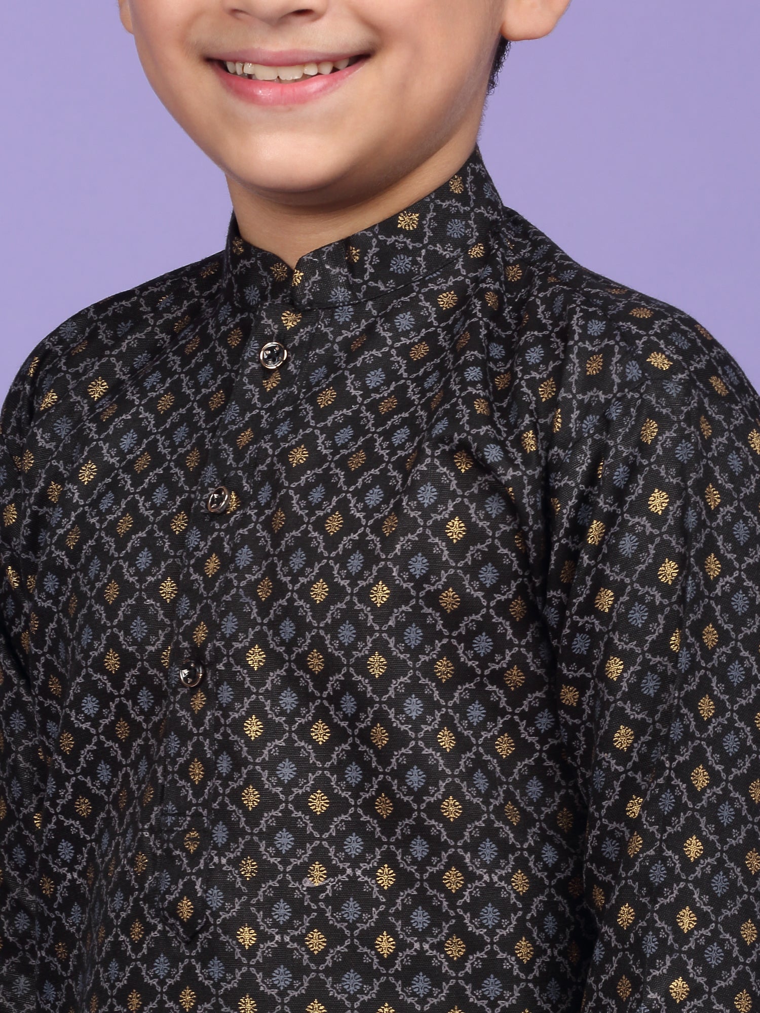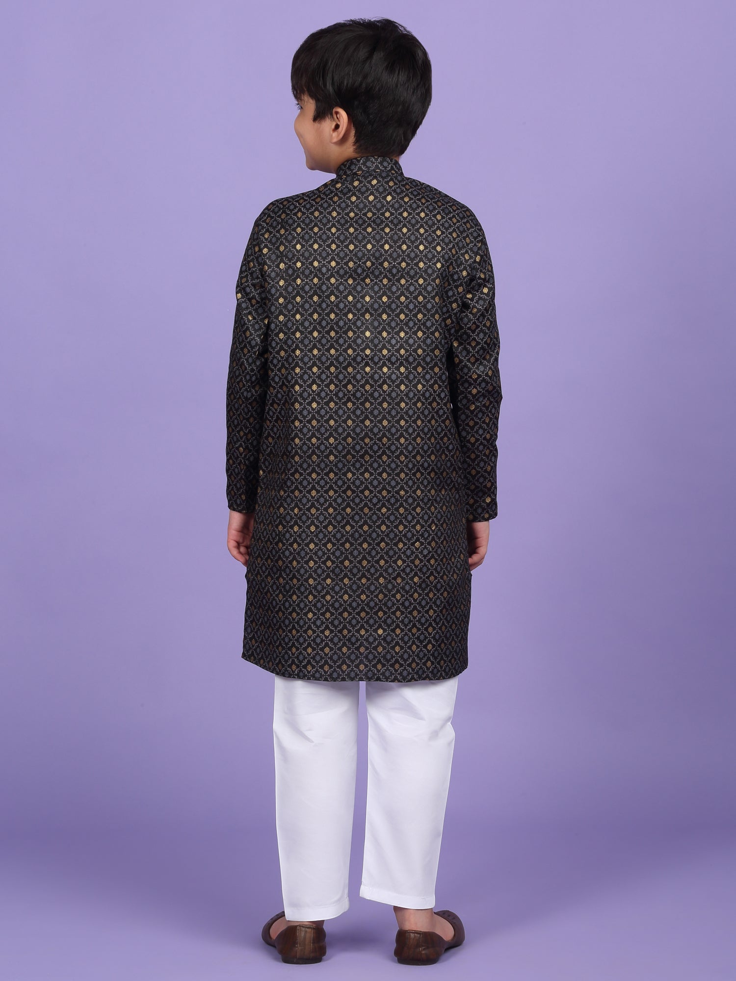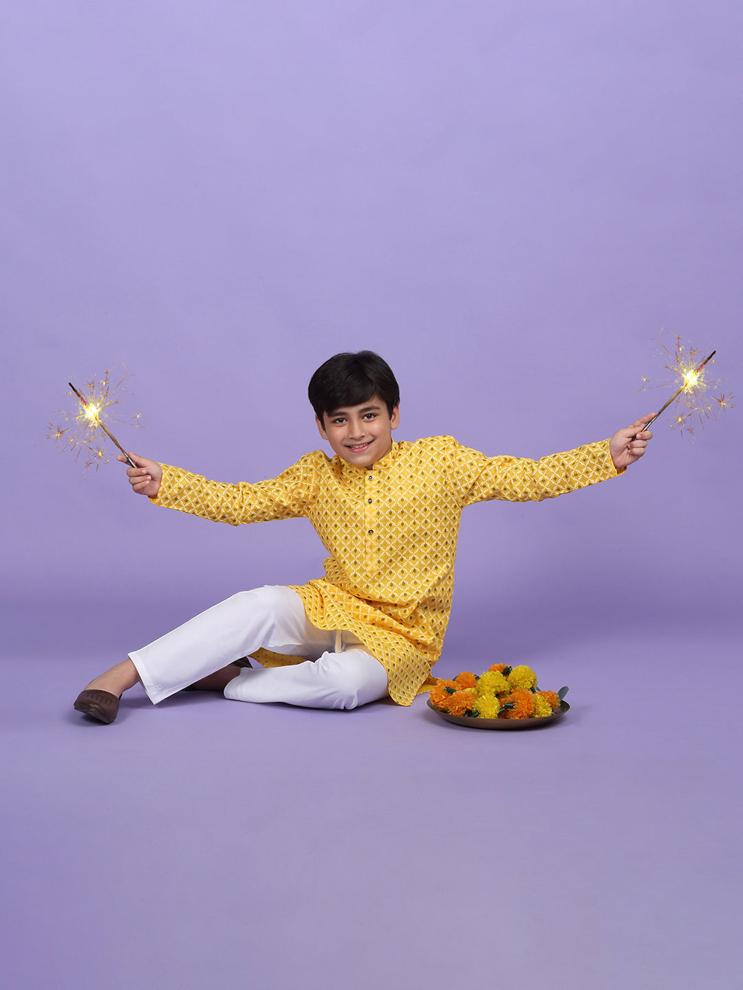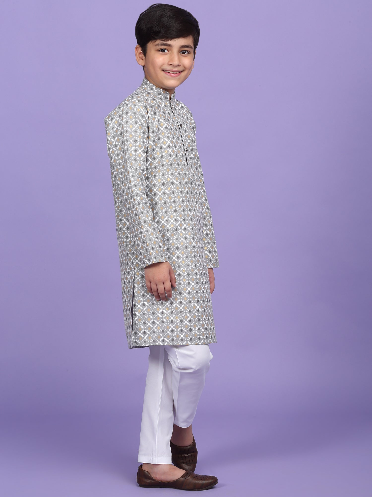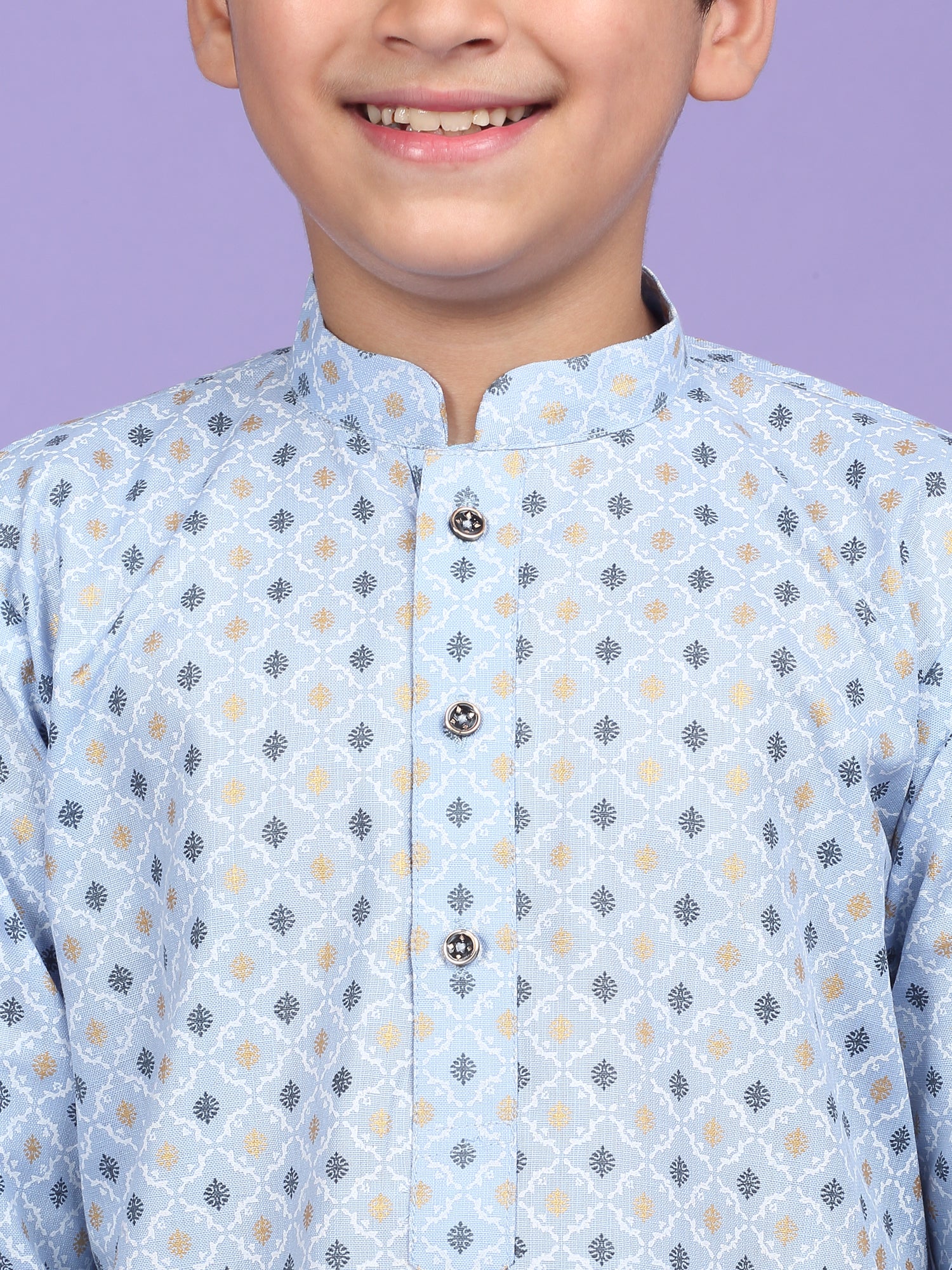Brighten up your child's festive wardrobe with this charming Floral Printed Kurta and Pyjama Set. Made from soft and breathable cotton, the kurta features an all-over floral print that adds a fresh, vibrant touch. Designed with a Mandarin collar, long sleeves, button front, and side pockets, it offers a perfect blend of comfort and ethnic elegance. The set is completed with a classic white pyjama, making it ideal for festivals, family functions, and cultural events.