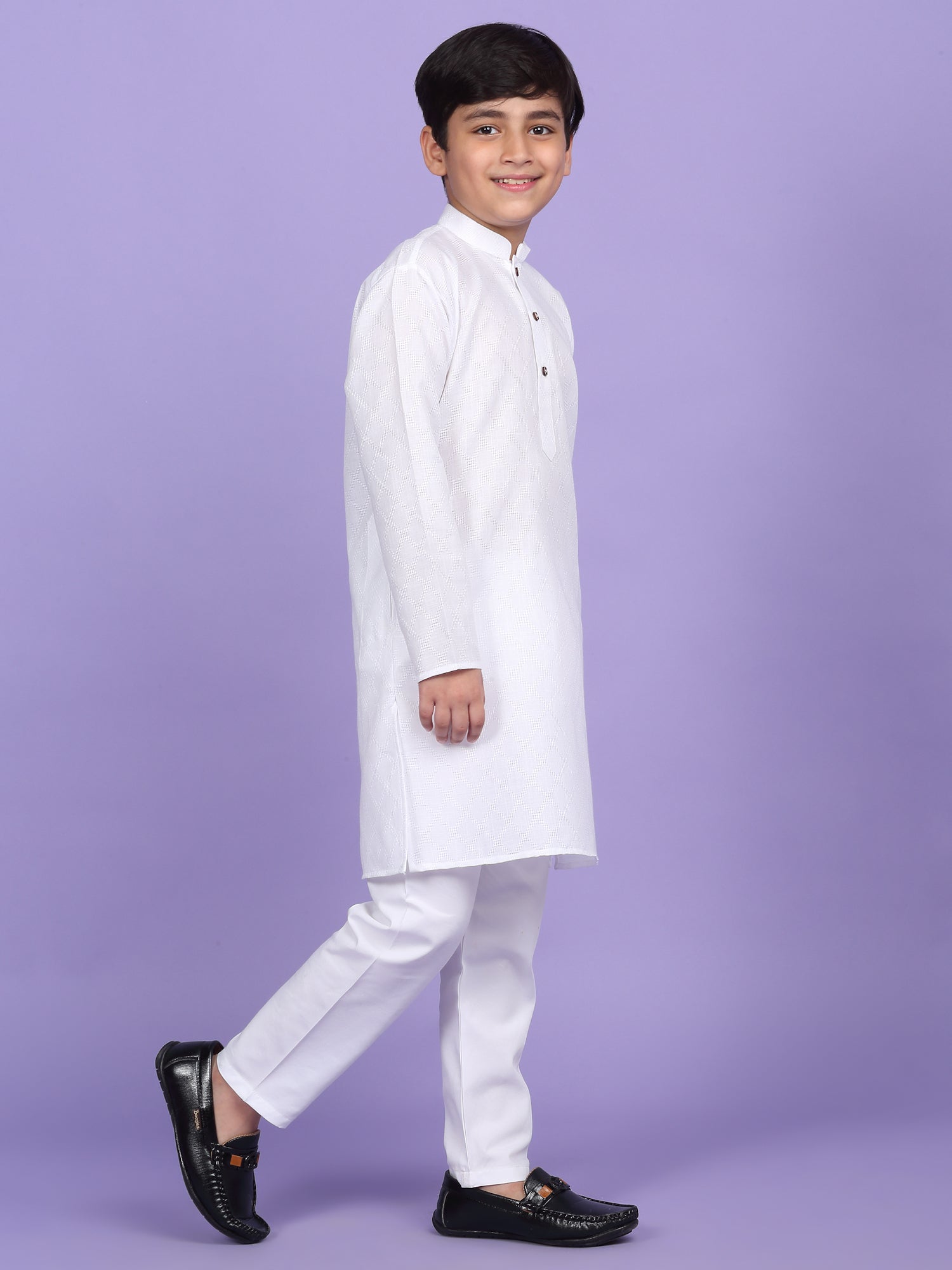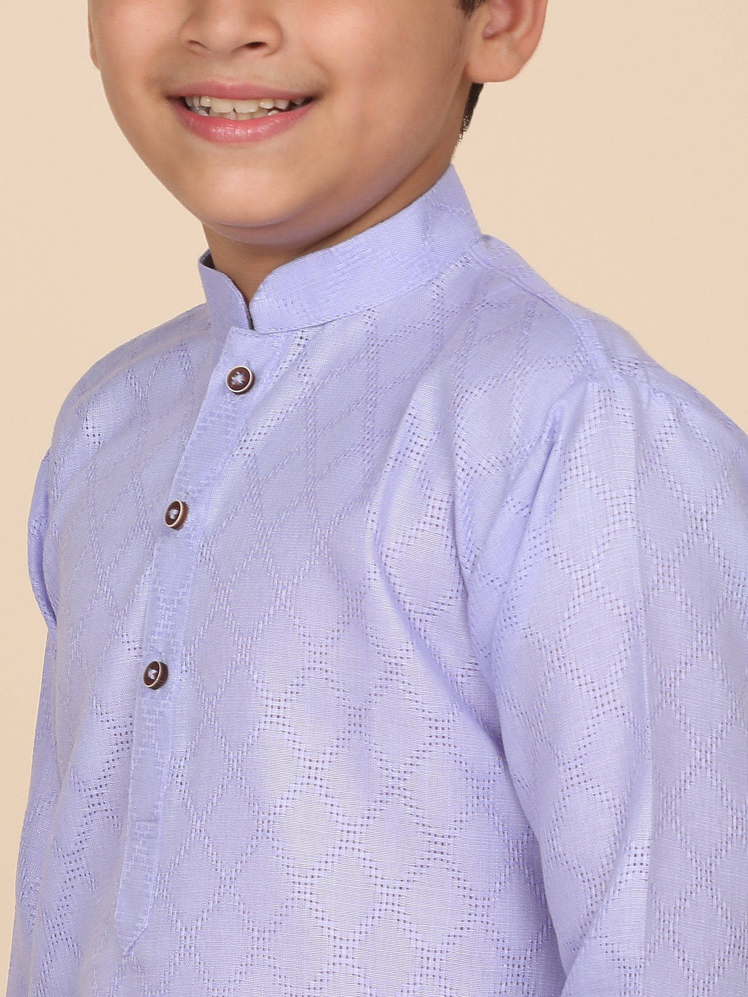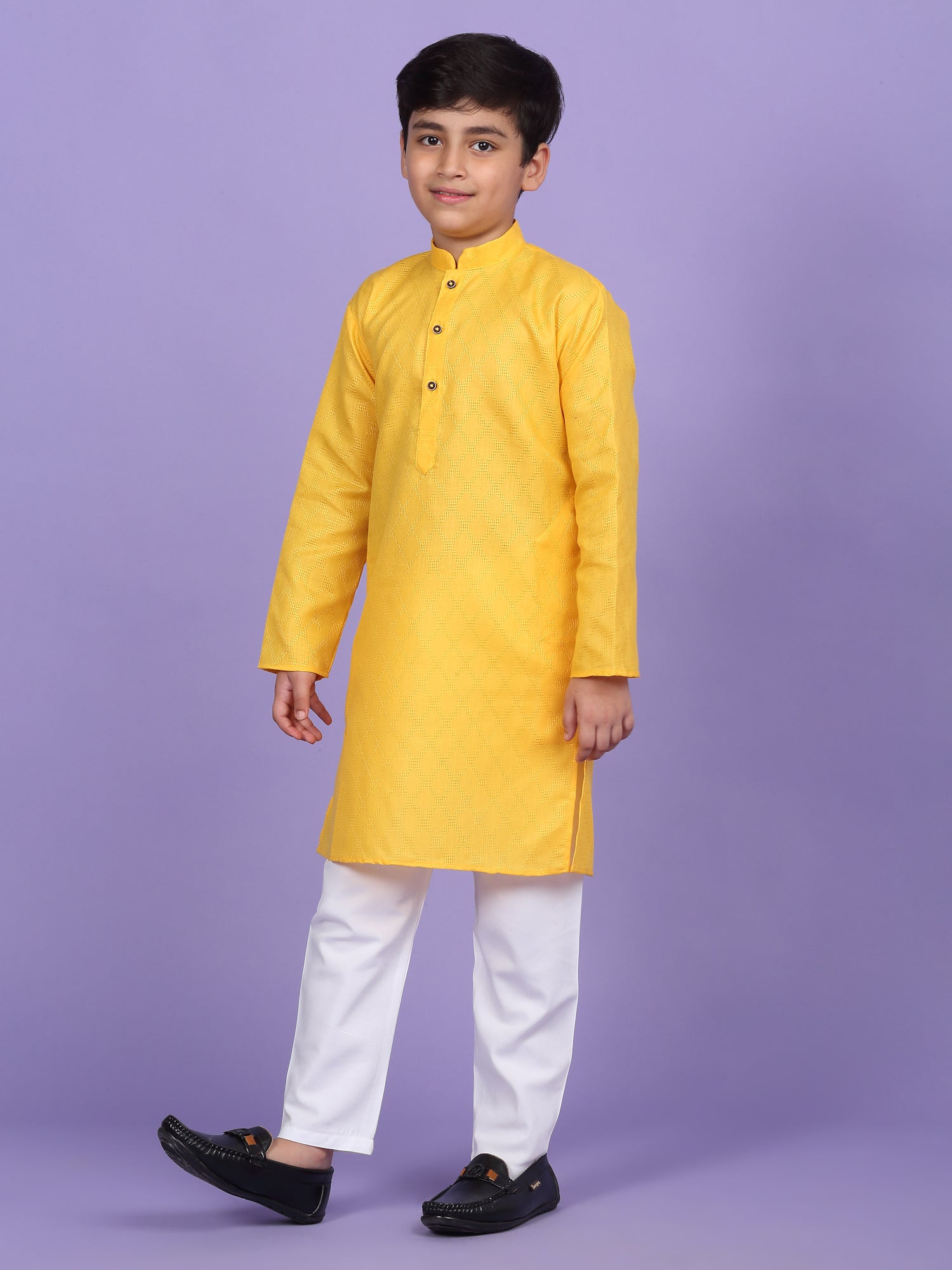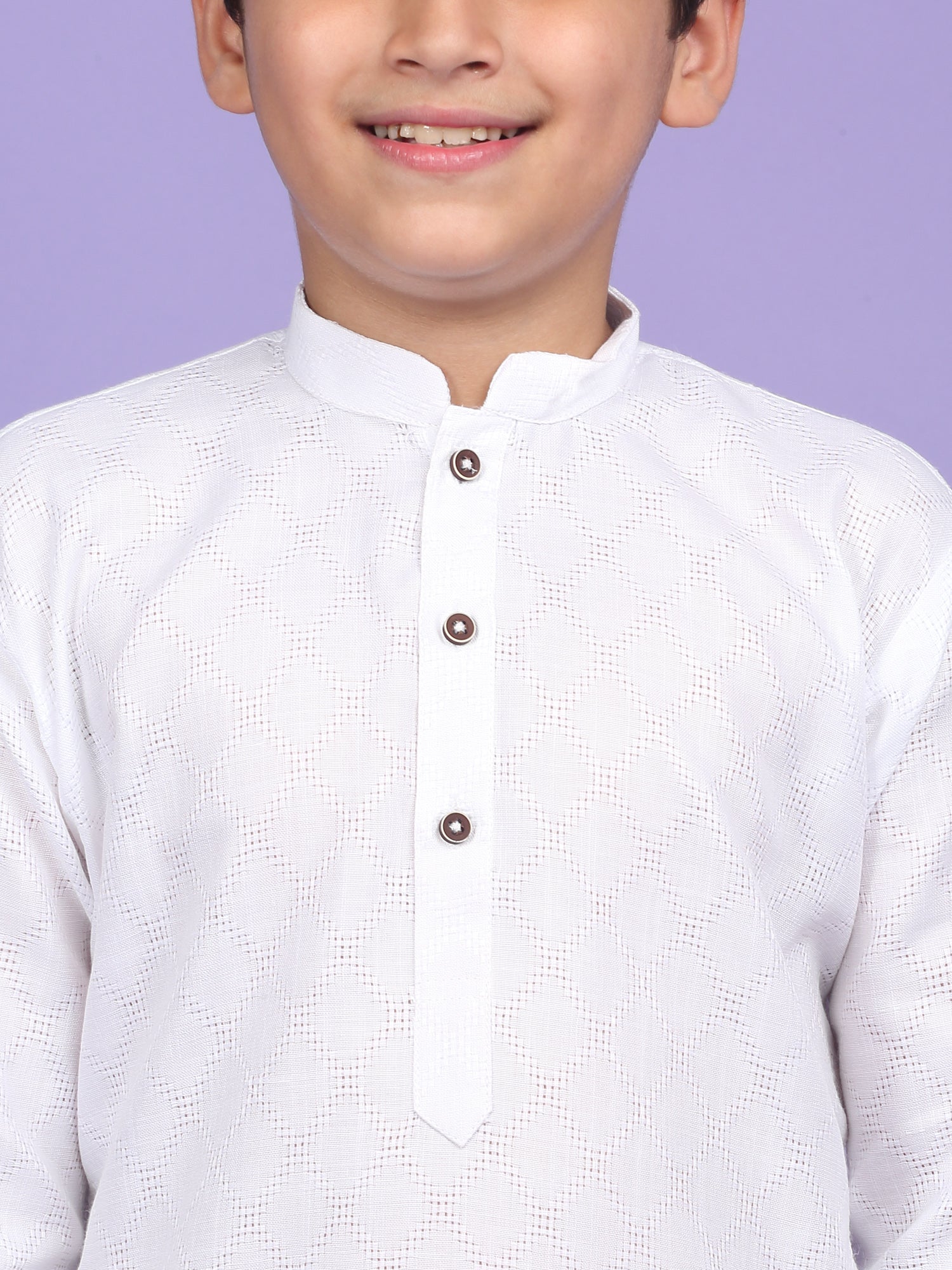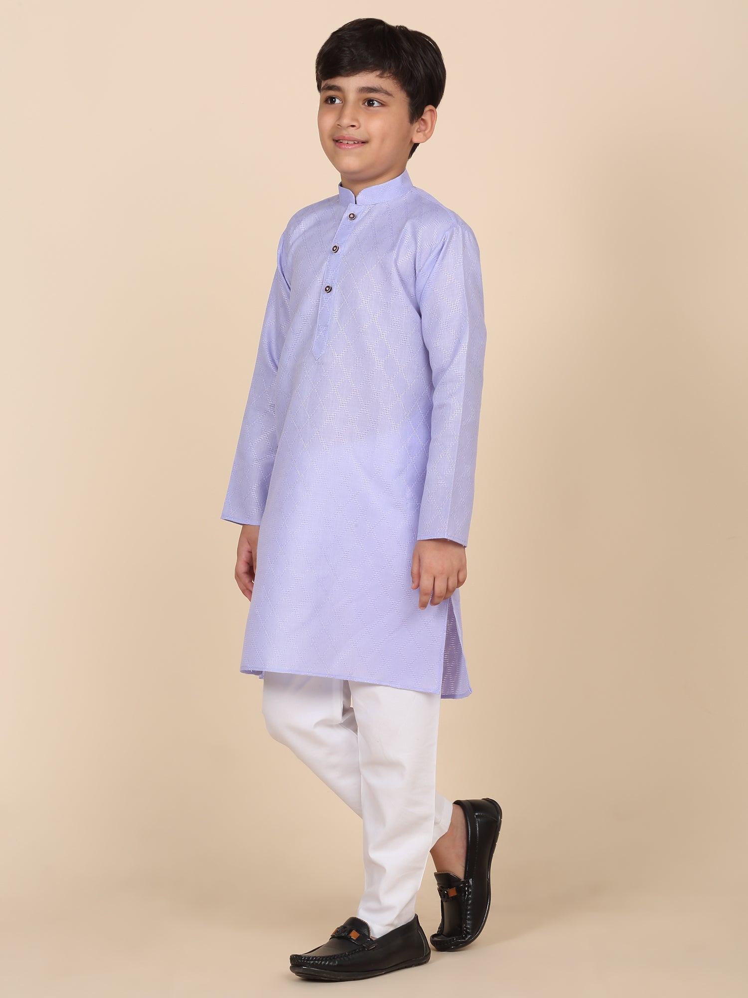 Upgrade your child’s ethnic wardrobe with this stylish and comfortable Kids Woven Design Cotton Kurta and Pyjama Set. Designed for festive wear and traditional occasions, this boys' kurta set is made from soft and breathable cotton fabric. The kurta features an elegant woven self-design, Mandarin collar, long sleeves, Handy side pockets add a practical touch, while the matching white pyjama completes this ethnic outfit. Whether it's a festival, wedding, or school ethnic day, this kurta pyjama set for boys is the perfect blend of tradition, comfort, and style.