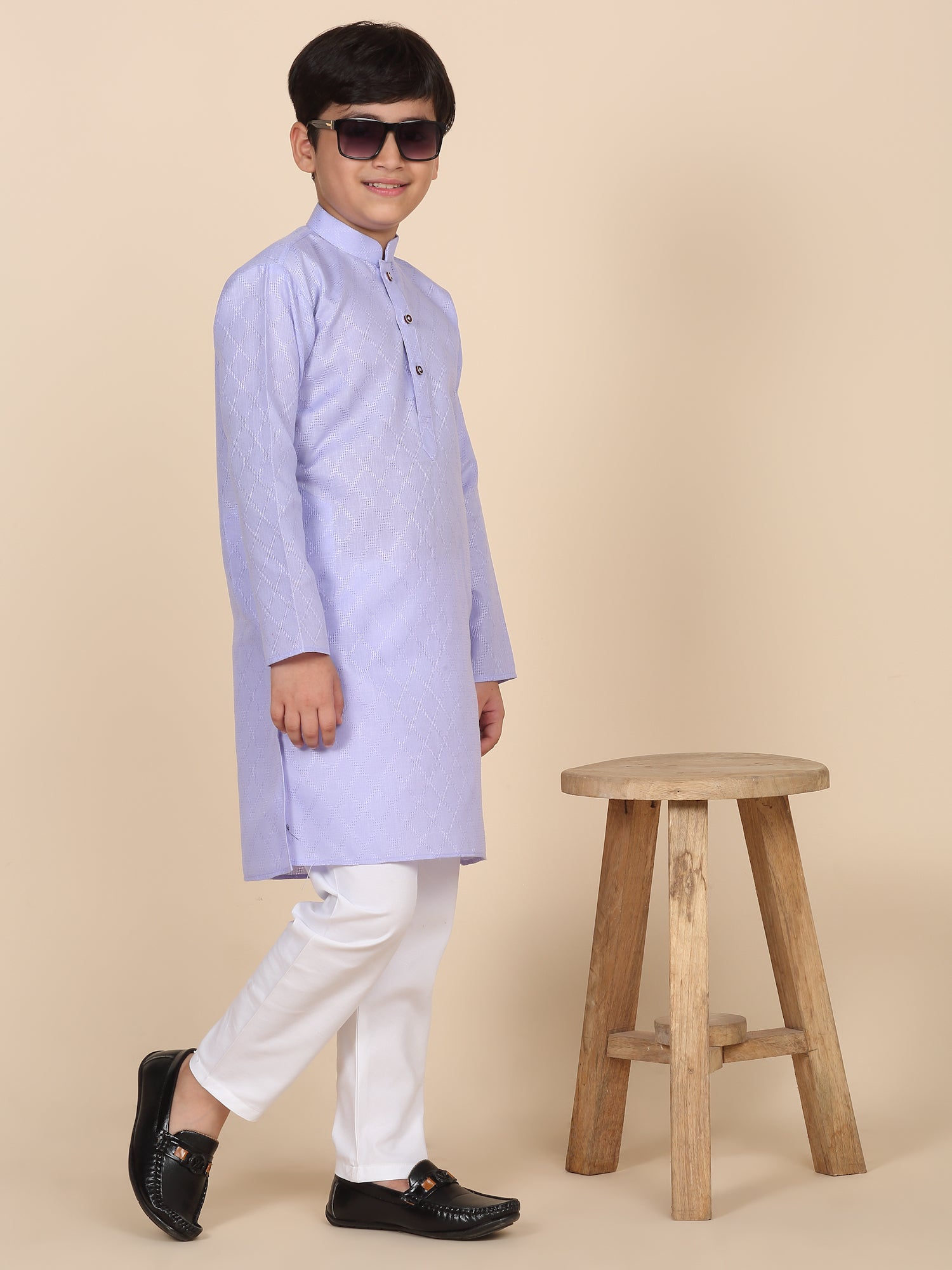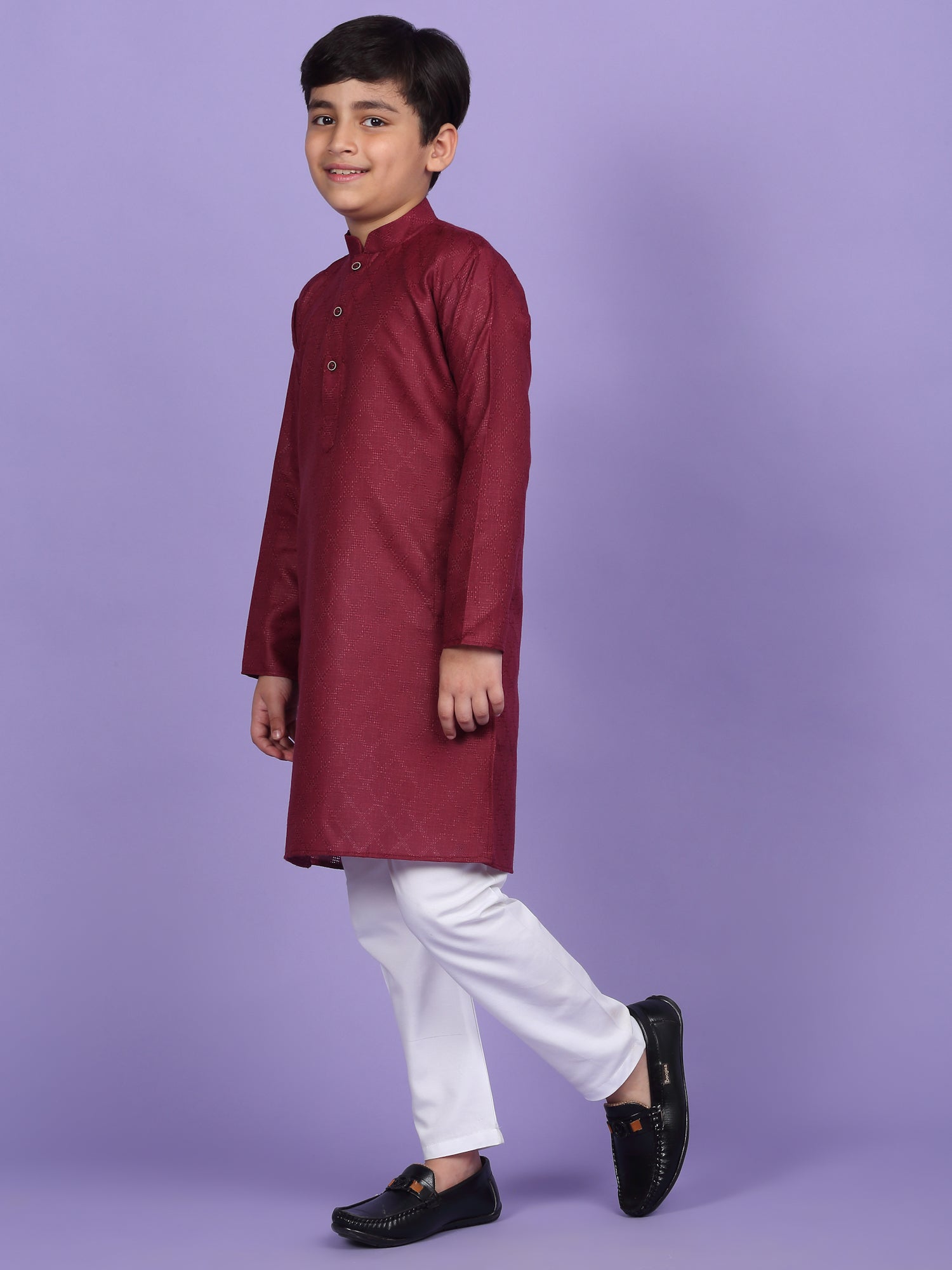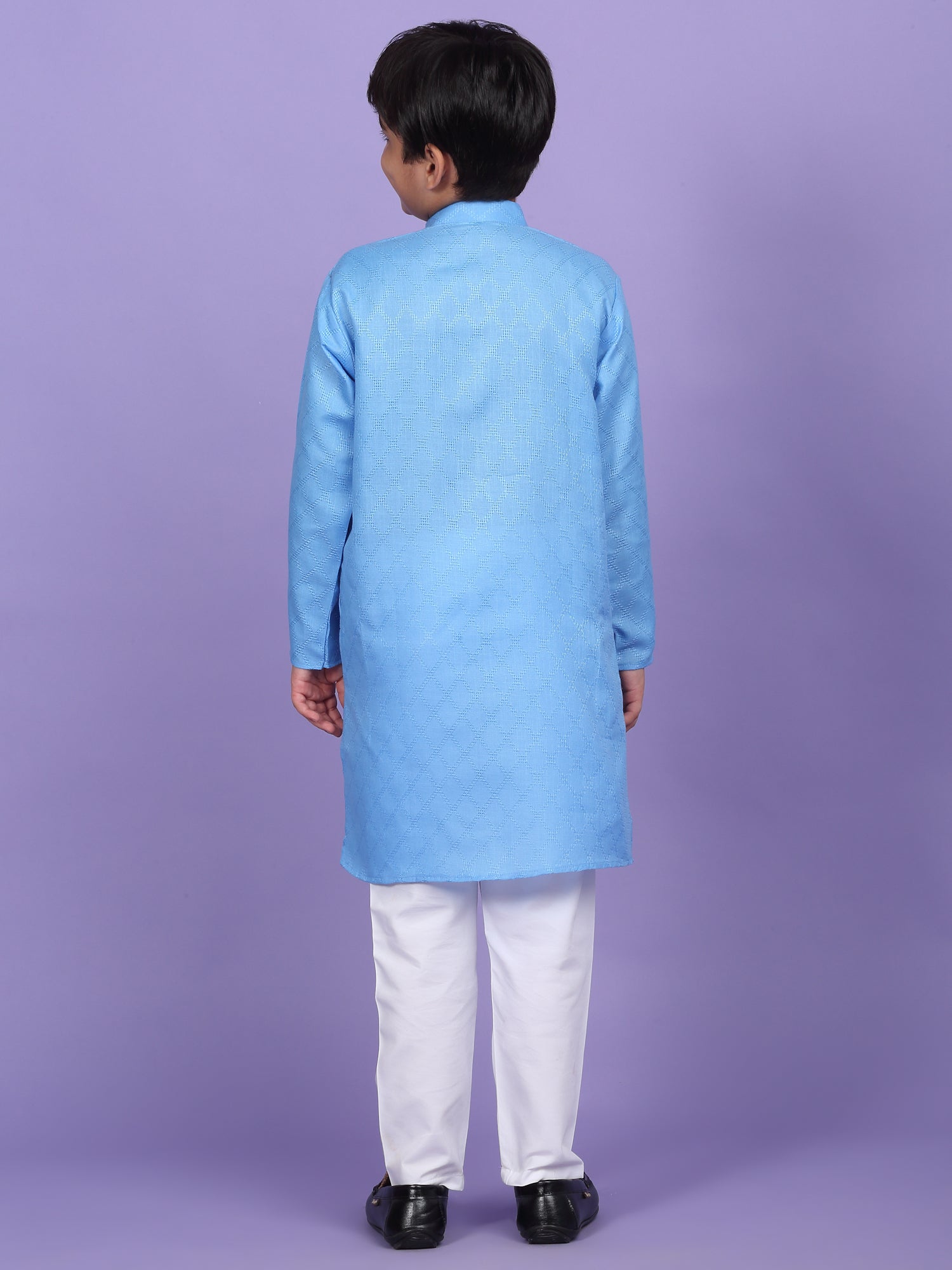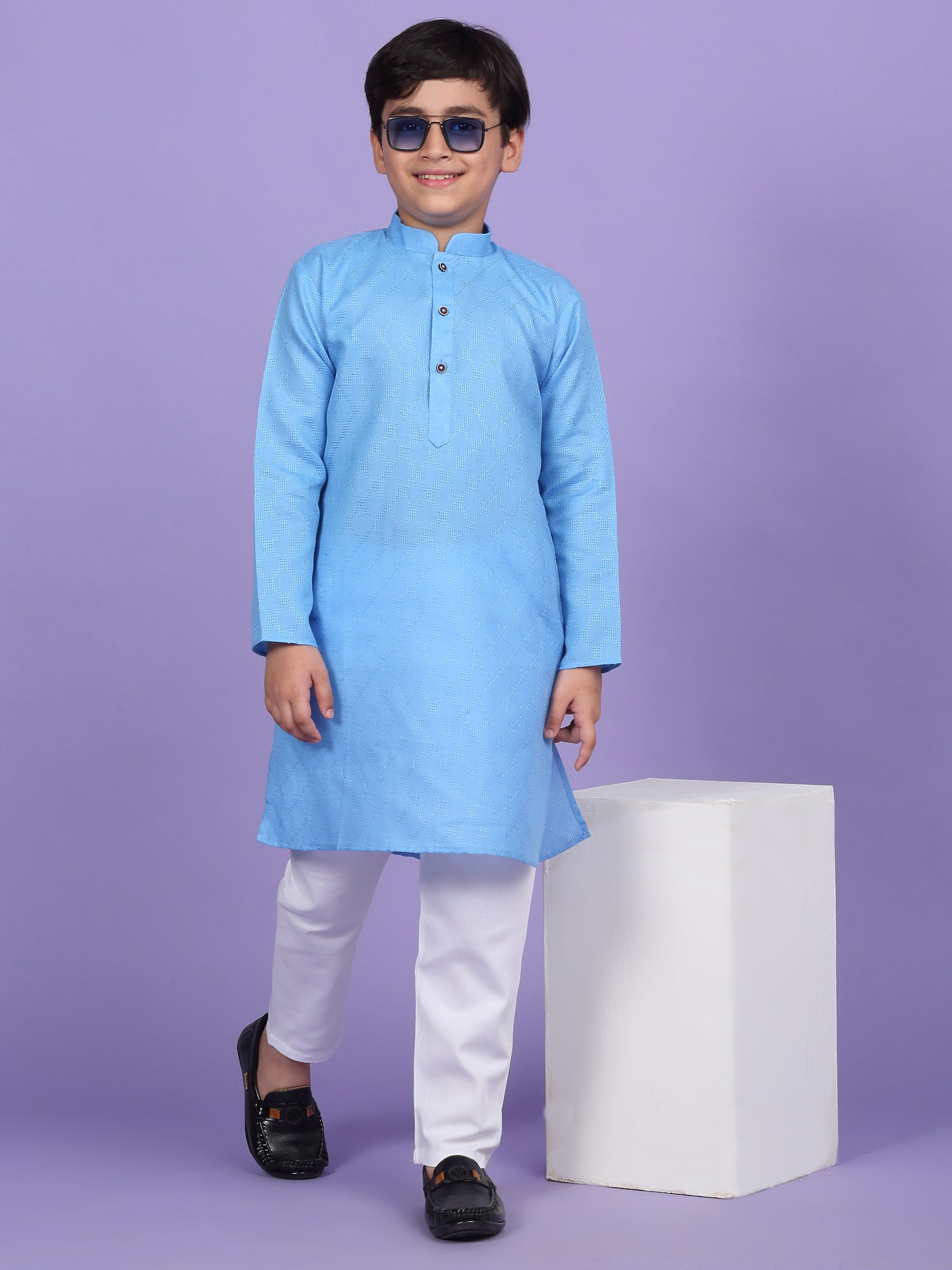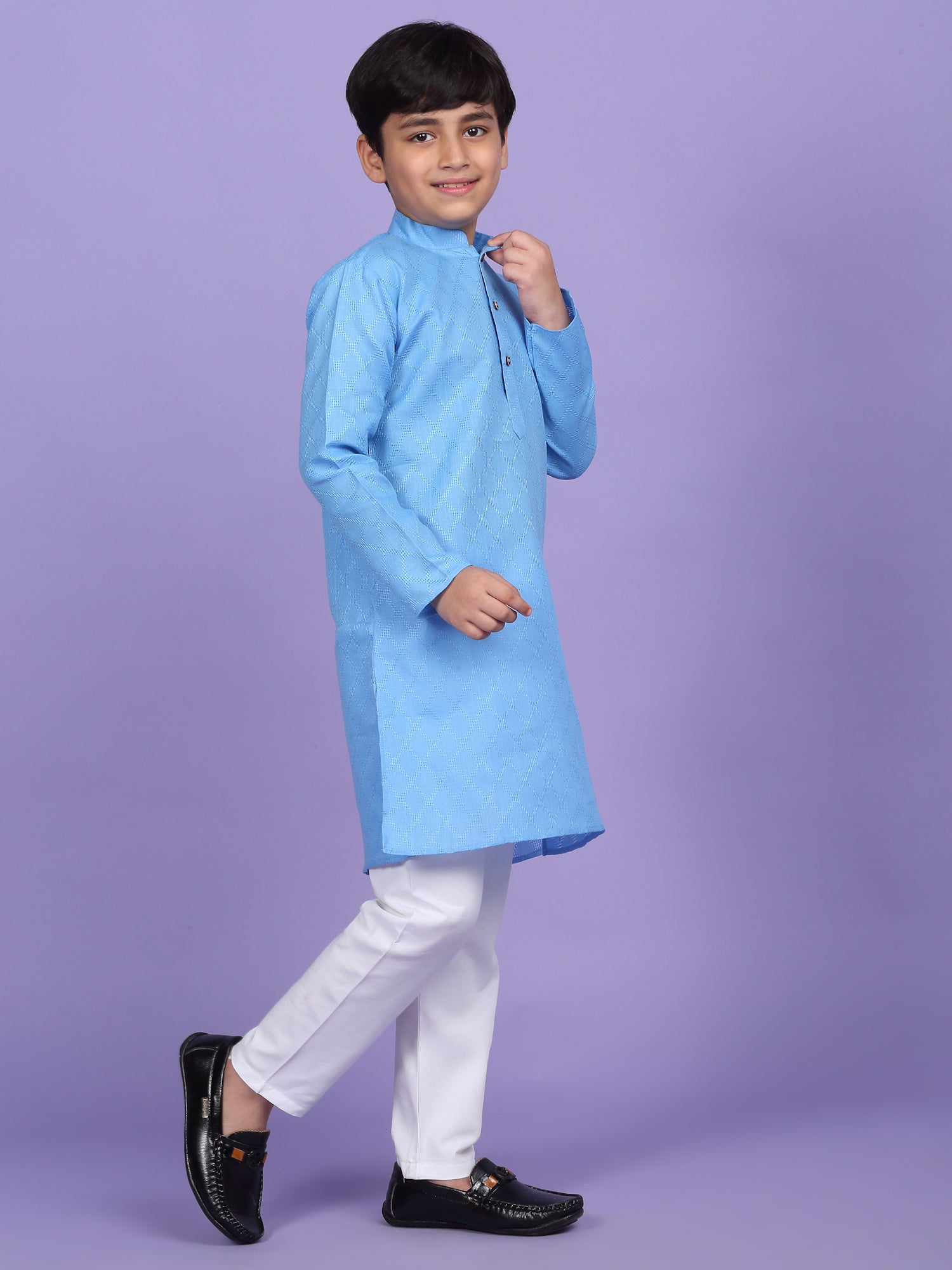 Upgrade your child’s ethnic wardrobe with this stylish and comfortable Kids Woven Design Cotton Kurta and Pyjama Set. Designed for festive wear and traditional occasions, this boys' kurta set is made from soft and breathable cotton fabric. The kurta features an elegant woven self-design, Mandarin collar, long sleeves, Handy side pockets add a practical touch, while the matching white pyjama completes this ethnic outfit. Whether it's a festival, wedding, or school ethnic day, this kurta pyjama set for boys is the perfect blend of tradition, comfort, and style.