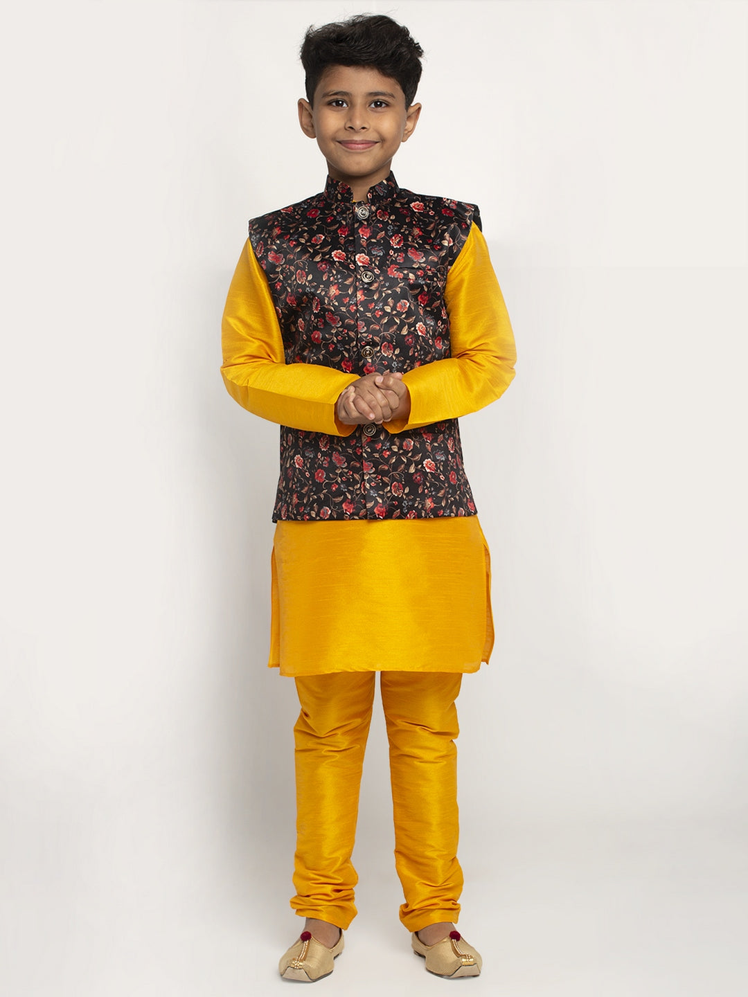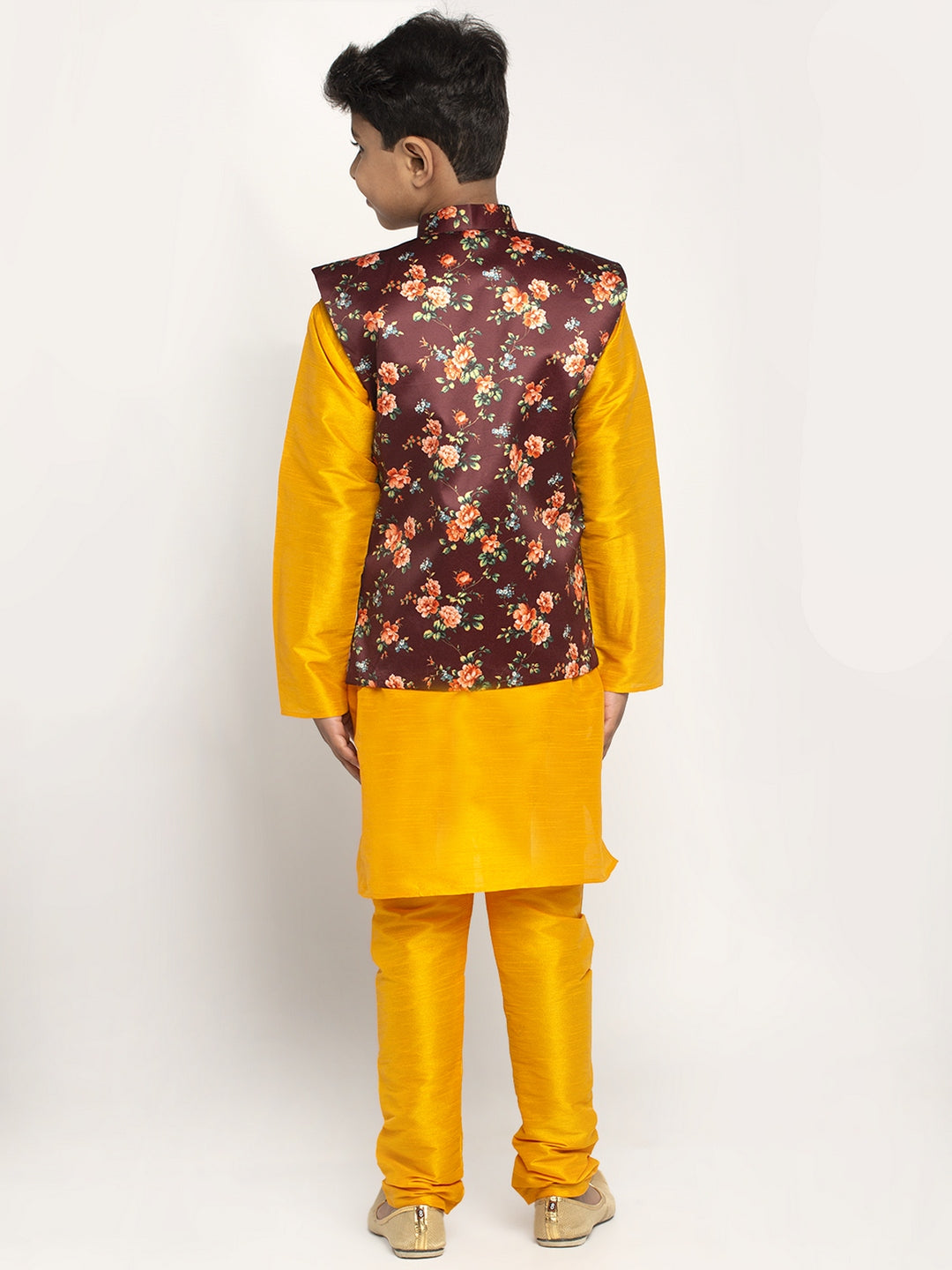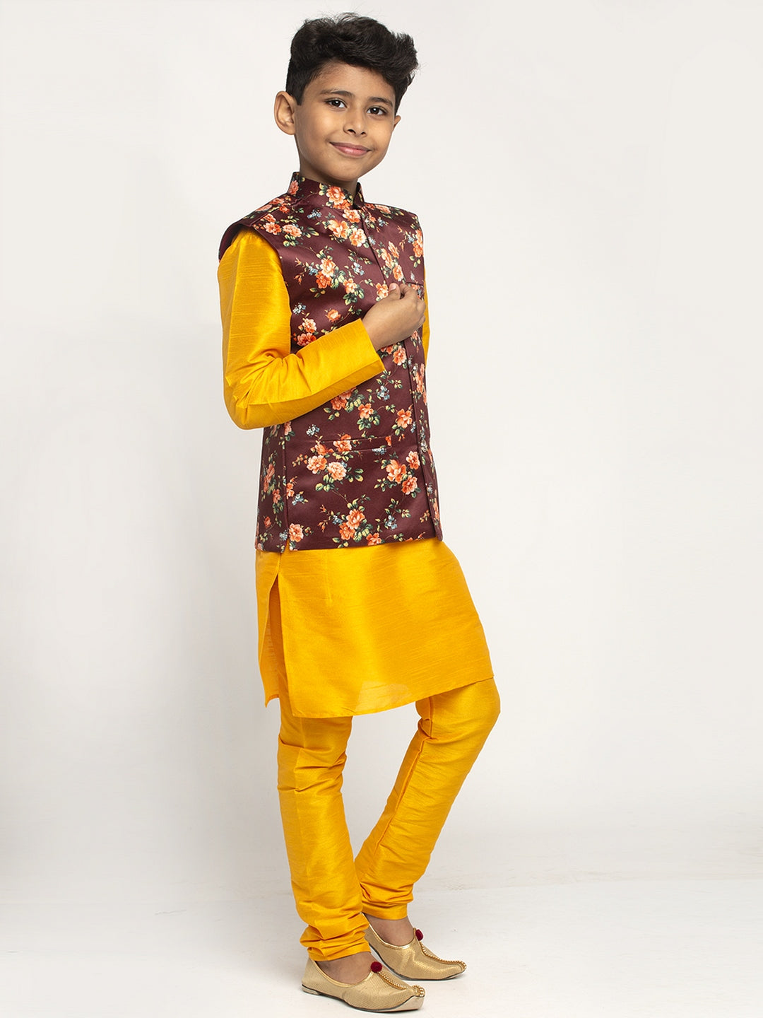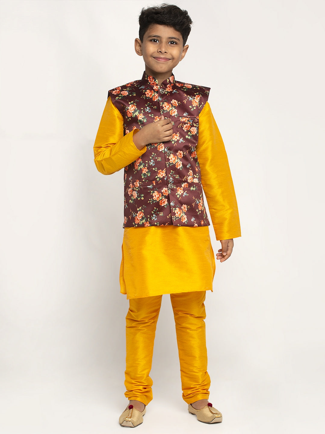 KRAFT INDIA Boys Silk Kurta with Churidar & Satin Printed Nehru jacket Set (MUSTARD)