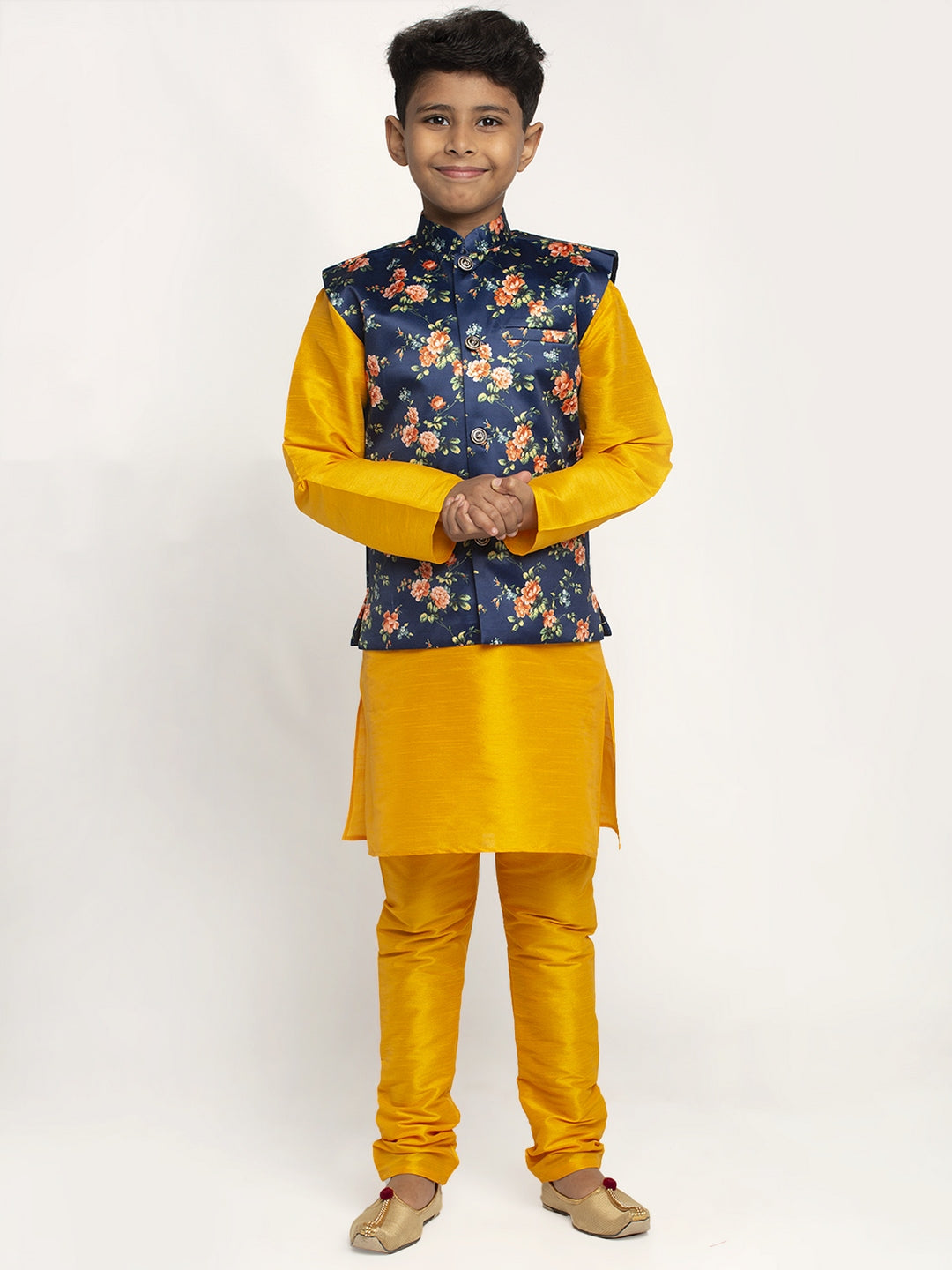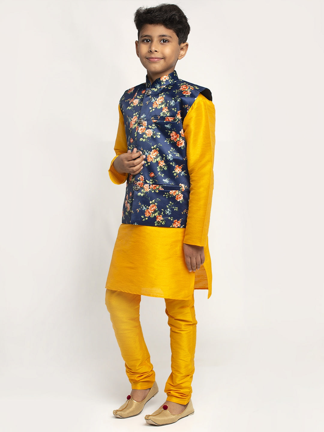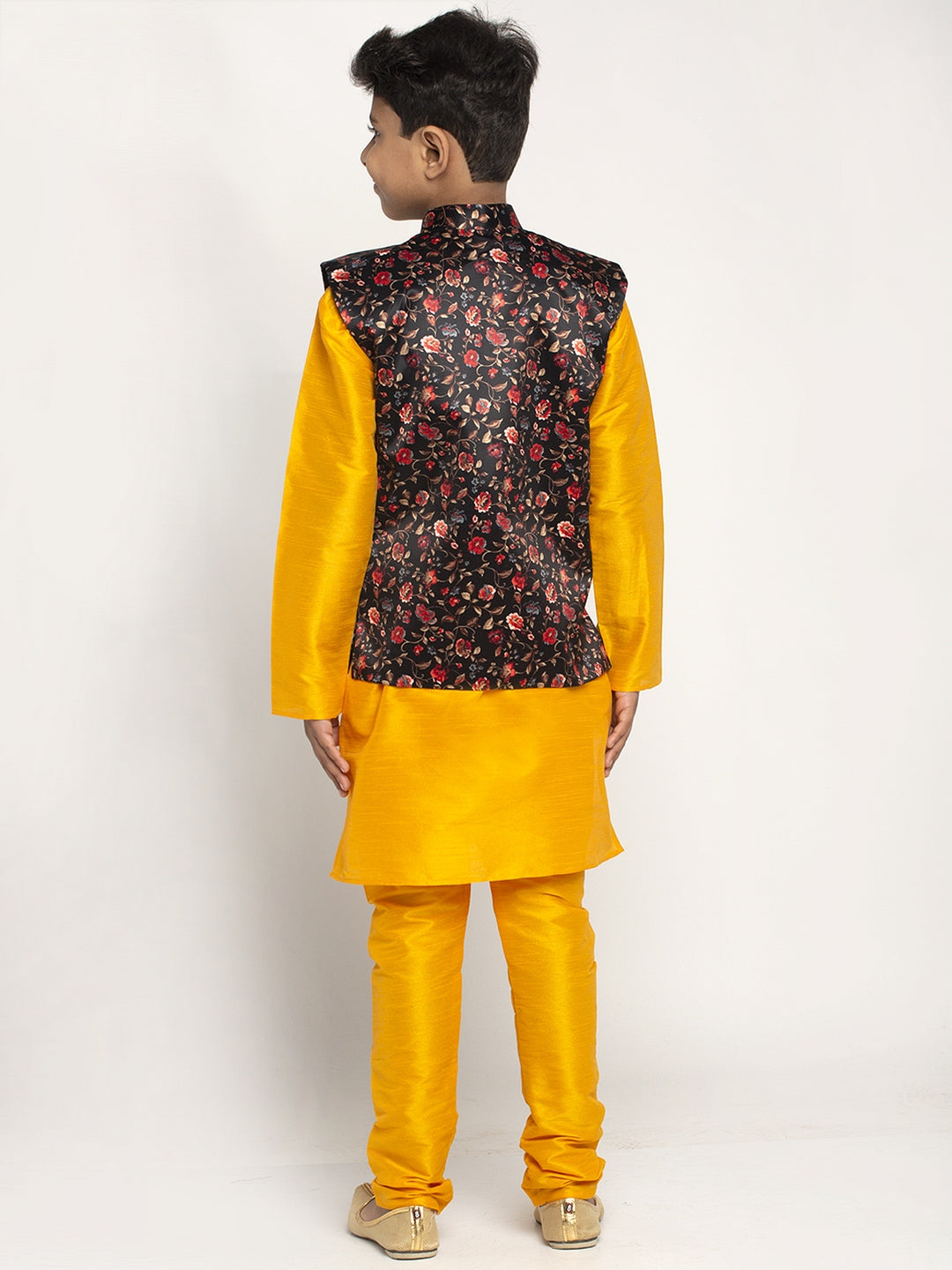 KRAFT INDIA Boys Silk Kurta with Churidar & Satin Printed Nehru jacket Set (MUSTARD)