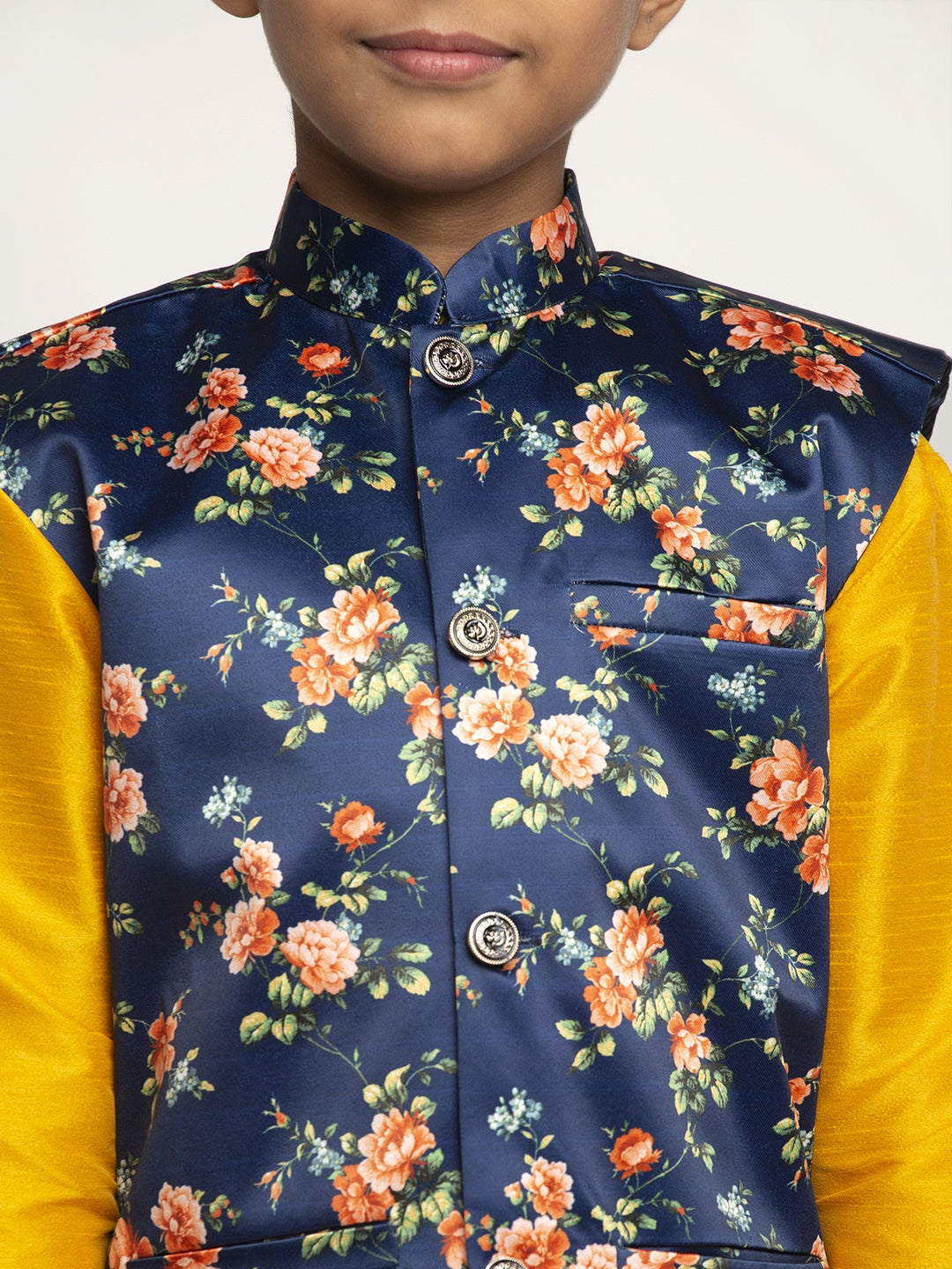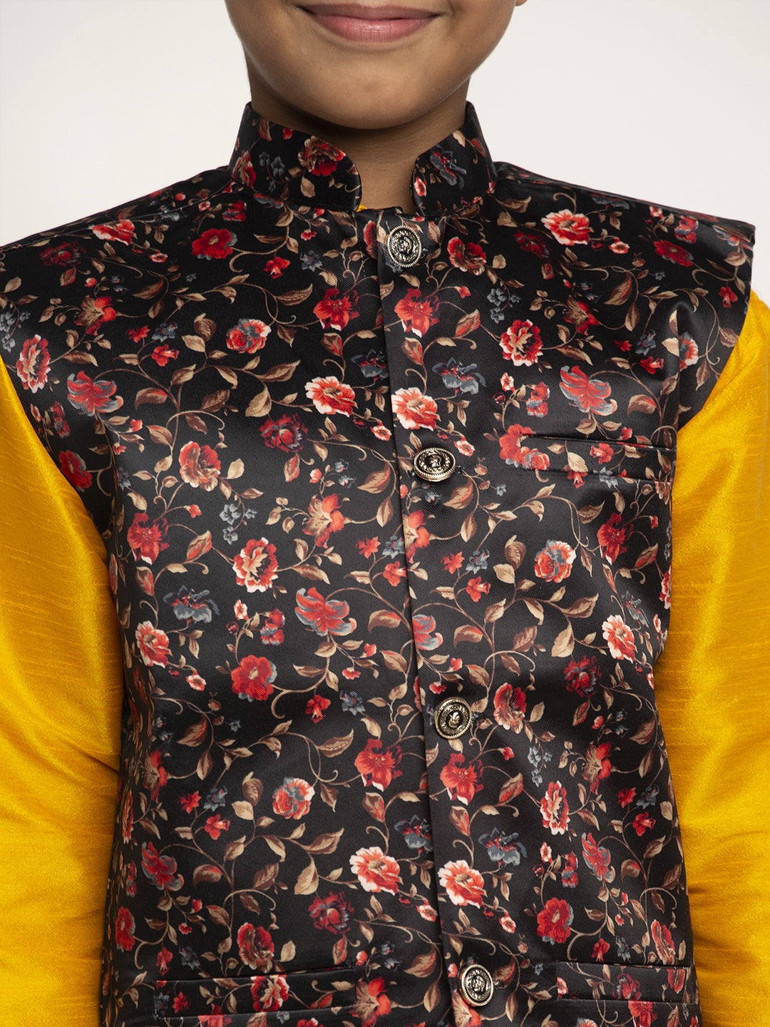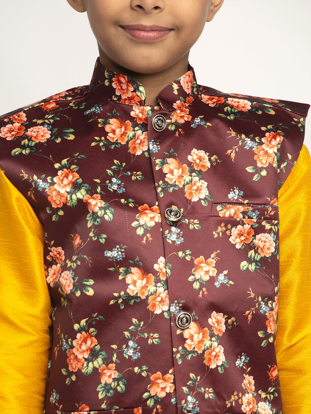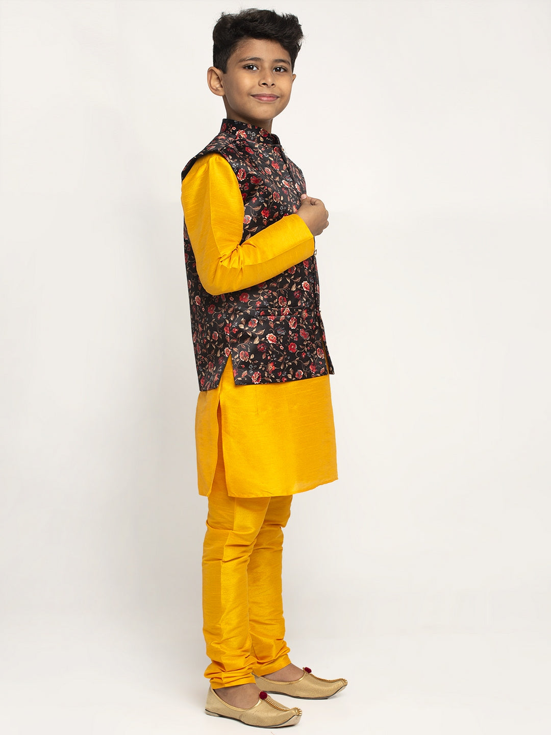 KRAFT INDIA Boys Silk Kurta with Churidar & Satin Printed Nehru jacket Set (MUSTARD)