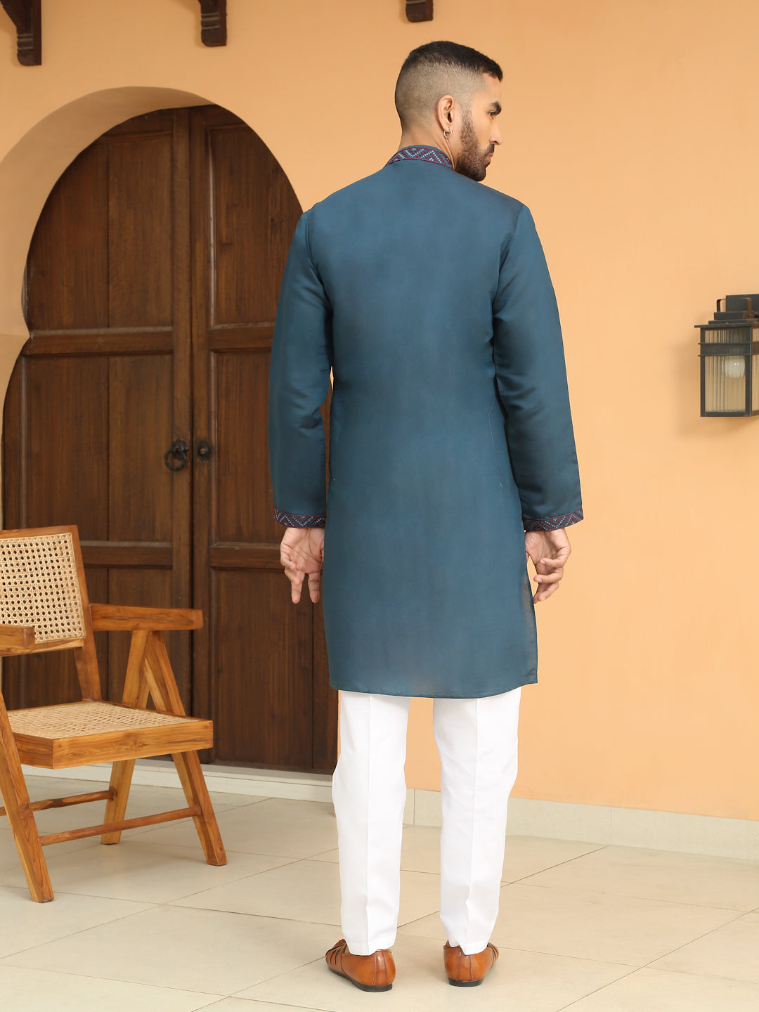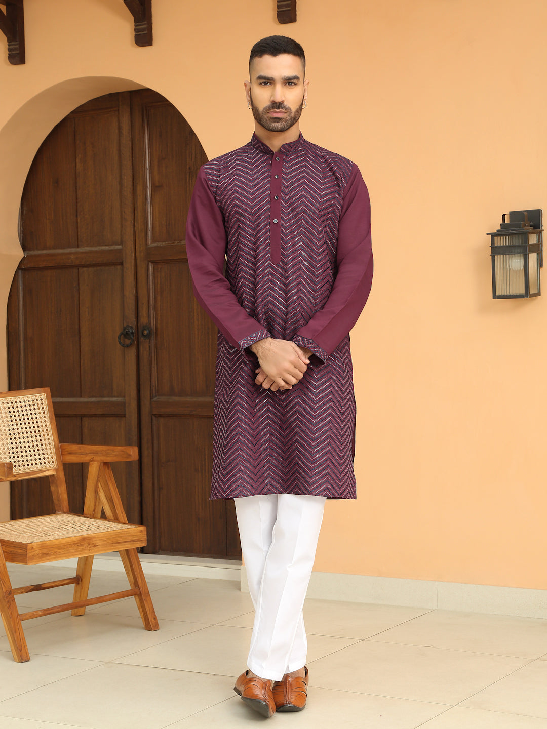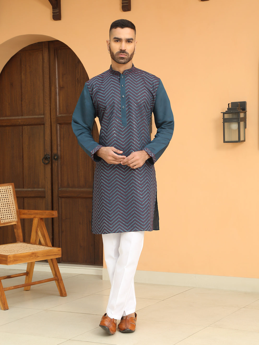 Step into timeless elegance with this Men’s Chevron Embroidered Kurta and White Trouser Pant Set. Designed with precision, the kurta features intricate chevron embroidery across the chest, giving it a refined yet modern appeal. The straight-cut silhouette and knee-length design offer a classic ethnic look that suits both festive and formal occasions. Crafted from soft, breathable fabric, the kurta ensures lasting comfort, while the full sleeves add a traditional touch that’s perfect for cultural gatherings, weddings, and celebrations. It comes paired with a crisp white trouser pant tailored for a clean, structured finish and easy movement. Whether you’re dressing for a family function or a festive event, this kurta set delivers style, comfort, and sophistication in one effortless ensemble. Hand wash or gentle machine wash is recommended to preserve the embroidery and fabric quality.