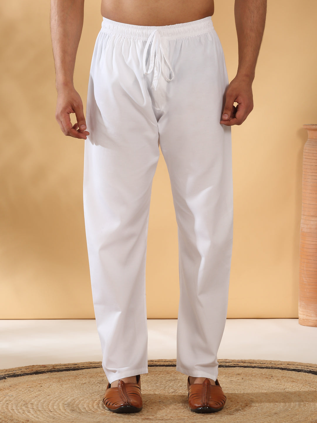 Paired with a white cotton blend pyjama, this ensemble balances tradition and contemporary fashion. The pyjama’s comfortable fit allows for effortless movement while maintaining a crisp and elegant silhouette. Whether styled with mojaris or minimal accessories, this set is perfect for making a statement at weddings, festive events, or casual ethnic outings."
