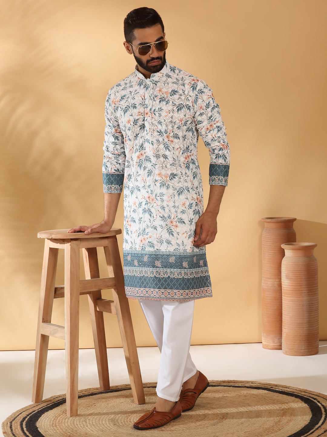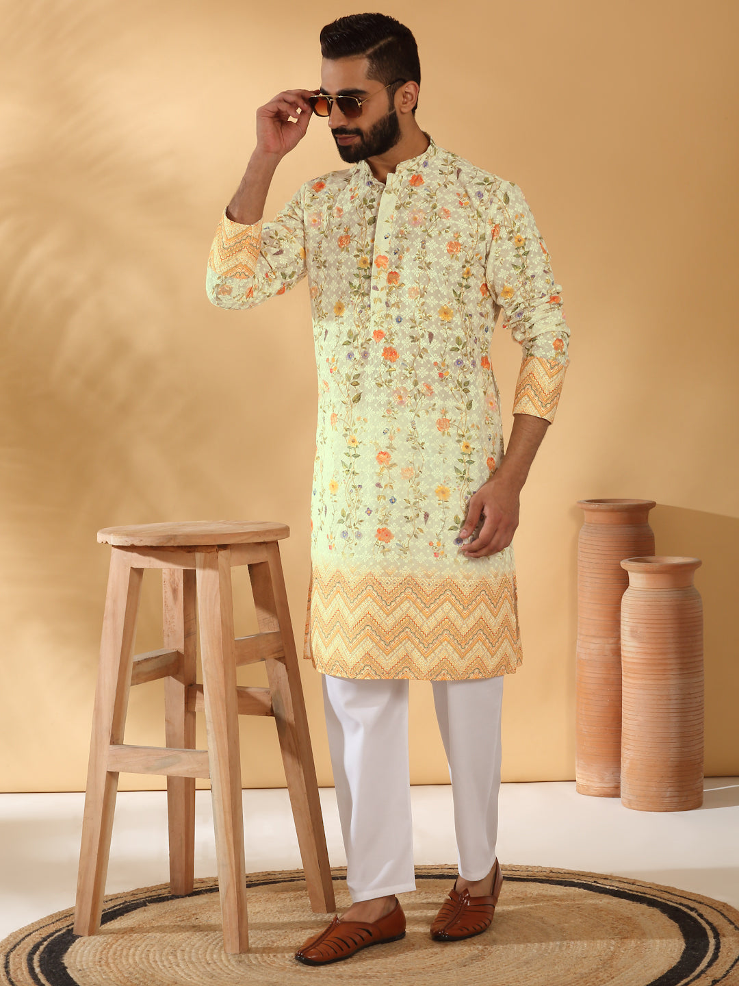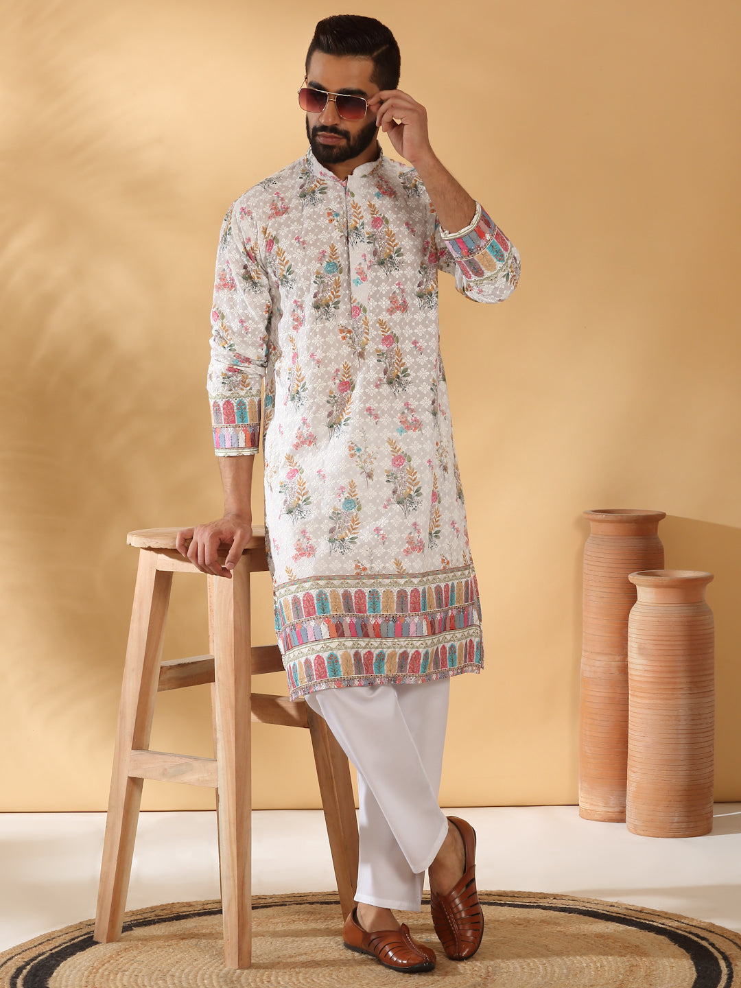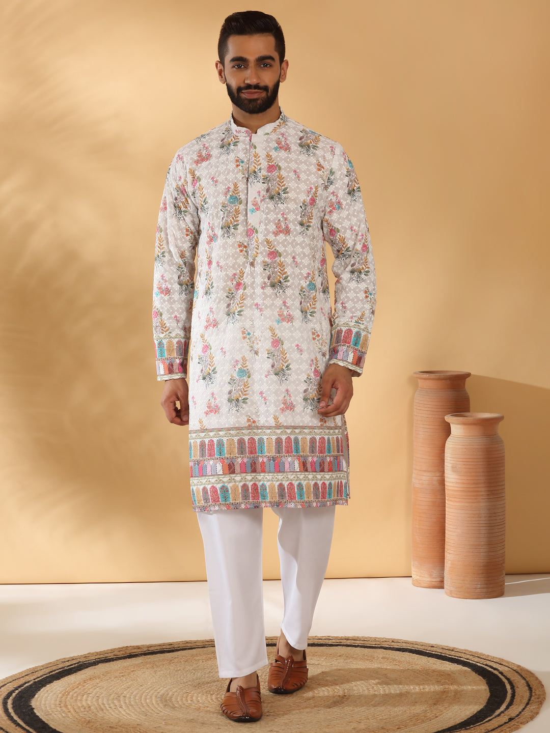 "Elevate your traditional wardrobe with this Men's Cotton Embroidered Sequin Chikan Floral Printed Thread Work Kurta and Pyjama Set, a perfect fusion of elegance and craftsmanship. Crafted from premium cotton, the kurta showcases intricate Chikan floral embroidery with delicate sequin embellishments and thread work, adding a refined yet subtle shimmer. The combination of floral prints and detailed embroidery creates a sophisticated and artistic appeal, making it ideal for festive occasions, cultural gatherings, and celebrations.