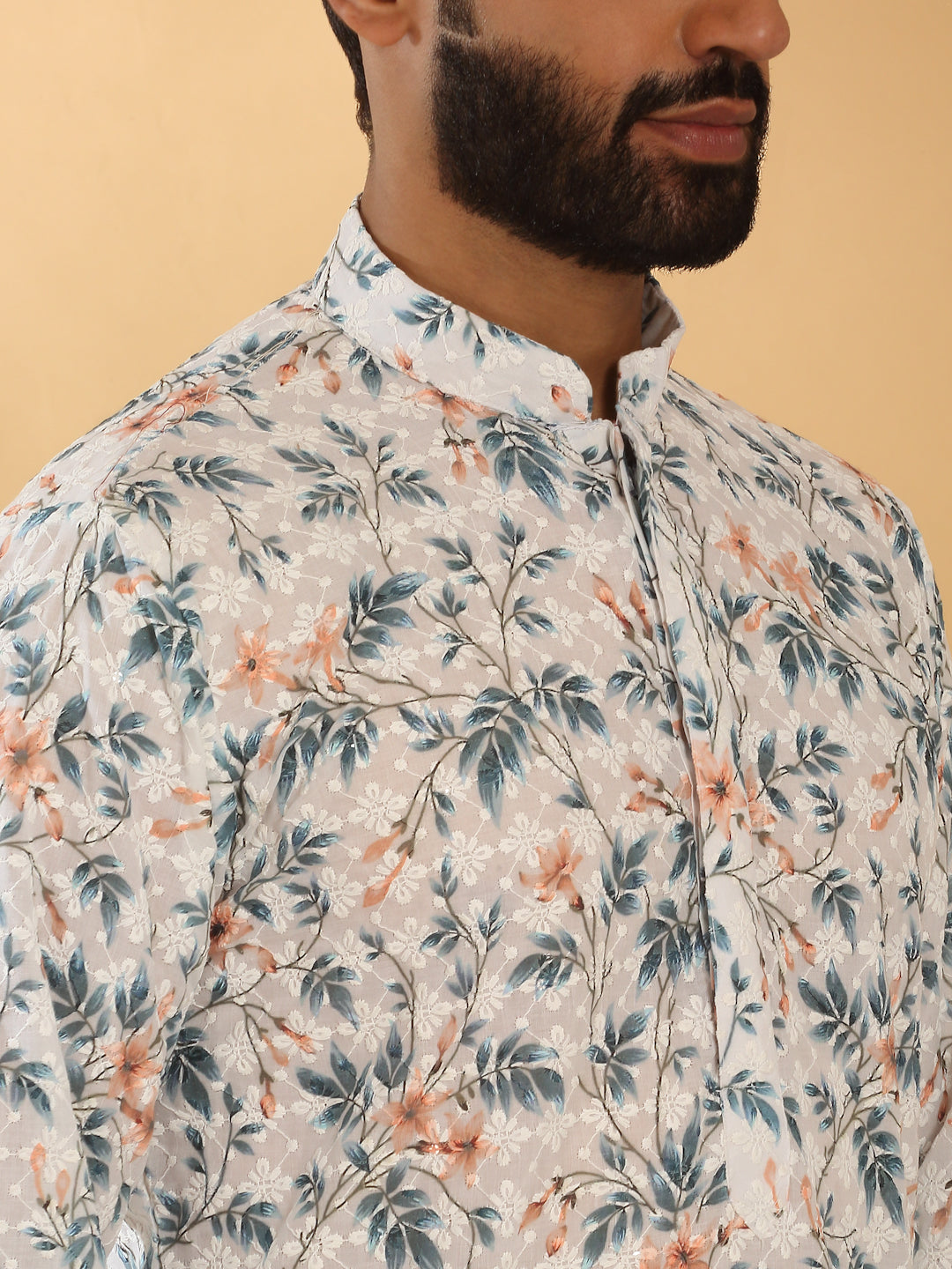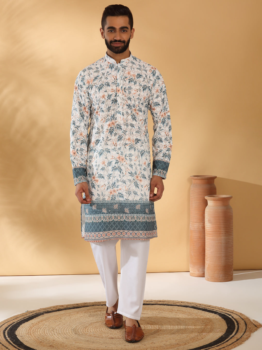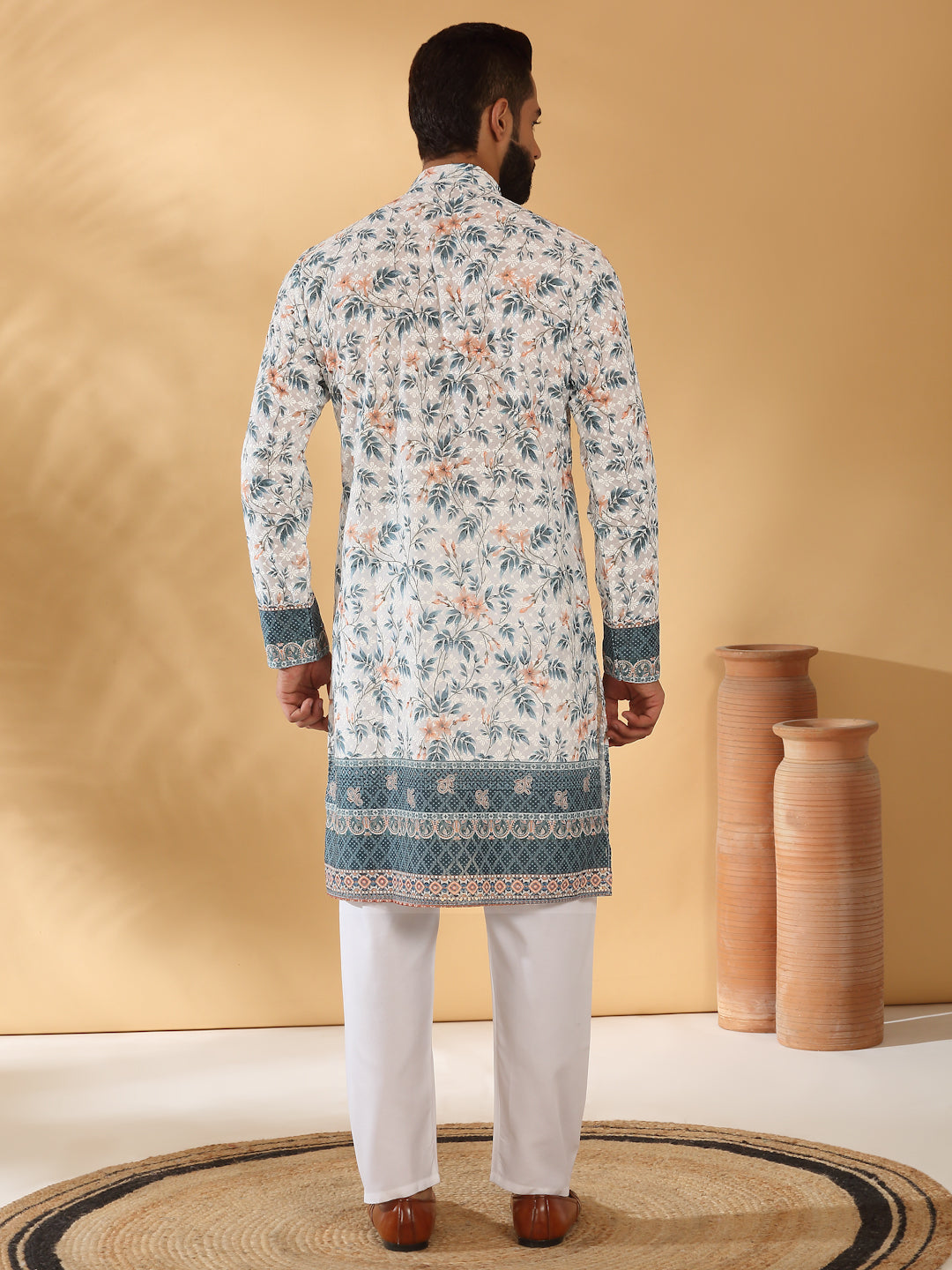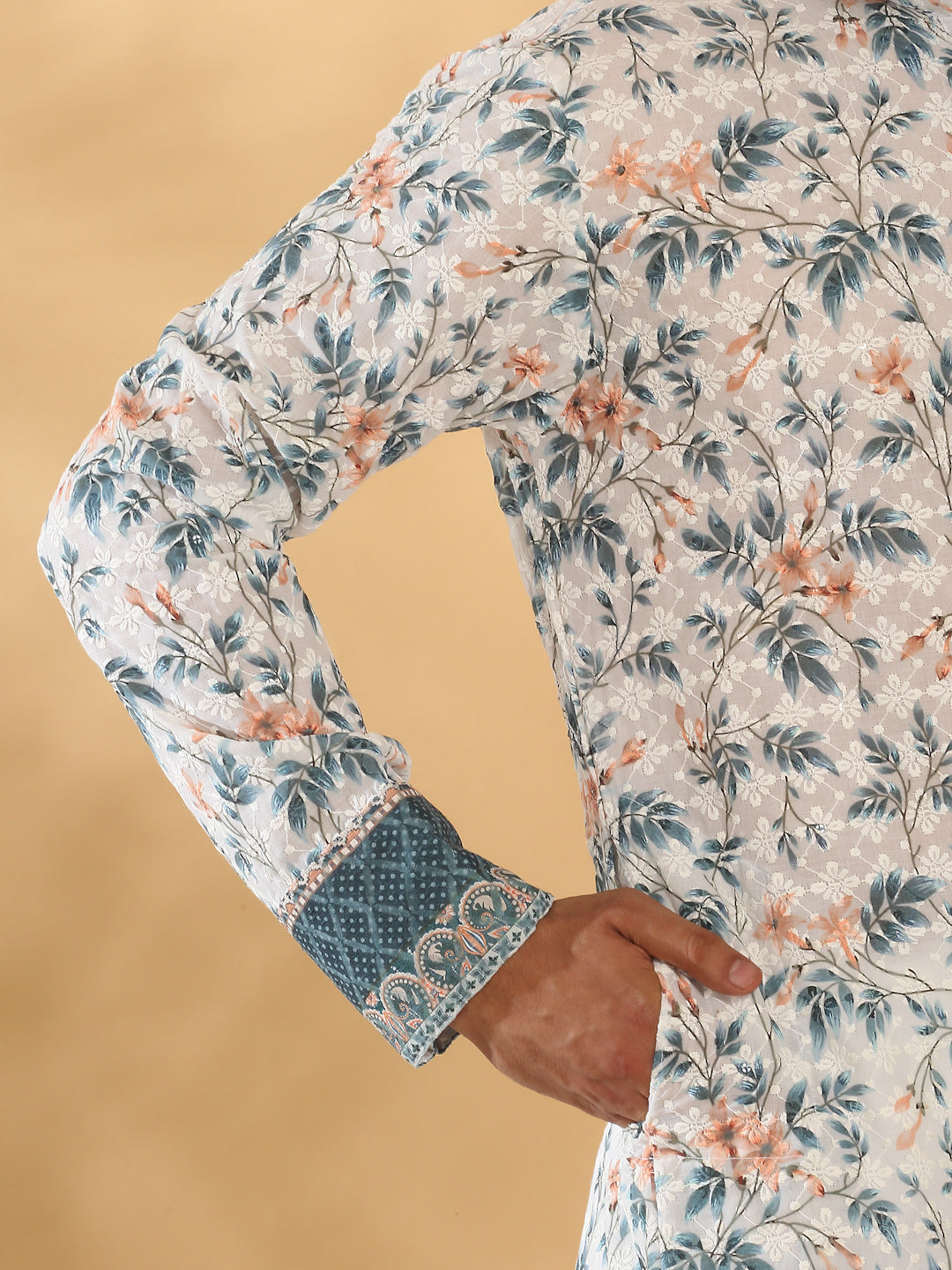 "Elevate your traditional wardrobe with this Men's Cotton Embroidered Sequin Chikan Floral Printed Thread Work Kurta and Pyjama Set, a perfect fusion of elegance and craftsmanship. Crafted from premium cotton, the kurta showcases intricate Chikan floral embroidery with delicate sequin embellishments and thread work, adding a refined yet subtle shimmer. The combination of floral prints and detailed embroidery creates a sophisticated and artistic appeal, making it ideal for festive occasions, cultural gatherings, and celebrations.