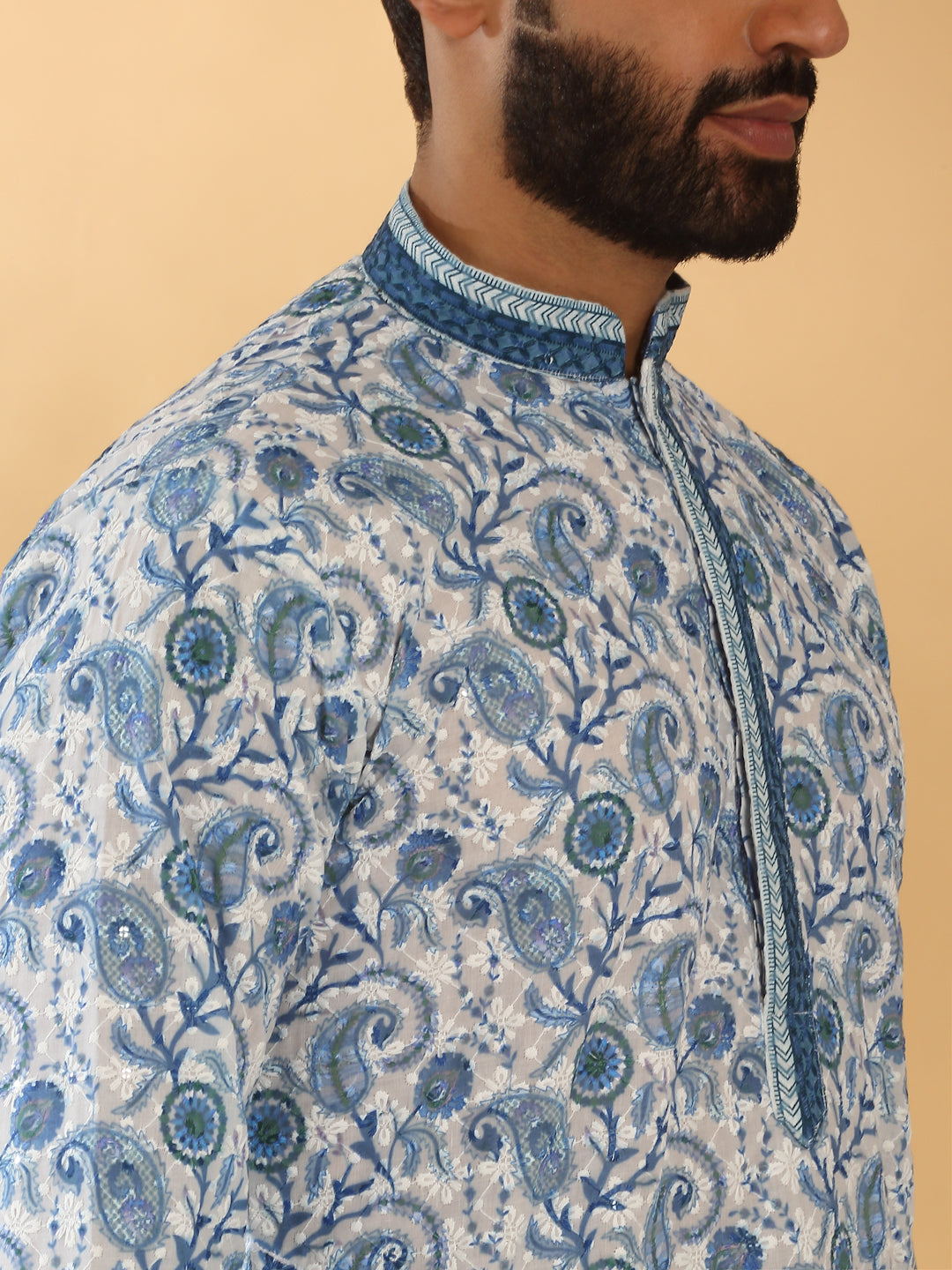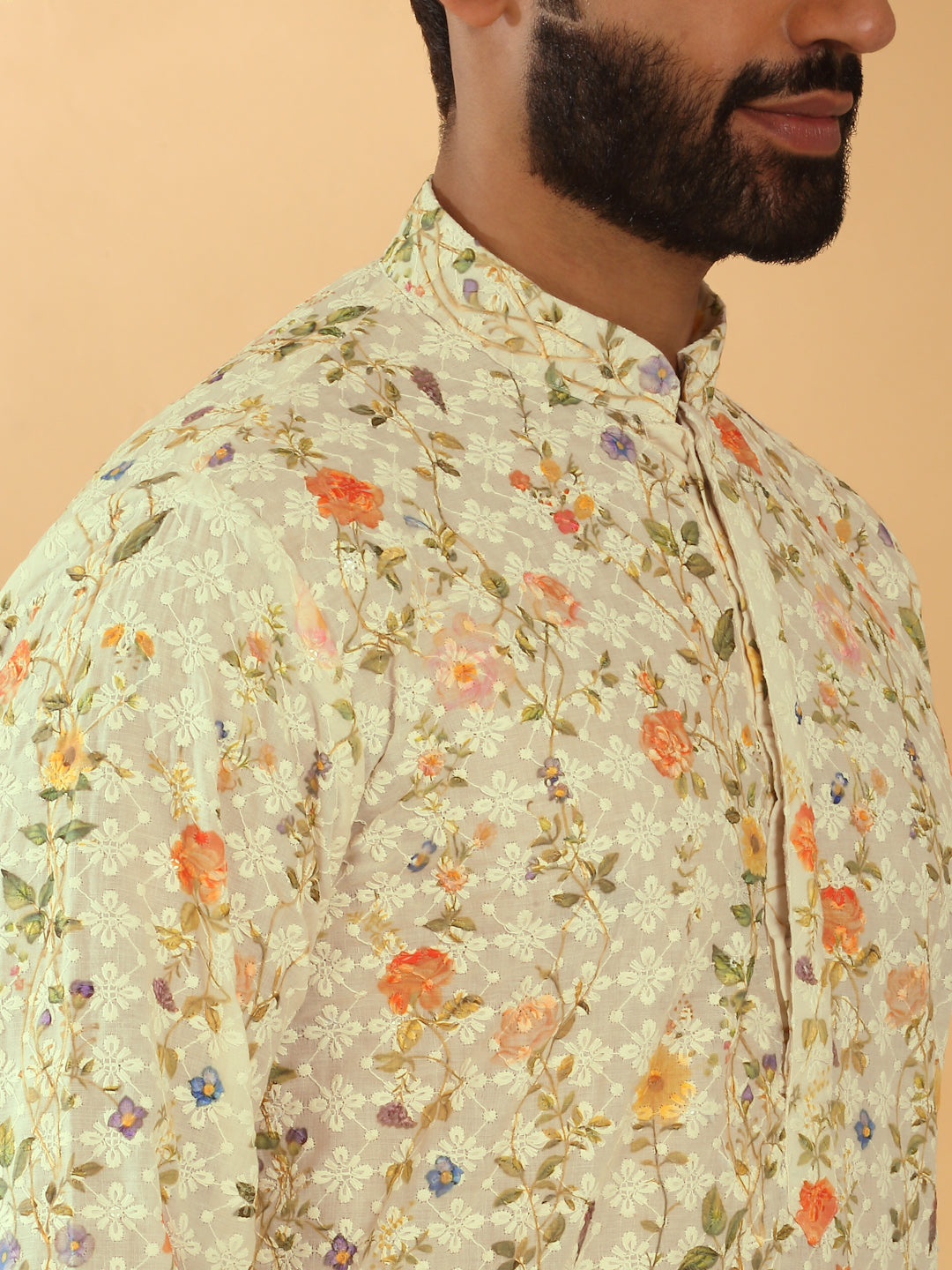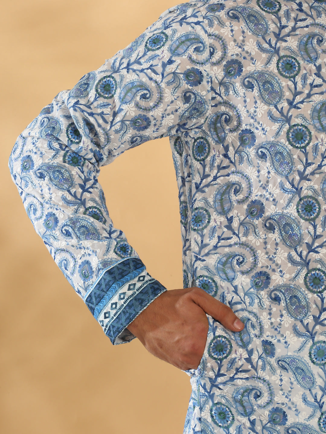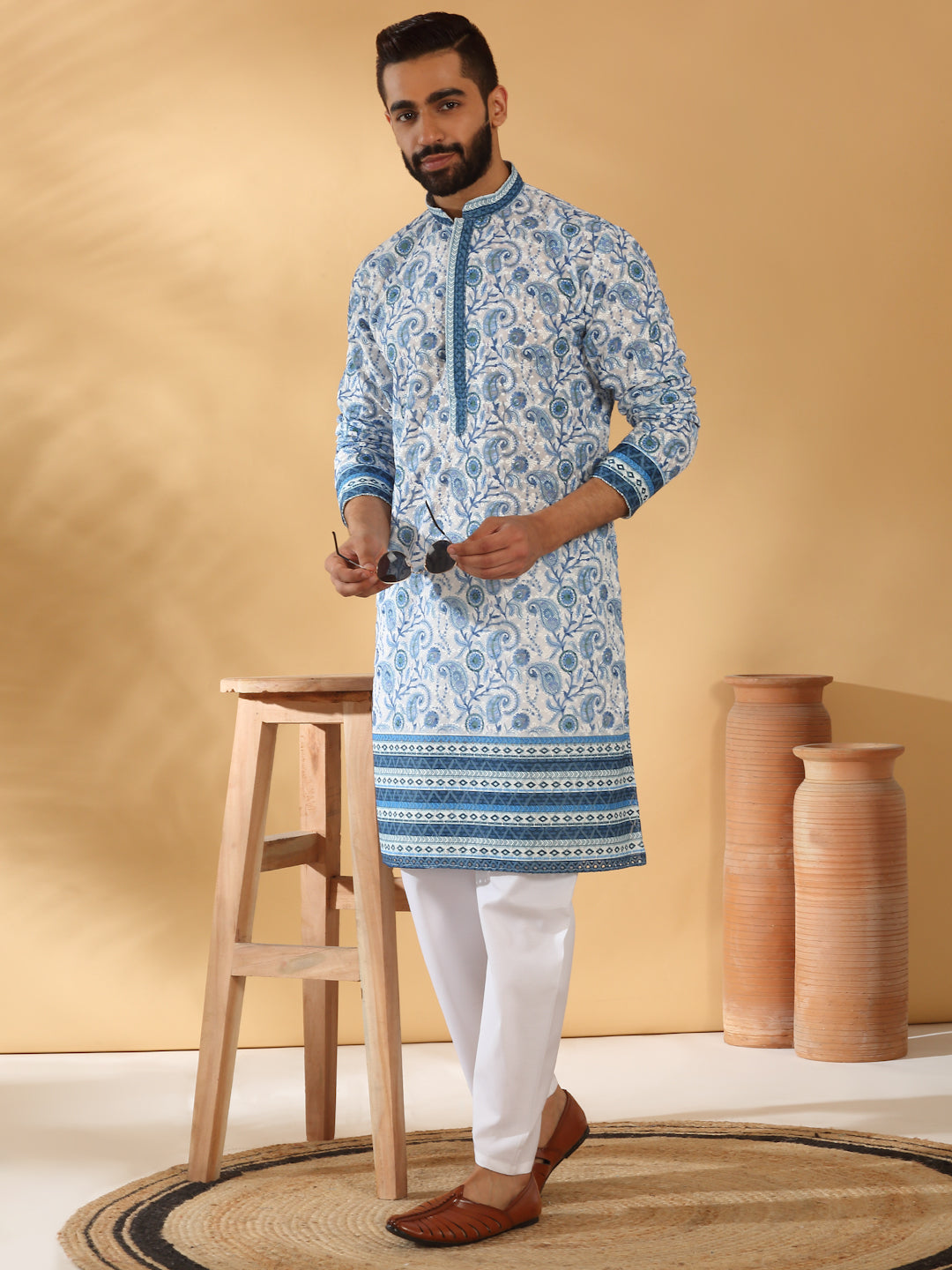 "Elevate your traditional wardrobe with this Men's Cotton Embroidered Sequin Chikan Floral Printed Thread Work Kurta and Pyjama Set, a perfect fusion of elegance and craftsmanship. Crafted from premium cotton, the kurta showcases intricate Chikan floral embroidery with delicate sequin embellishments and thread work, adding a refined yet subtle shimmer. The combination of floral prints and detailed embroidery creates a sophisticated and artistic appeal, making it ideal for festive occasions, cultural gatherings, and celebrations.