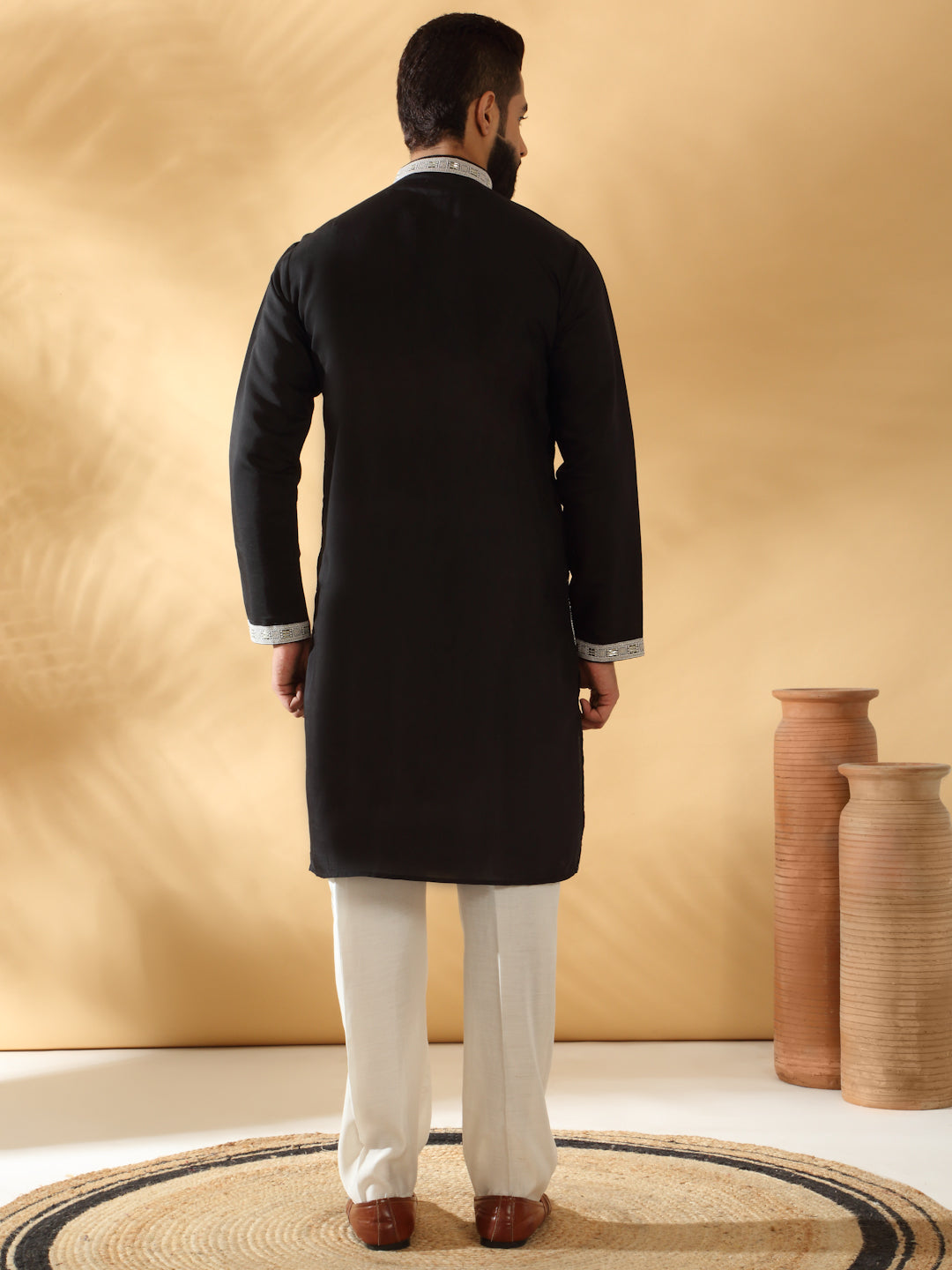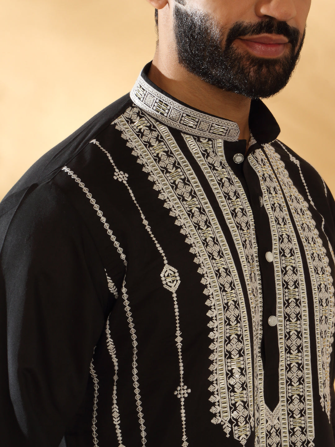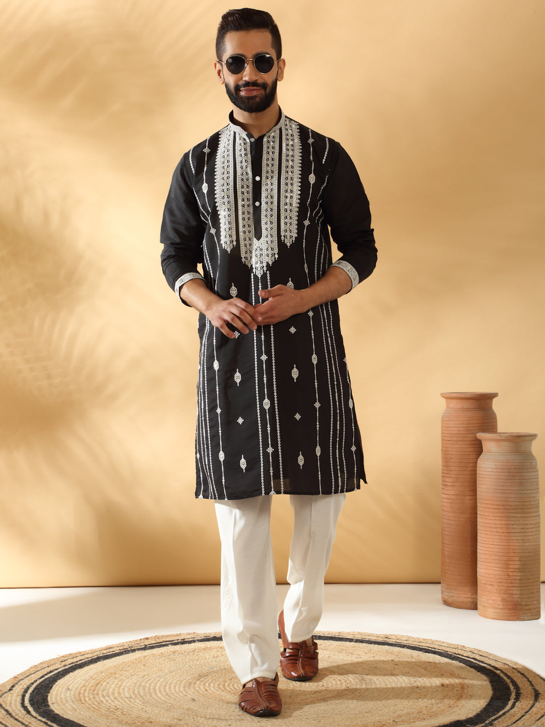 Elevate your traditional wardrobe with this elegant Men's Cotton Silk Kurta and Trouser Pant Set. The black kurta features intricate beads work, zari embroidery, and sequin detailing, adding a touch of regal charm. Paired with a cream cotton silk trouser pant, this ensemble blends comfort with sophistication, making it perfect for festive occasions, weddings, and cultural celebrations.