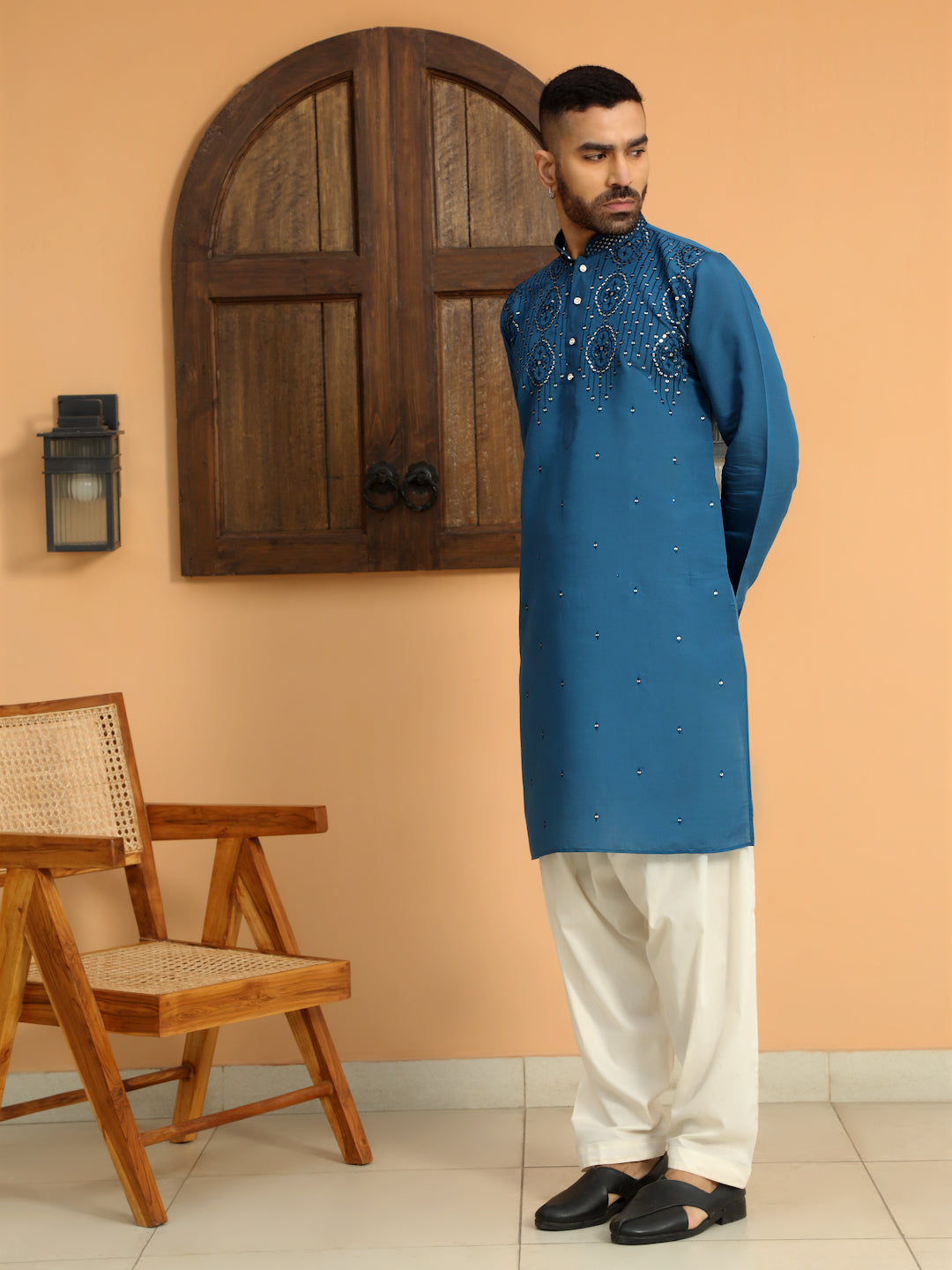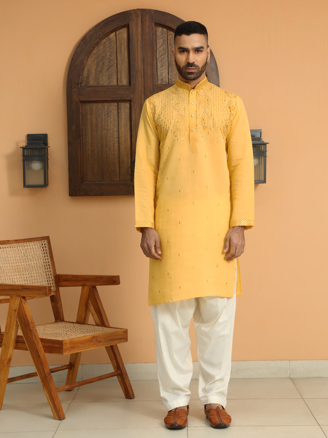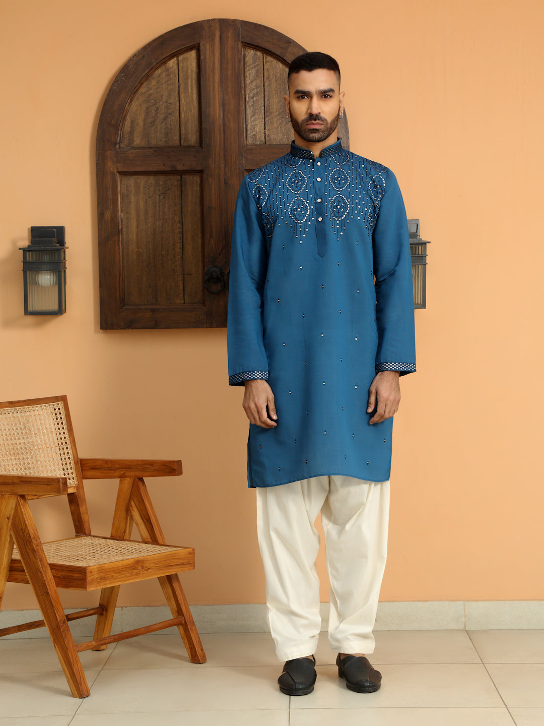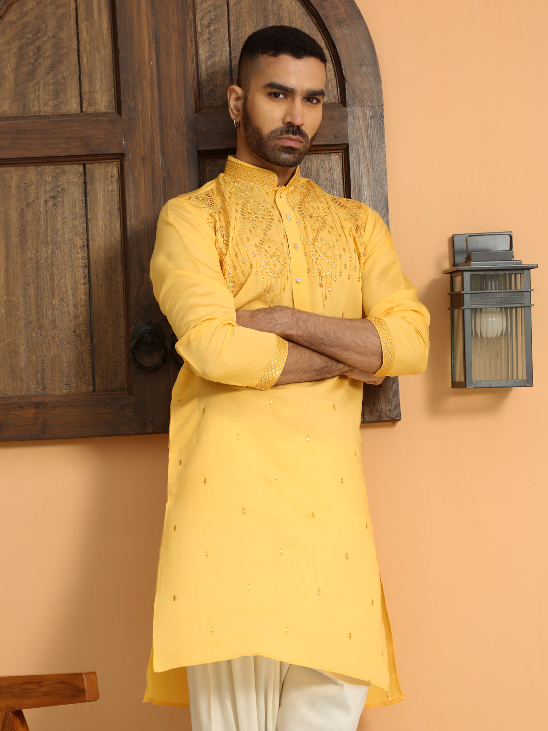 Upgrade your ethnic wardrobe with this premium Men's Cotton Silk Kurta from KRAFT INDIA LUXE. Designed for comfort and style, this kurta is perfect for festive occasions, weddings, and cultural events. Crafted from a cotton silk blend for a lightweight, soft, and breathable feel. Detailed with intricate embroidery and subtle sequins work, adding a sophisticated sparkle to your look. Straight knee-length design with a straight hem, offering a timeless and flattering fit. Equipped with side pockets for added convenience without compromising style. Features a button-closure mandarin collar for a sleek and refined appearance. Enhance your festive style with the KRAFT INDIA LUXE Cotton Silk Embroidered Kurta—where tradition meets luxury.