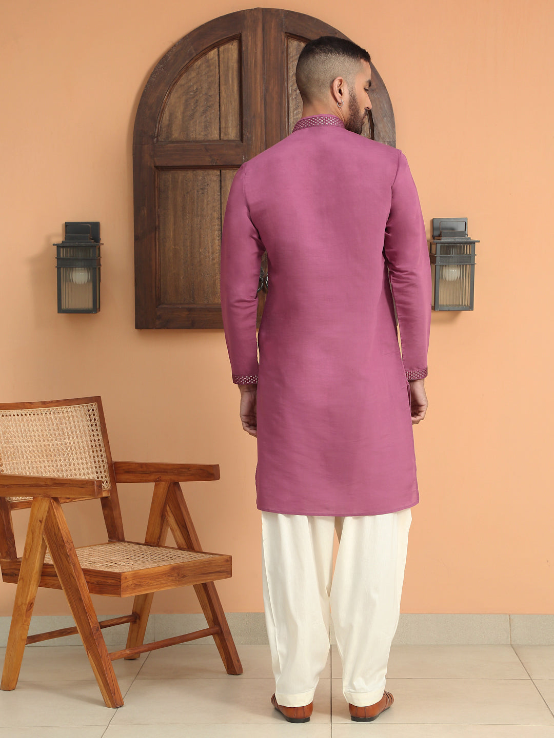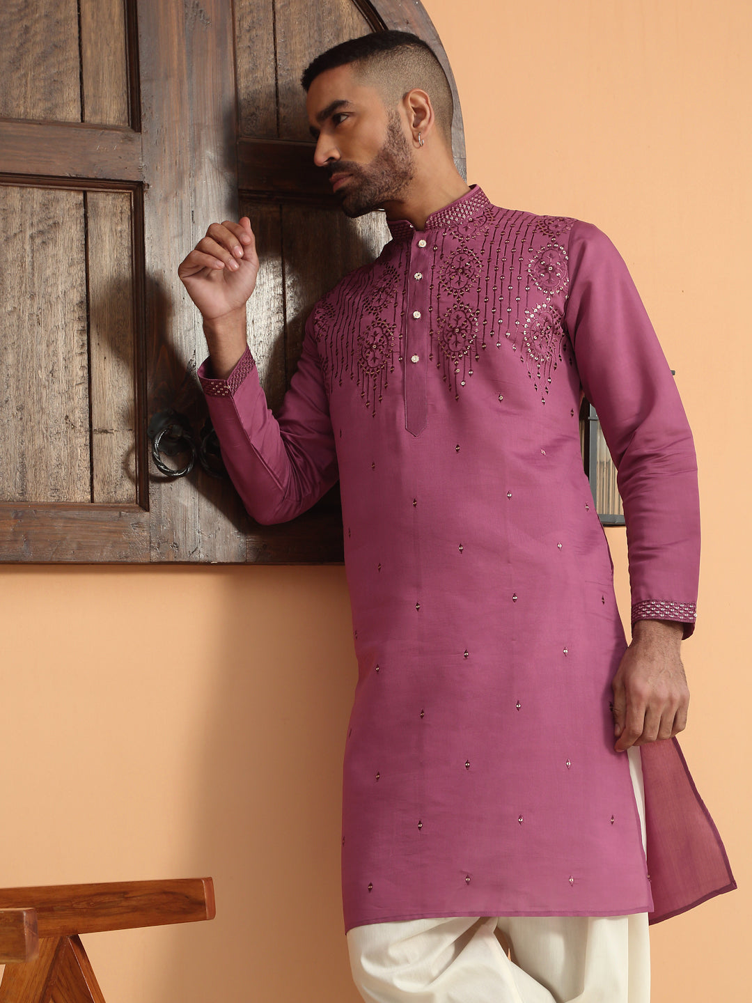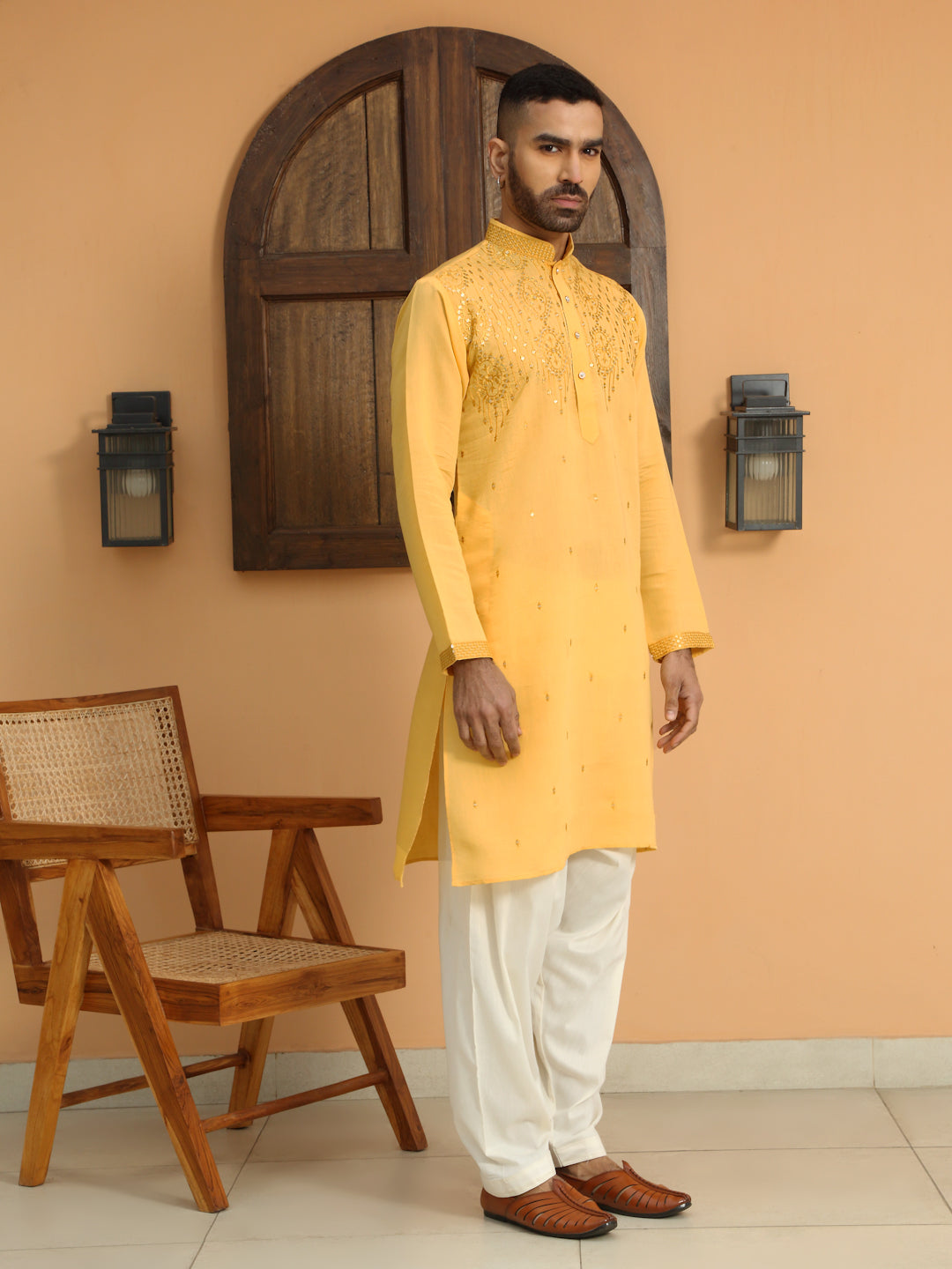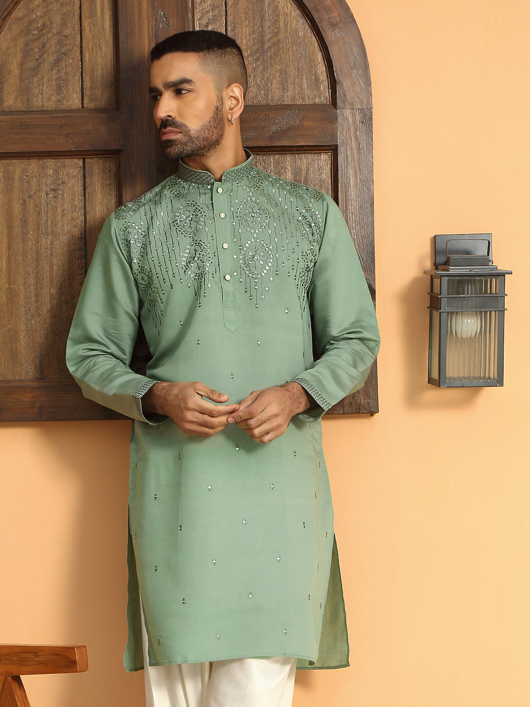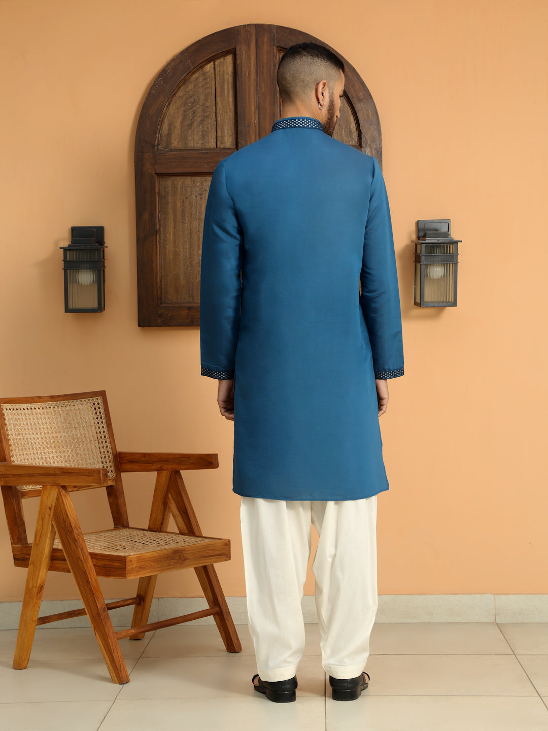 Upgrade your ethnic wardrobe with this premium Men's Cotton Silk Kurta from KRAFT INDIA LUXE. Designed for comfort and style, this kurta is perfect for festive occasions, weddings, and cultural events. Crafted from a cotton silk blend for a lightweight, soft, and breathable feel. Detailed with intricate embroidery and subtle sequins work, adding a sophisticated sparkle to your look. Straight knee-length design with a straight hem, offering a timeless and flattering fit. Equipped with side pockets for added convenience without compromising style. Features a button-closure mandarin collar for a sleek and refined appearance. Enhance your festive style with the KRAFT INDIA LUXE Cotton Silk Embroidered Kurta—where tradition meets luxury.