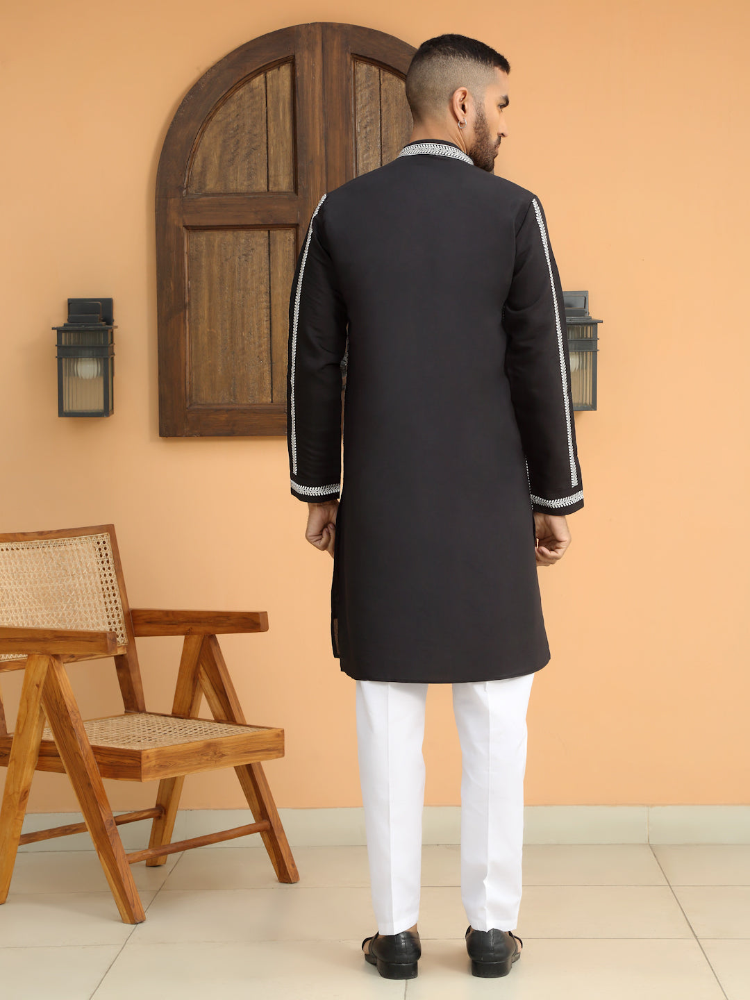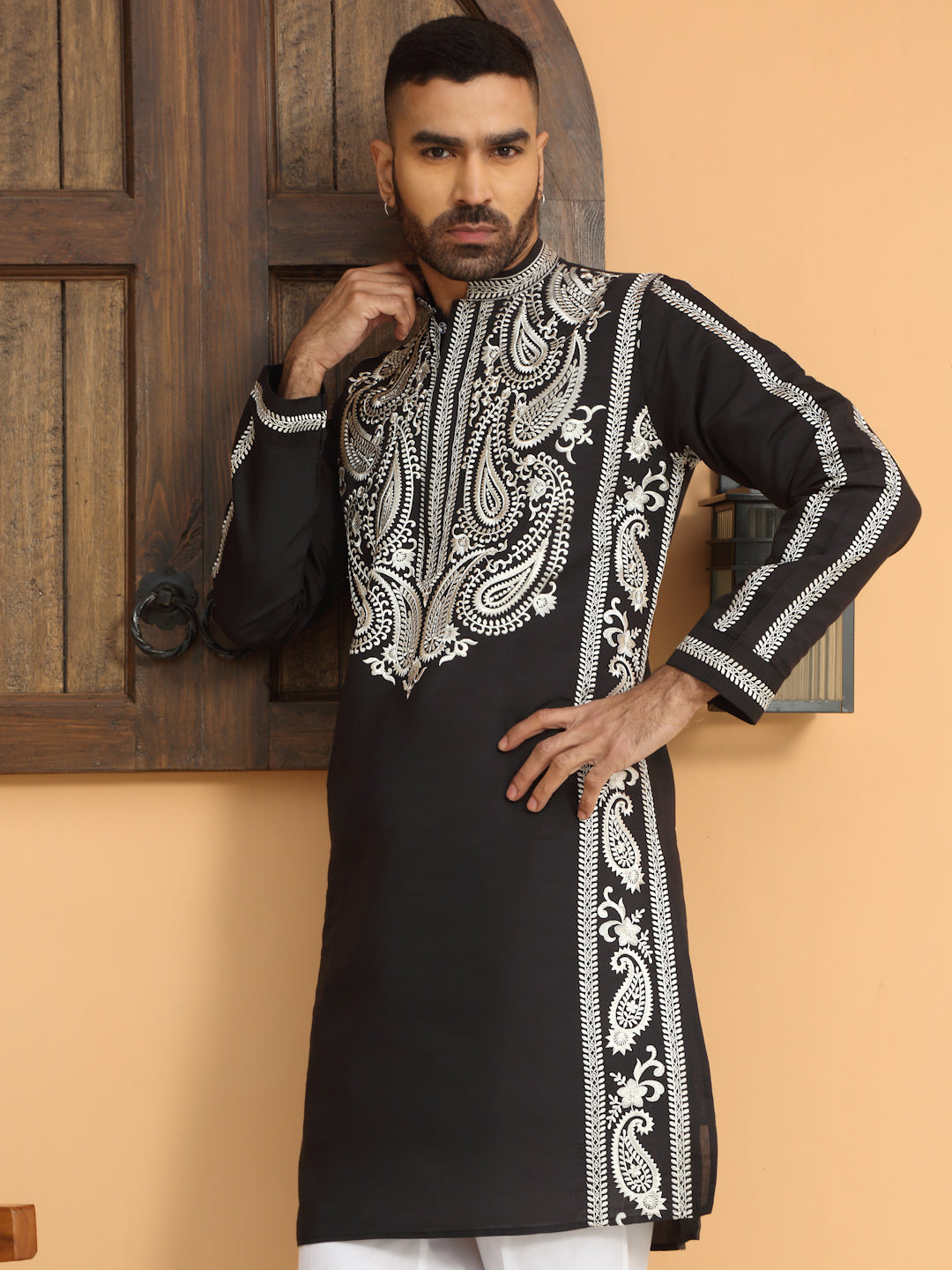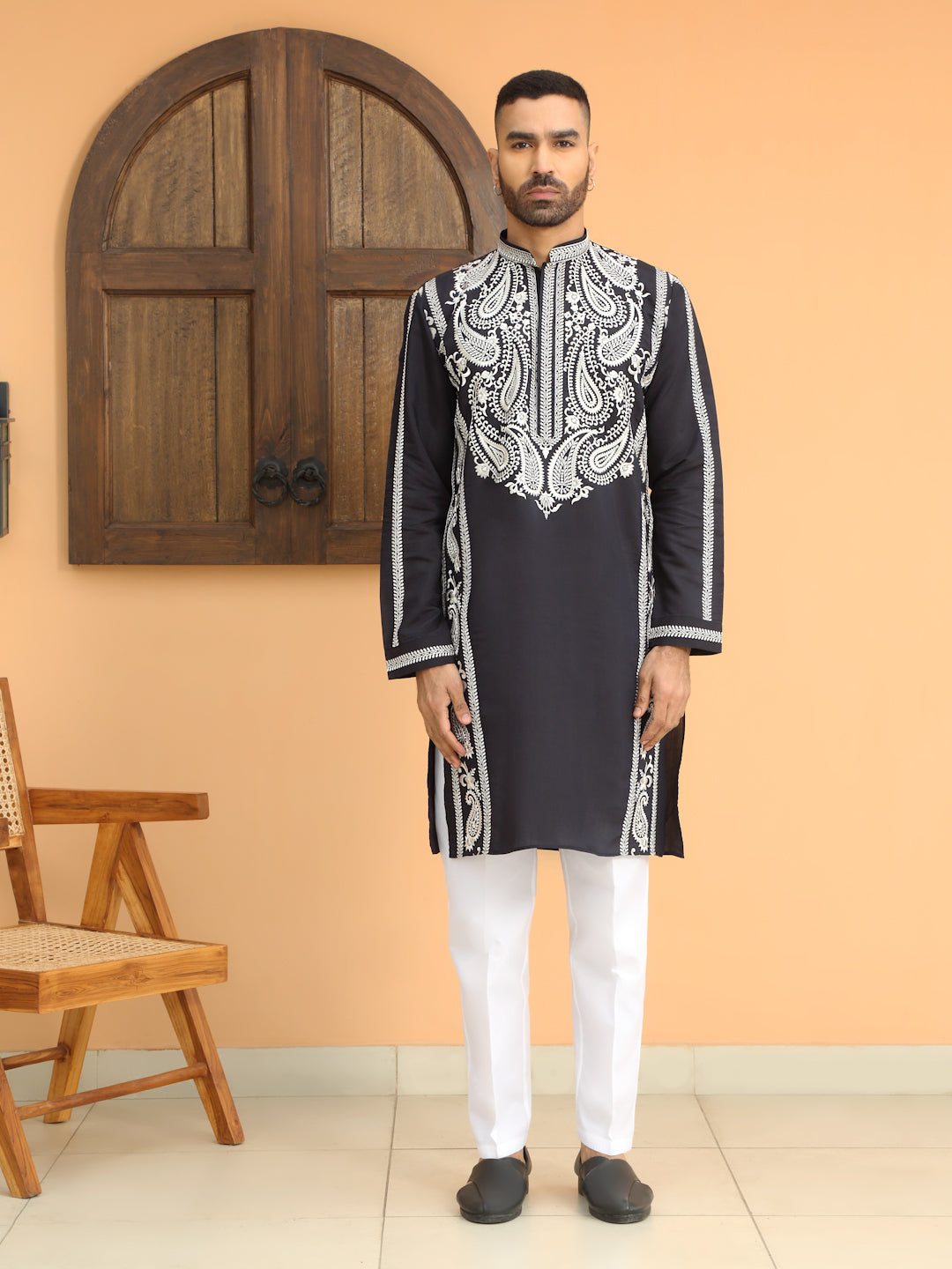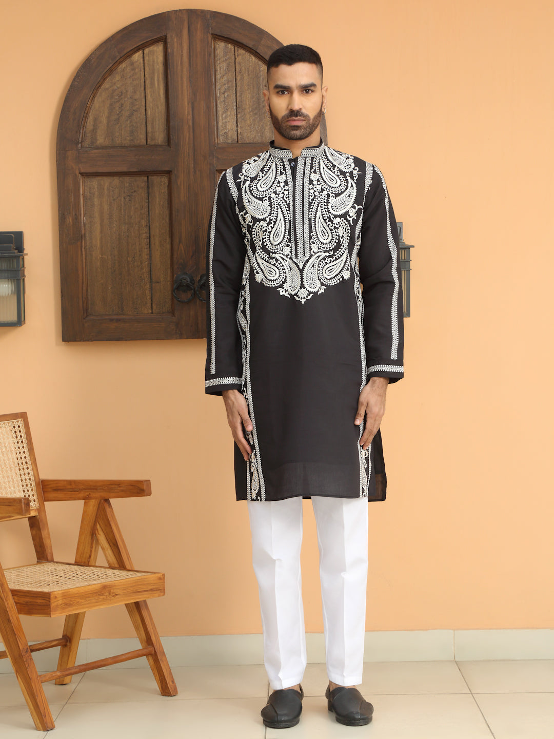 Upgrade your ethnic style with the KRAFT INDIA LUXE elegant cotton silk kurta featuring intricate paisley embroidery. Designed with a mandarin collar, button-down closure, side pockets, and a straight hem, this knee-length kurta offers a sleek yet traditional look. Paired with comfortable cotton trousers, this outfit is perfect for festive occasions, weddings, and cultural events. Style meets comfort in this refined ensemble!